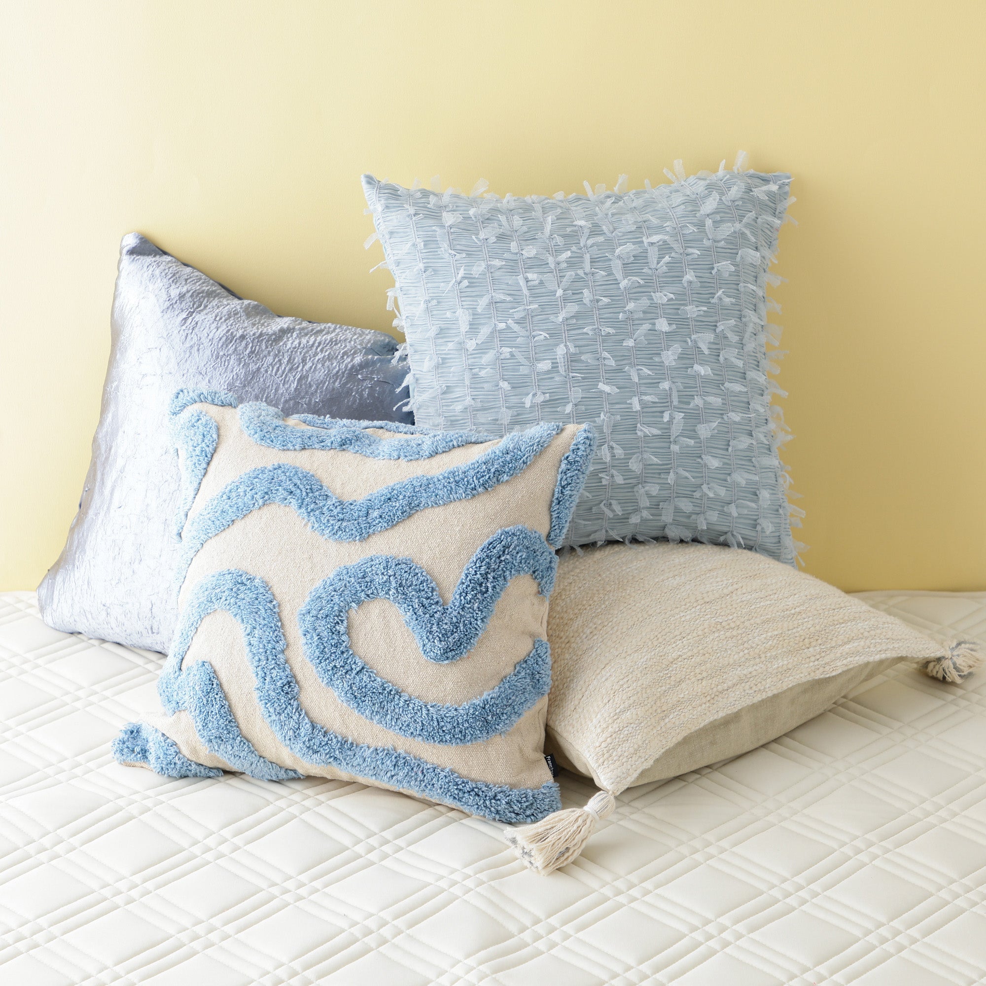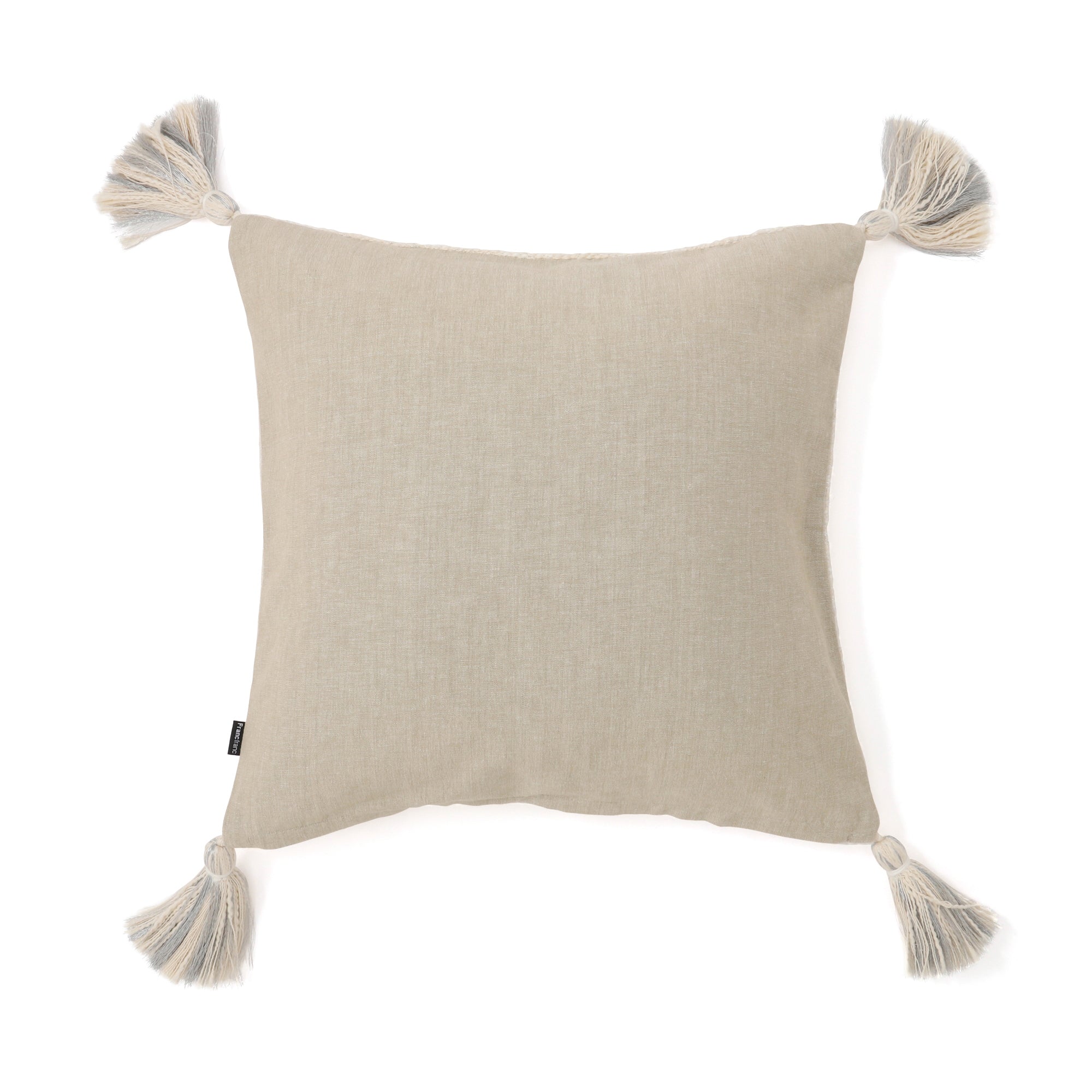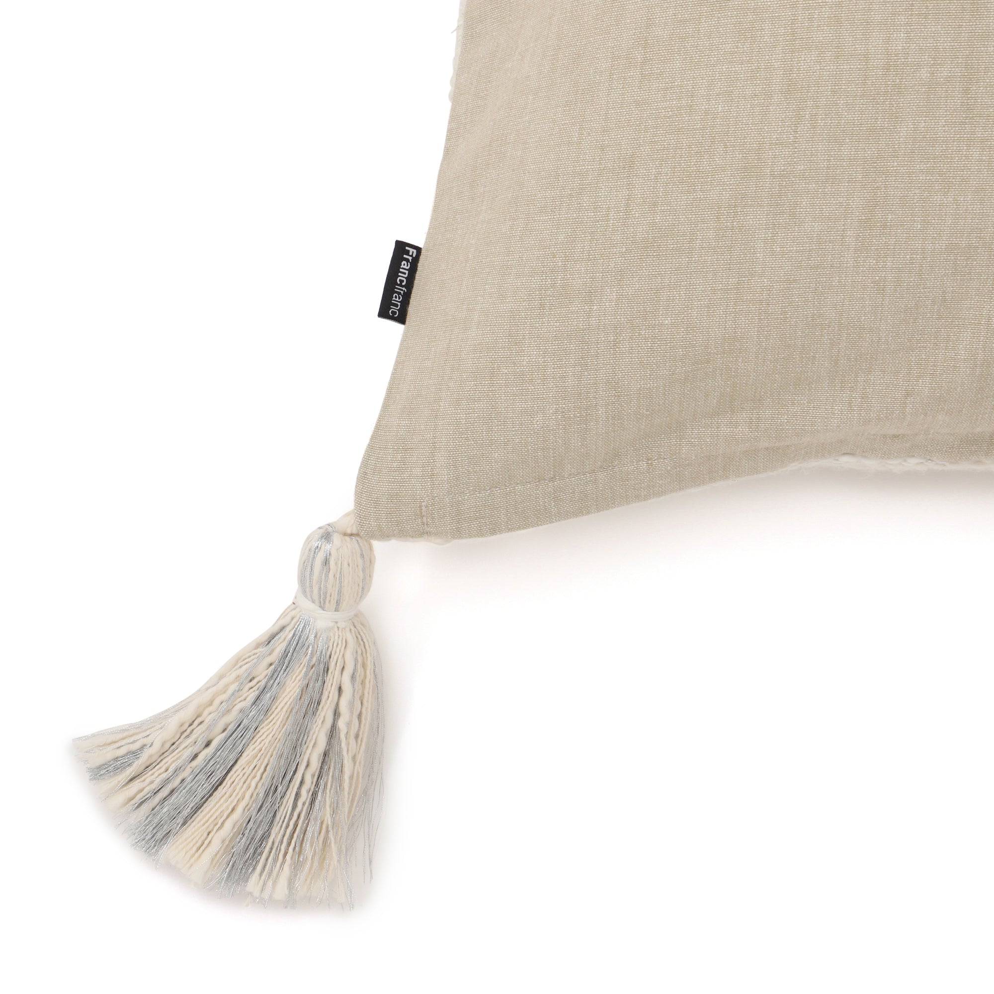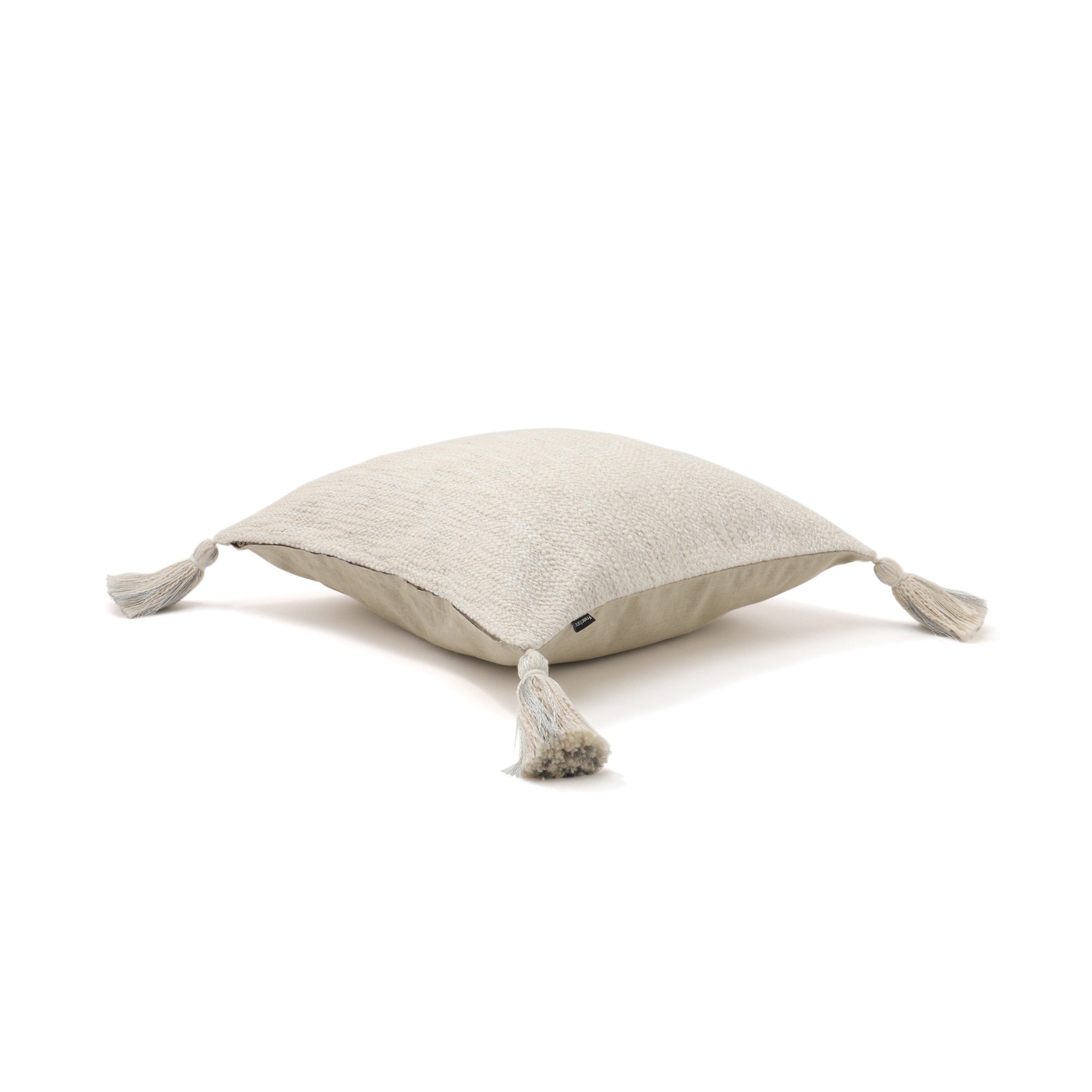 スラブ糸とメタリック糸を使用して織り上げたテクスチャー感のあるクッションカバーです。メタリック糸を使用した大ぶりのタッセルがデザインのポイントとなっています。