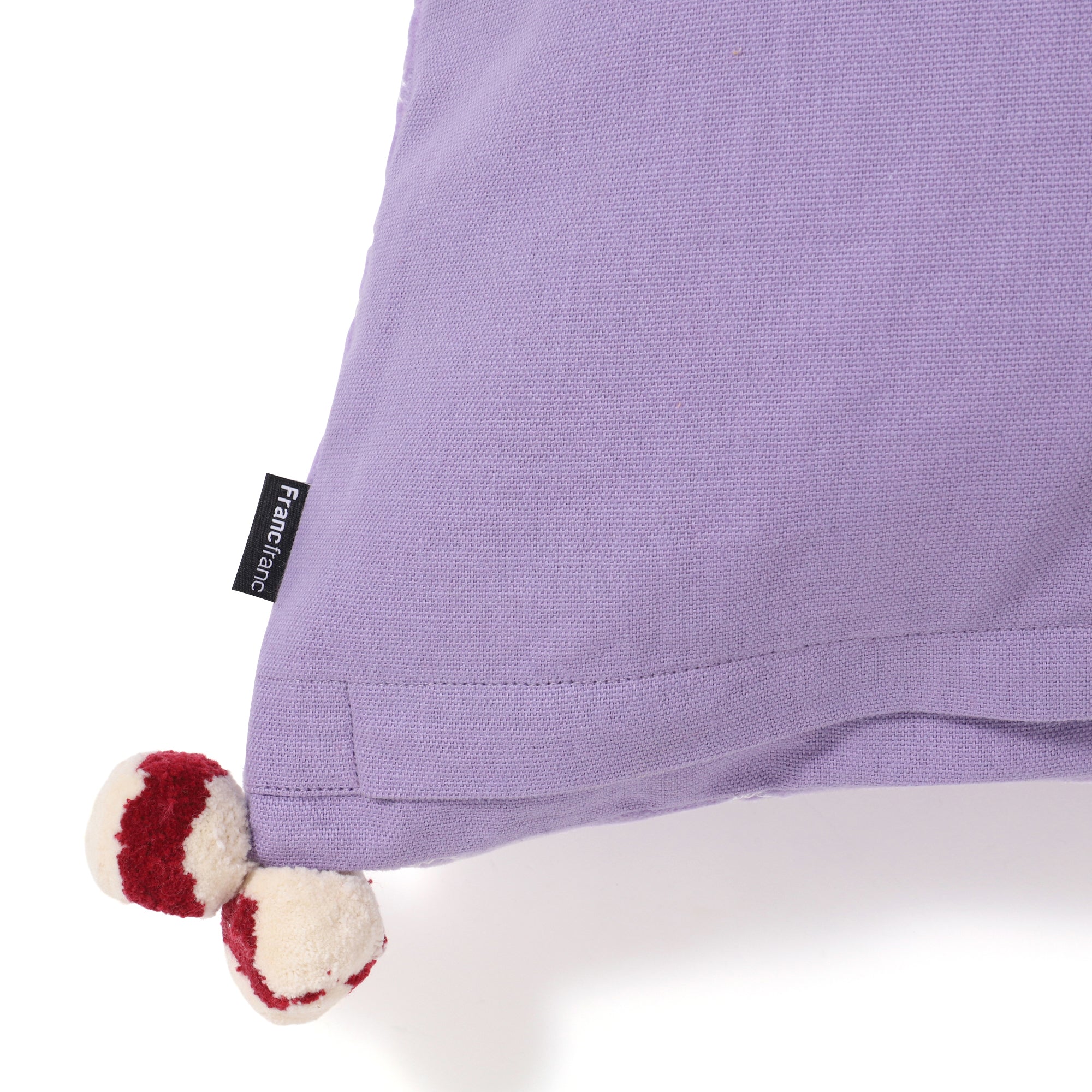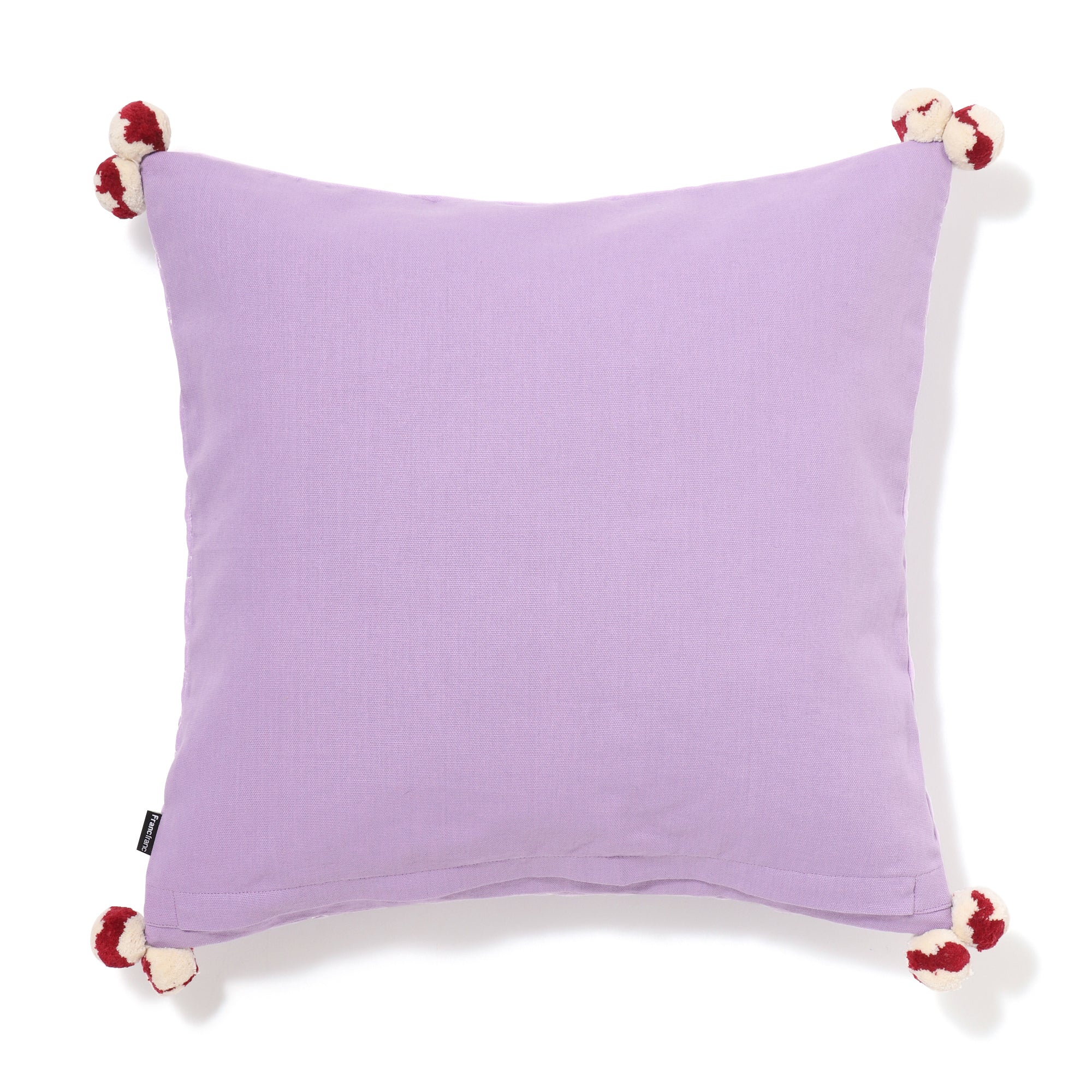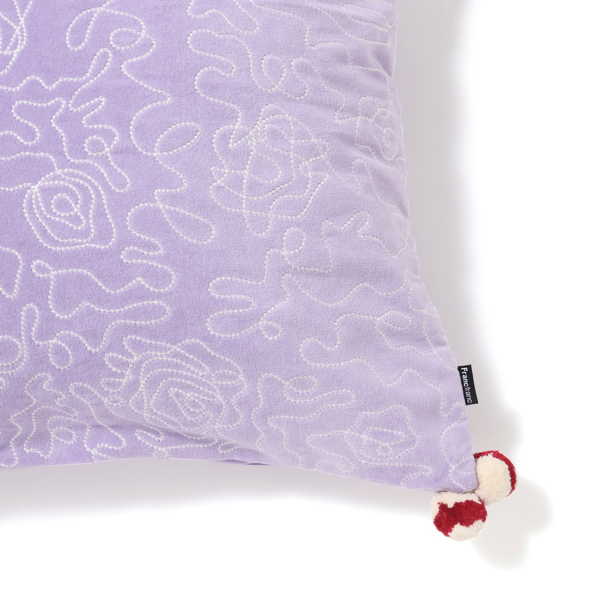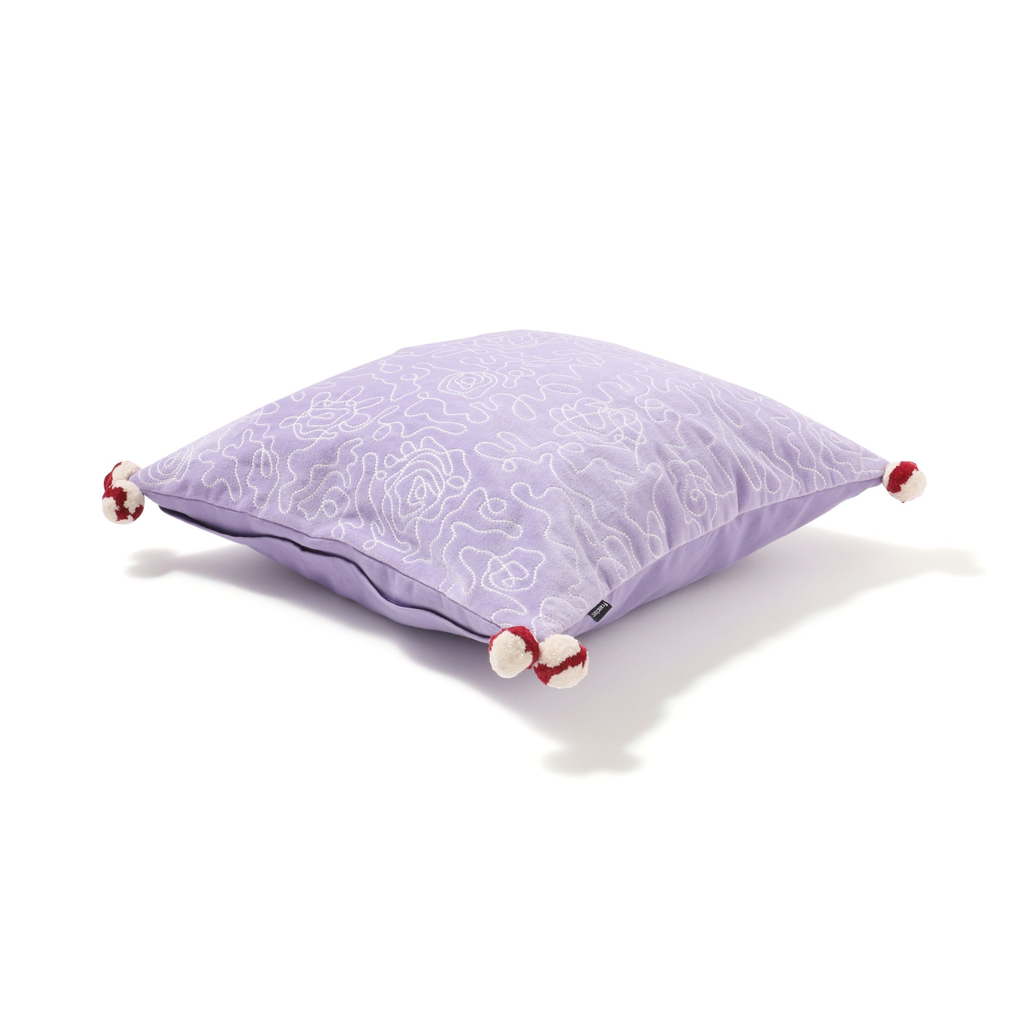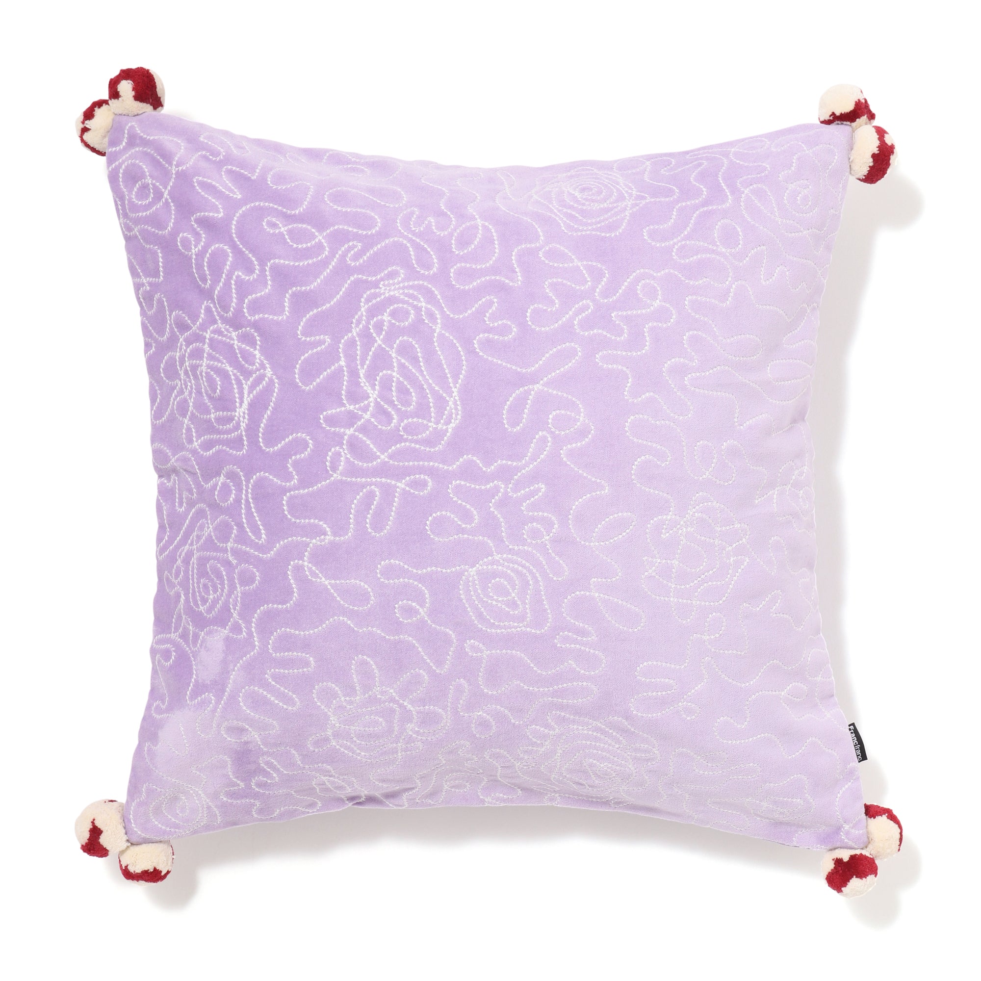 自由で有機的なラインを刺繍で表現したデザインのクッションカバーです。ベルベット生地に施された刺繍が立体感を生み出し、デザインに奥行きを与えています。刺繍の動きが空間に自然で柔らかなリズムを加え、豊かな表情を作り出します。さらに、四隅に施されたポンポンがアクセントとなり、デザイン全体に遊び心と個性をプラスします。