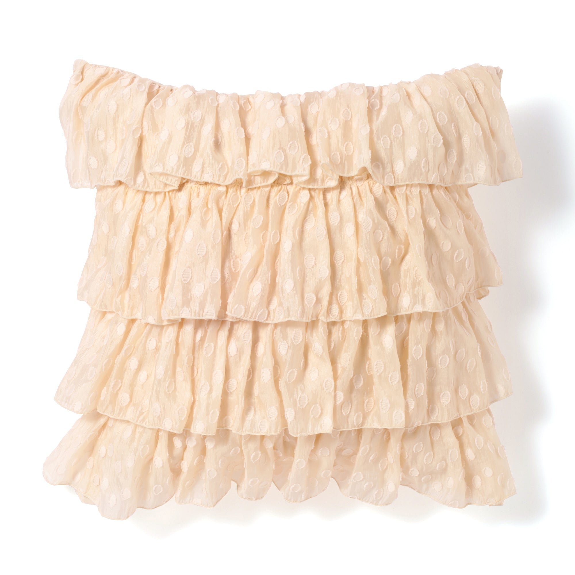 ツヤ感のあるジャガード生地でドット柄を表現したクッションカバーです。段状に重ねたフリルが、軽やかさとかわいらしさを兼ね備えたデザインです。