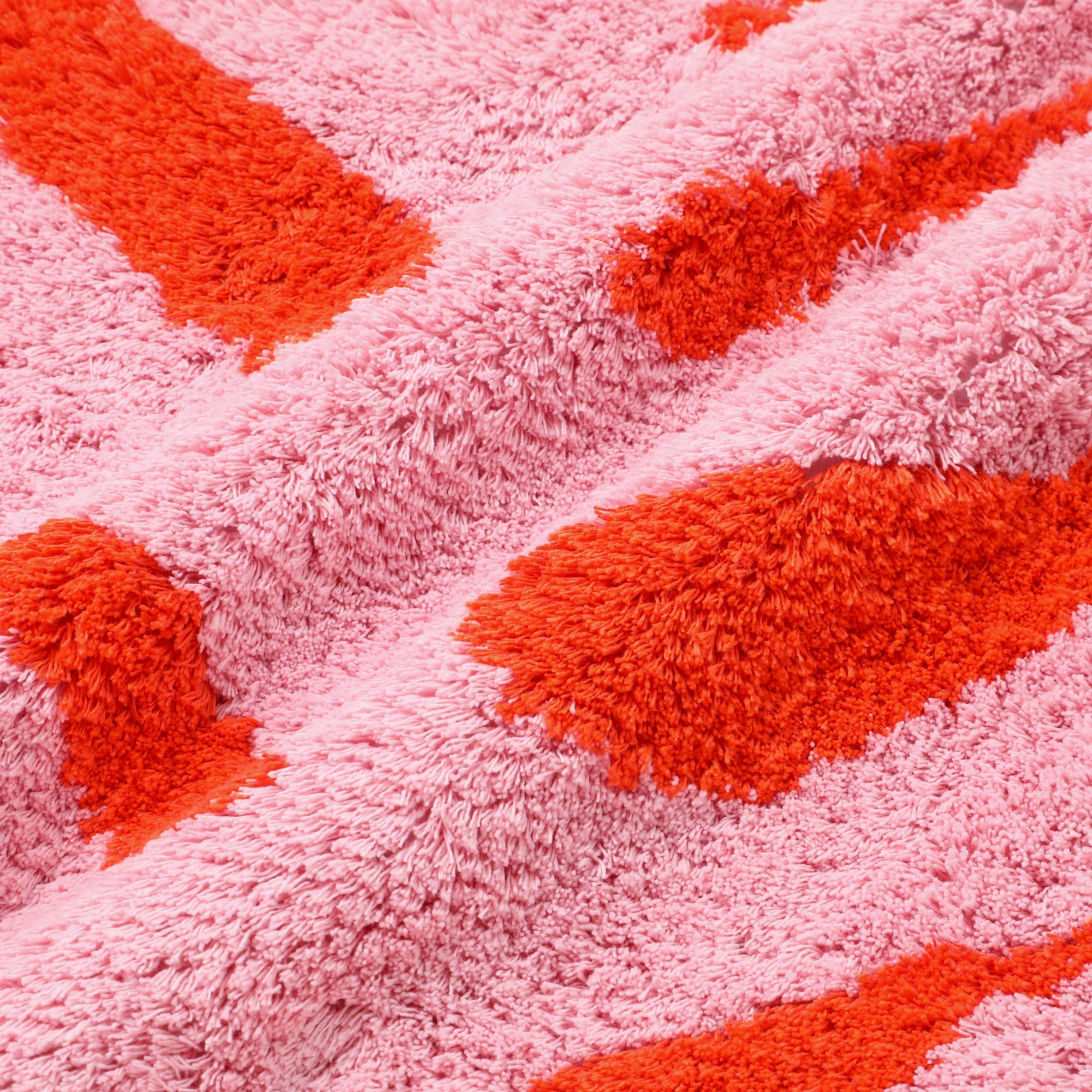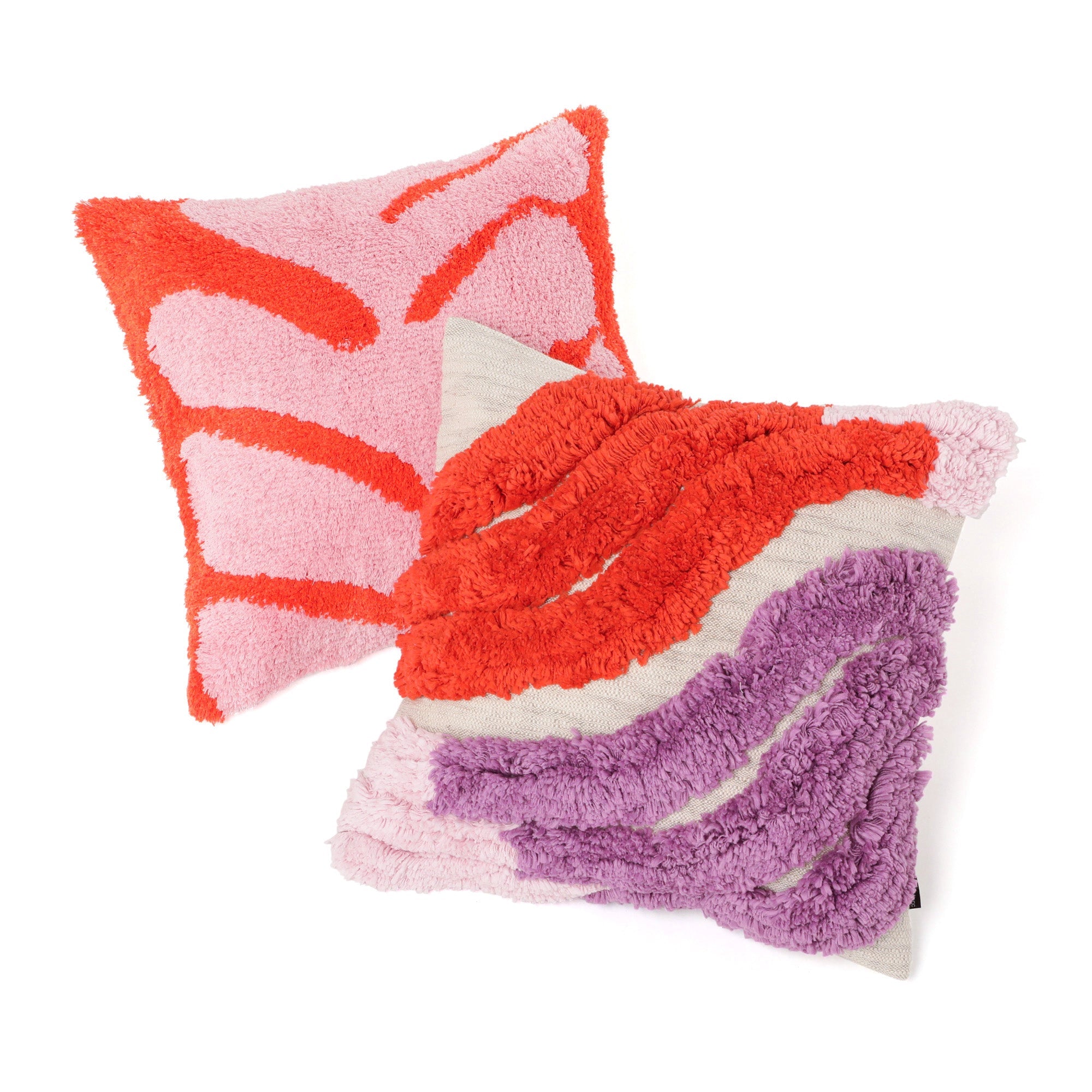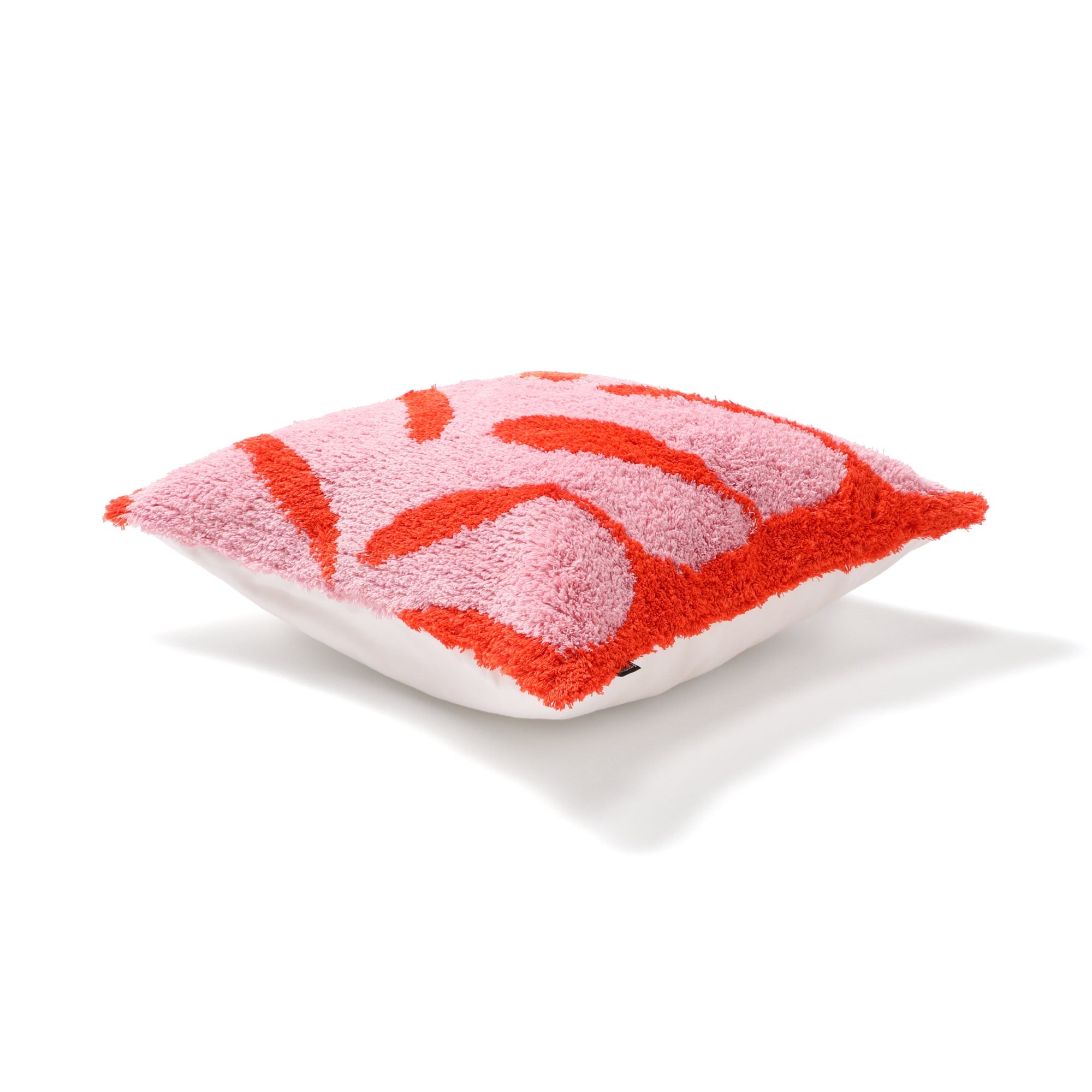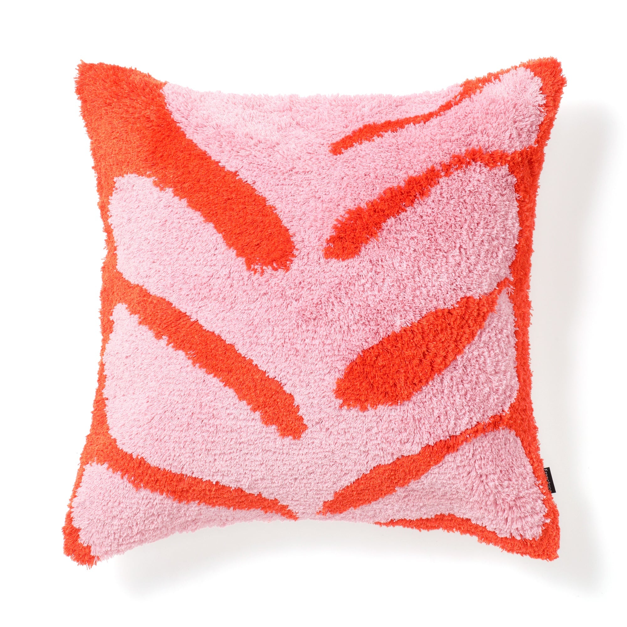大胆で有機的な柄をタフトで表現した、アートのようなデザインのクッションカバーです。ピンクとオレンジの鮮やかな配色が、お部屋に華やかさを添えます。