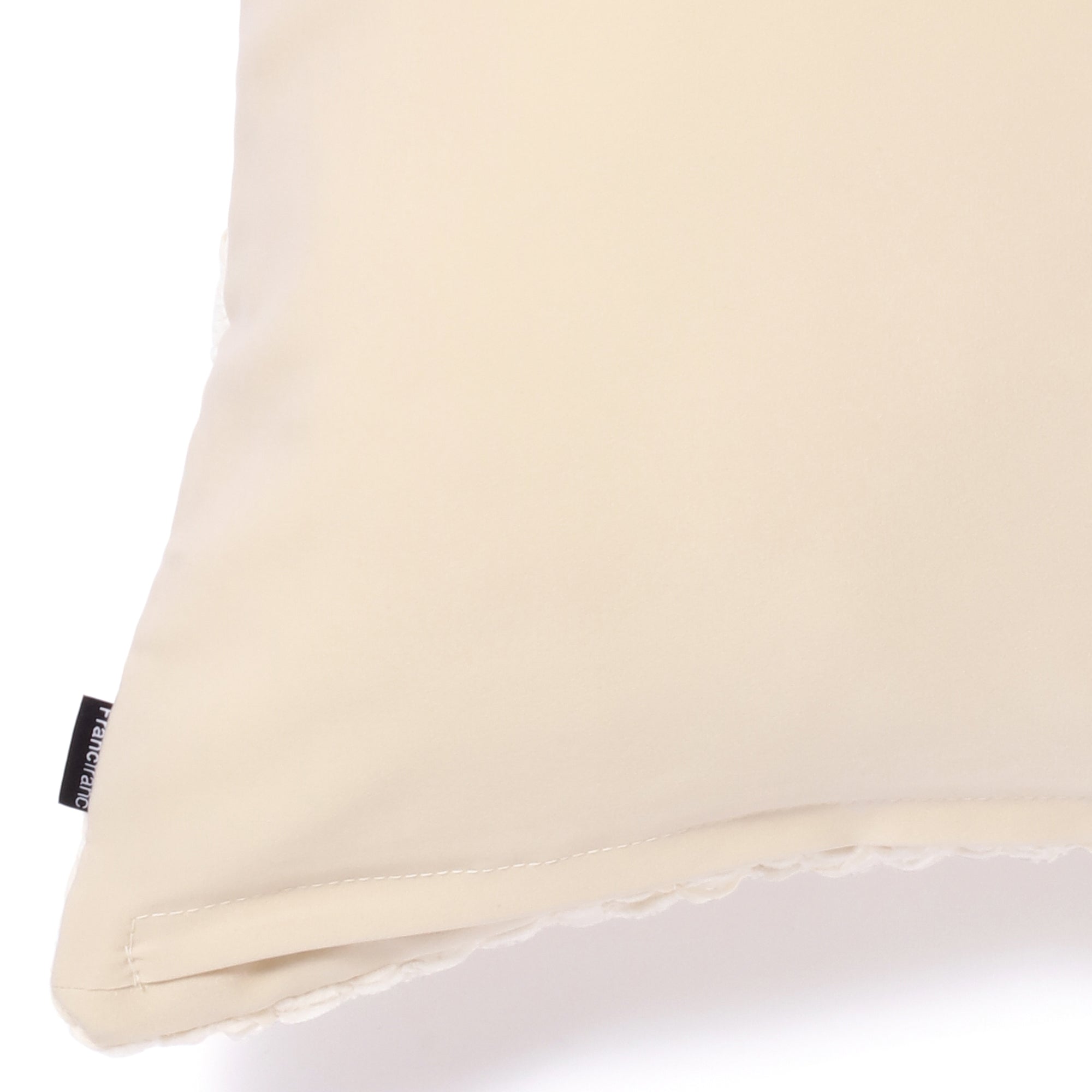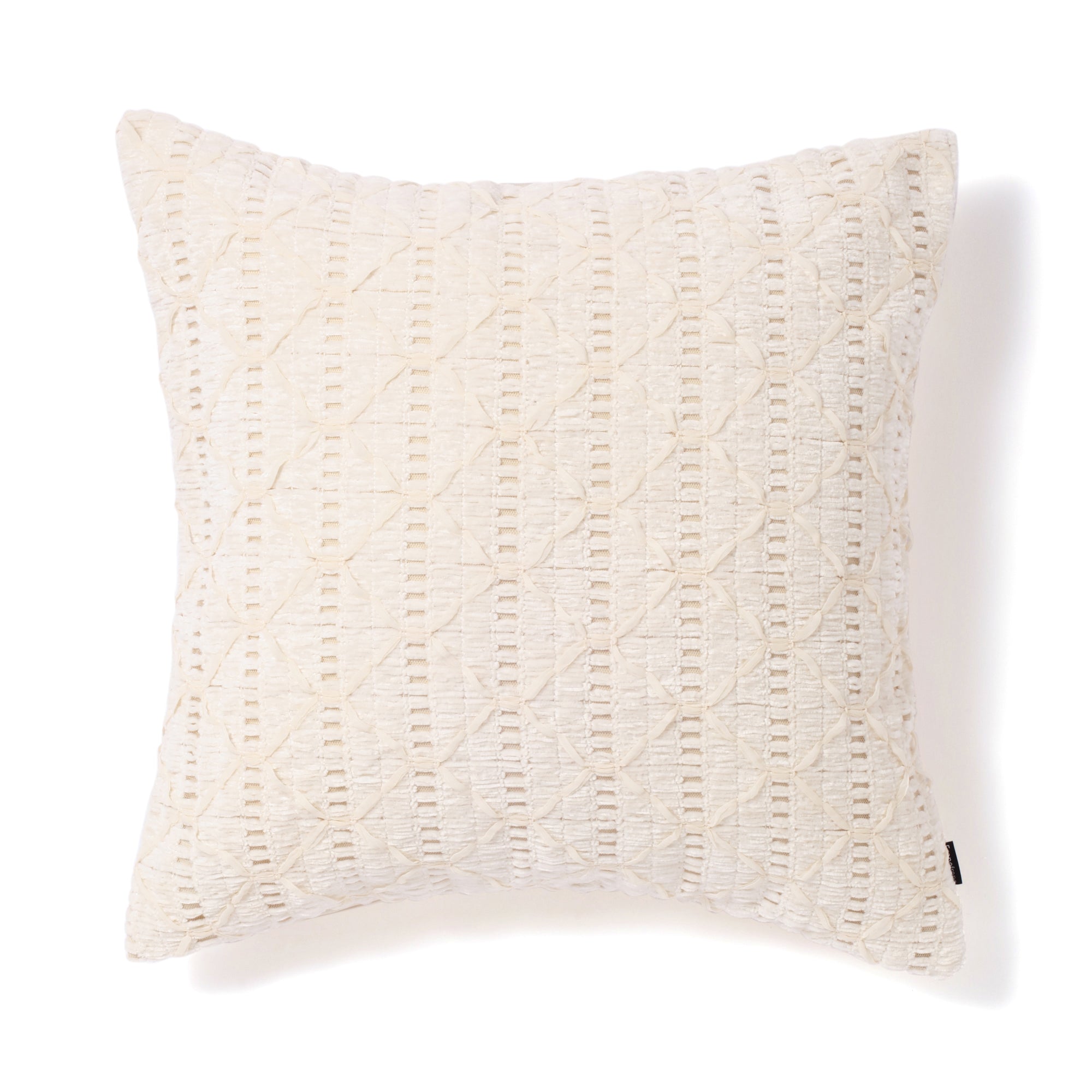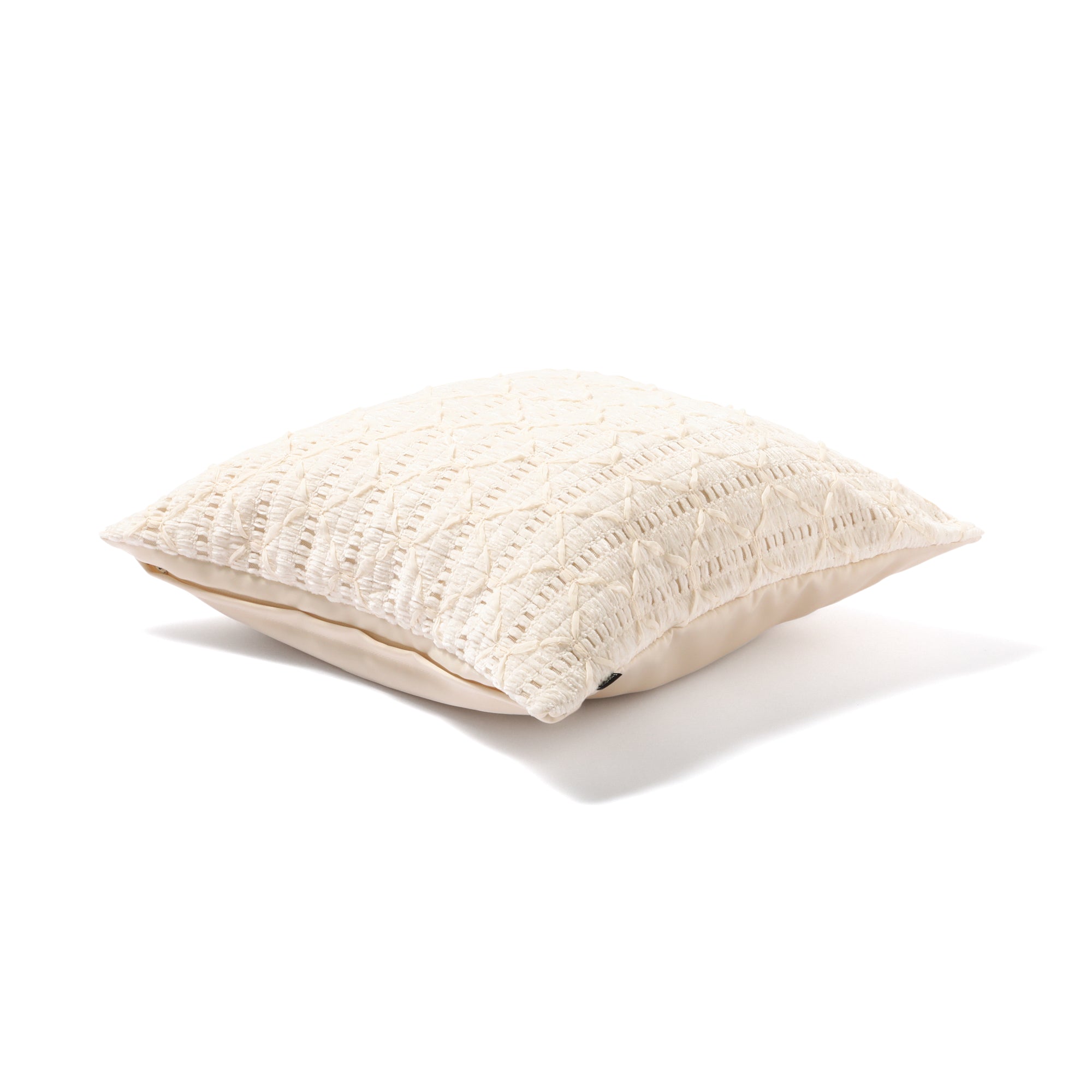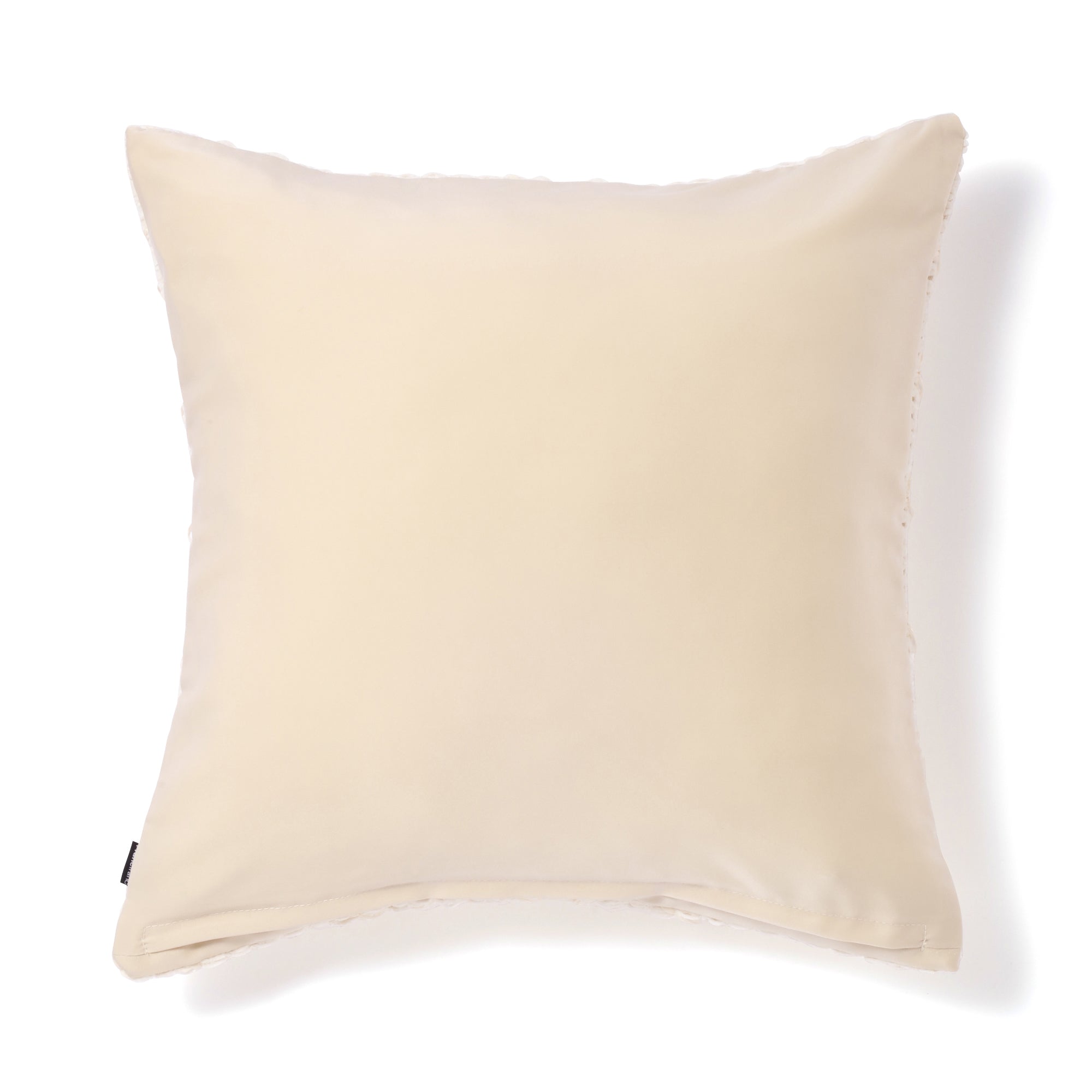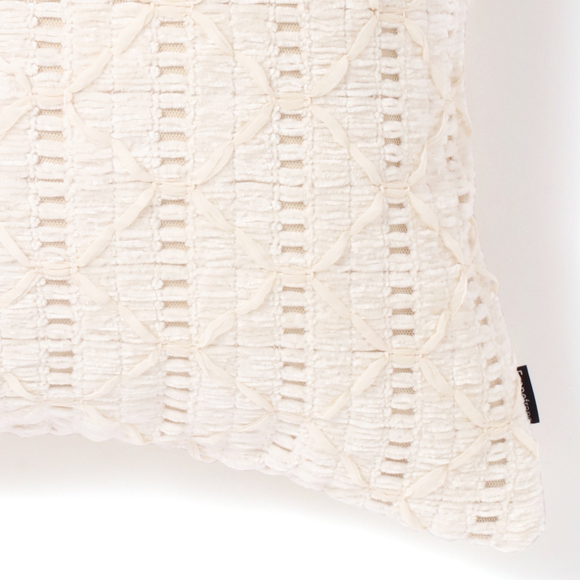 モール糸とシフォンリボンを組み合わせて織り上げた、上品なデザインのクッションカバーです。白を基調に、素材感の違いが模様を引き立てる仕上がりになっています。