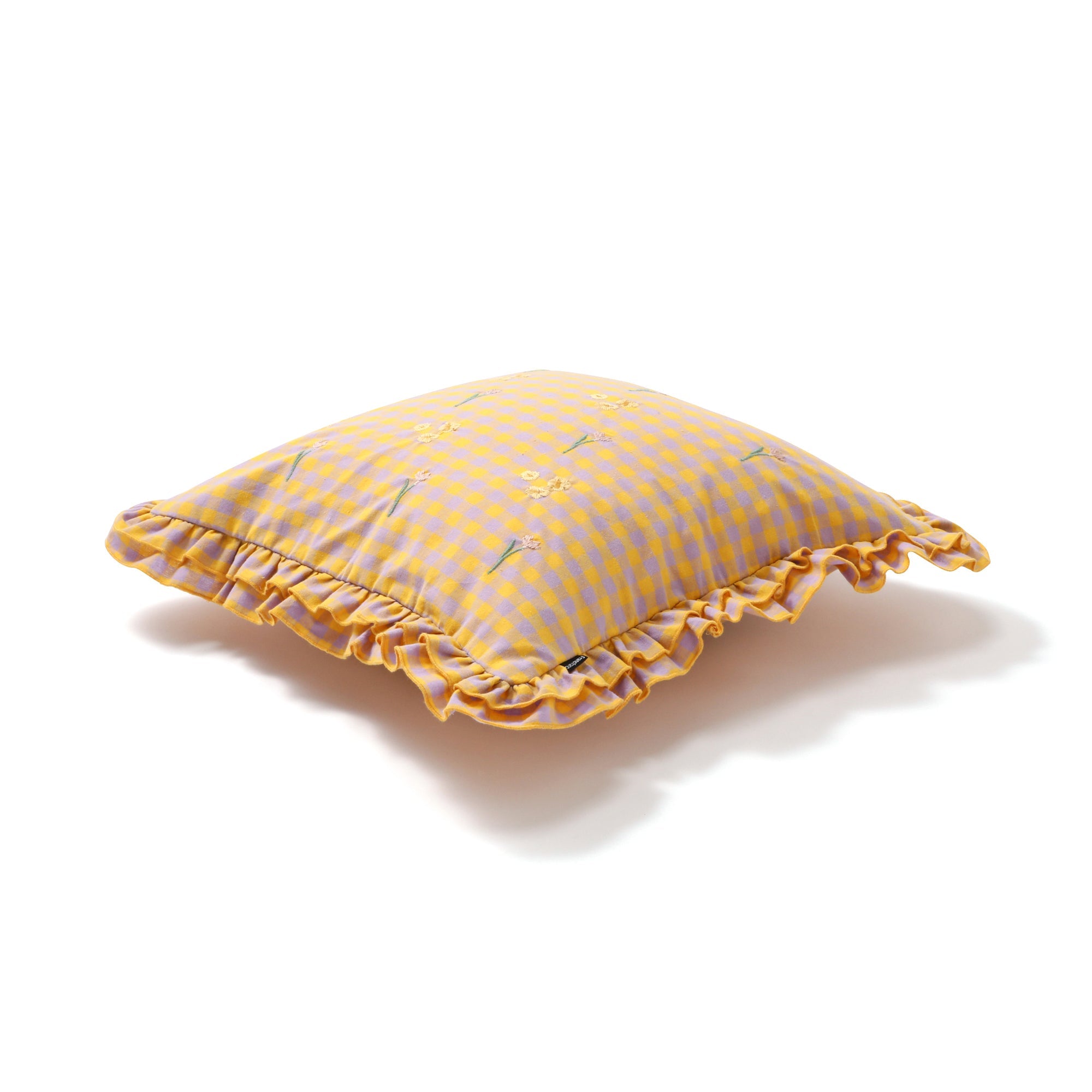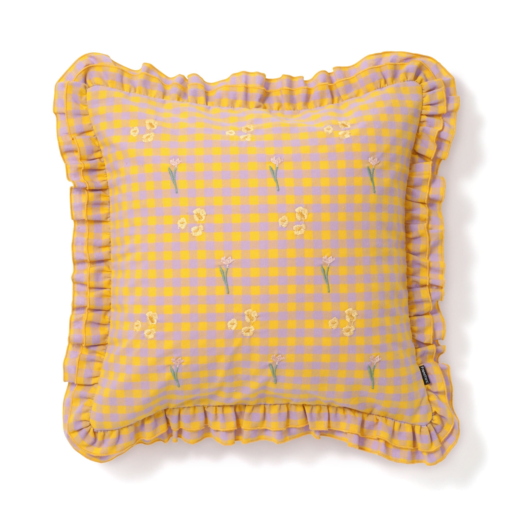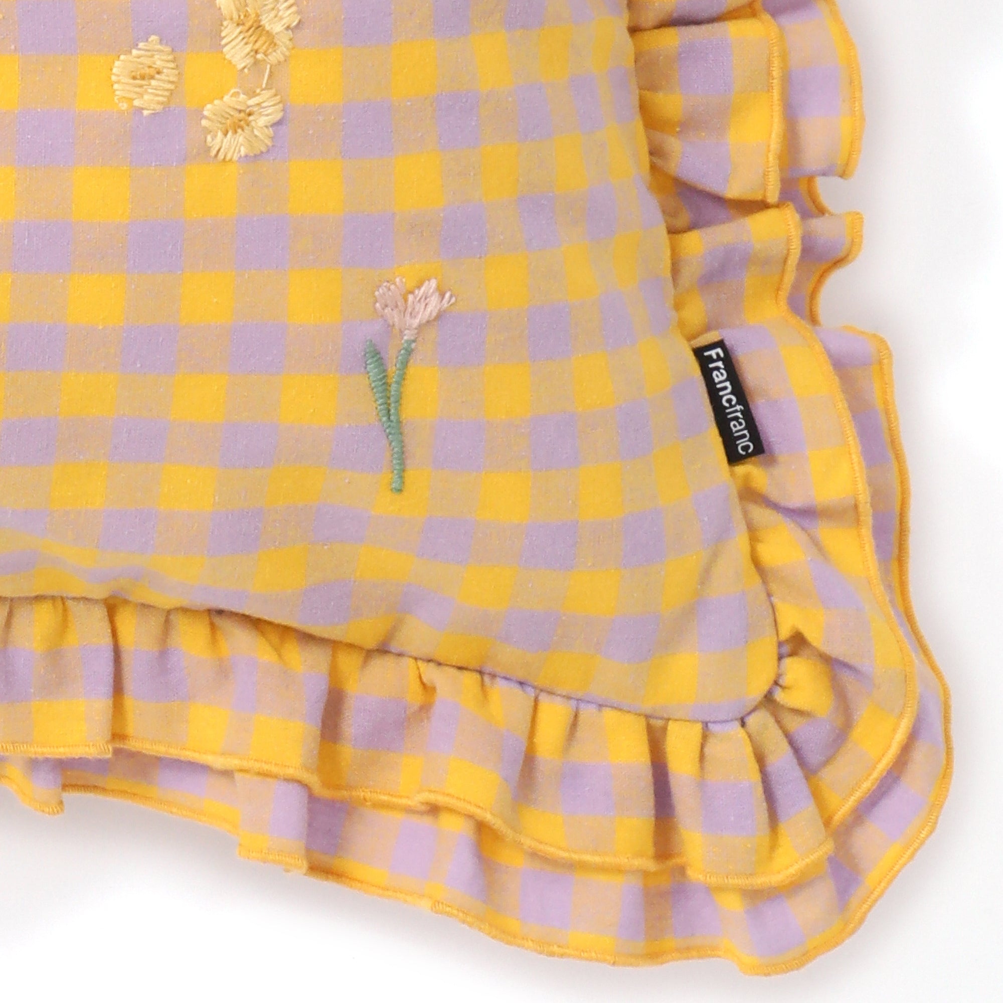 ギンガムチェックに花柄の刺繍を施した、可愛らしさと華やかさが融合したクッションカバーです。周囲にあしらわれたフリルが柔らかさを加え、イエローとパープルで表現されたギンガムチェックが甘さを抑えた洗練された印象を与えます。花柄刺繍の繊細なディテールが全体に温かみを加えつつも、程よいバランスで個性を引き立てるデザインです。