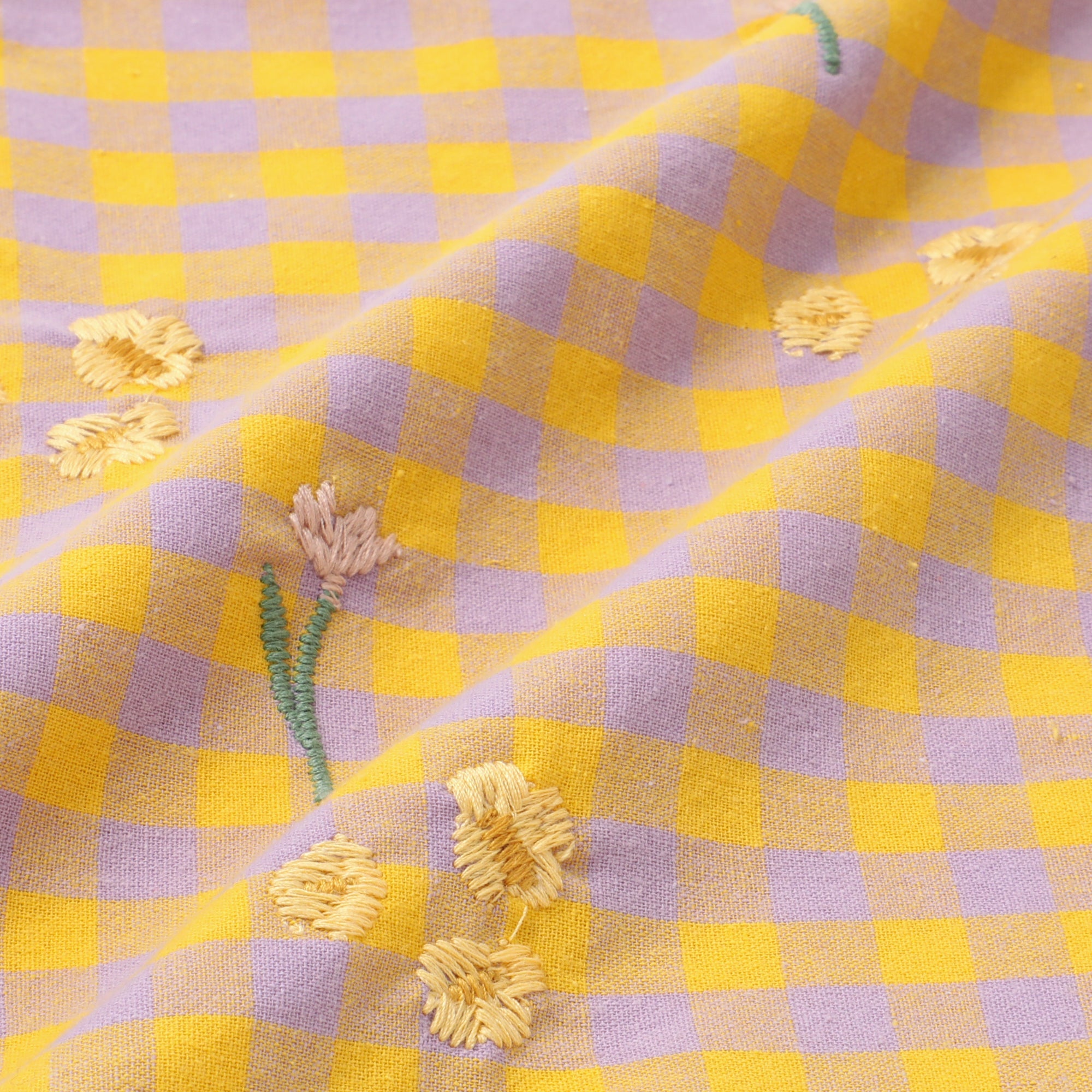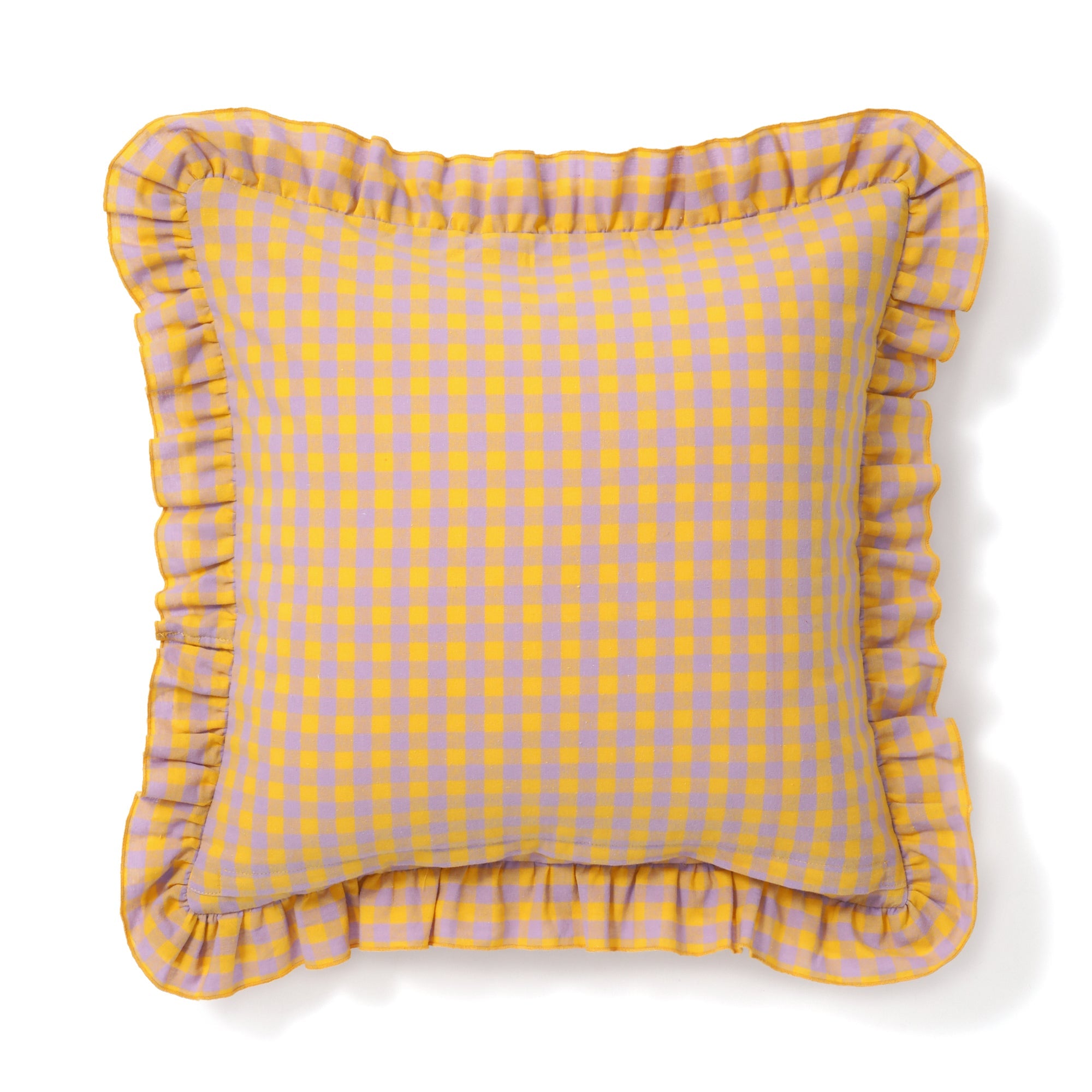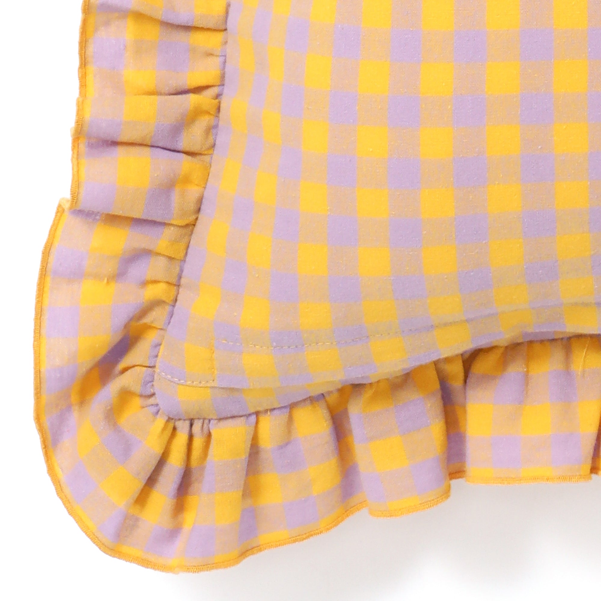 ギンガムチェックに花柄の刺繍を施した、可愛らしさと華やかさが融合したクッションカバーです。周囲にあしらわれたフリルが柔らかさを加え、イエローとパープルで表現されたギンガムチェックが甘さを抑えた洗練された印象を与えます。花柄刺繍の繊細なディテールが全体に温かみを加えつつも、程よいバランスで個性を引き立てるデザインです。
