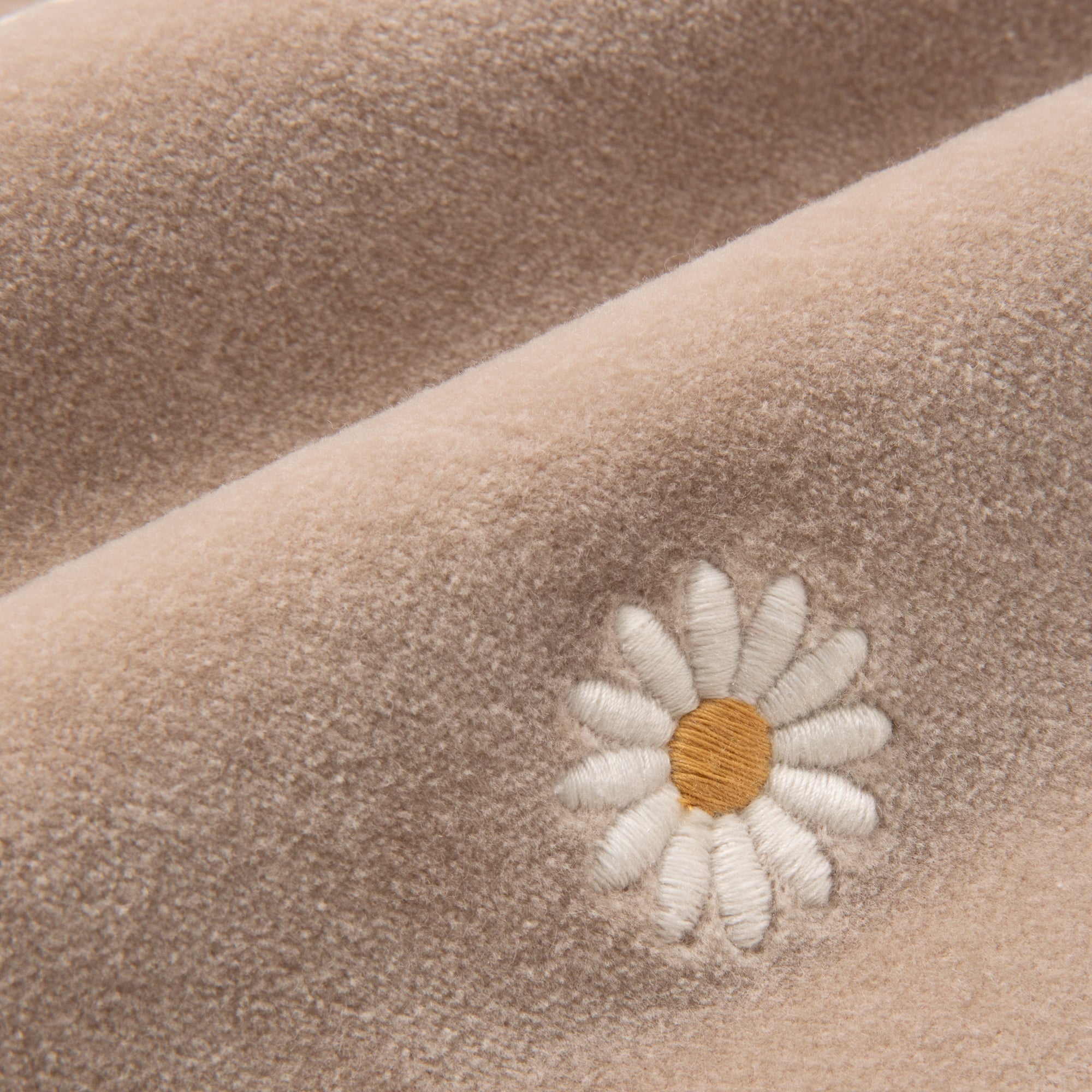 マットな質感のベルベット生地に、デイジーをモチーフにした刺繍を全面にあしらったクッションカバーです。グレーがかった落ち着いたベージュにデイジーの刺繍が映え、上品で大人っぽい雰囲気に仕上がっています。