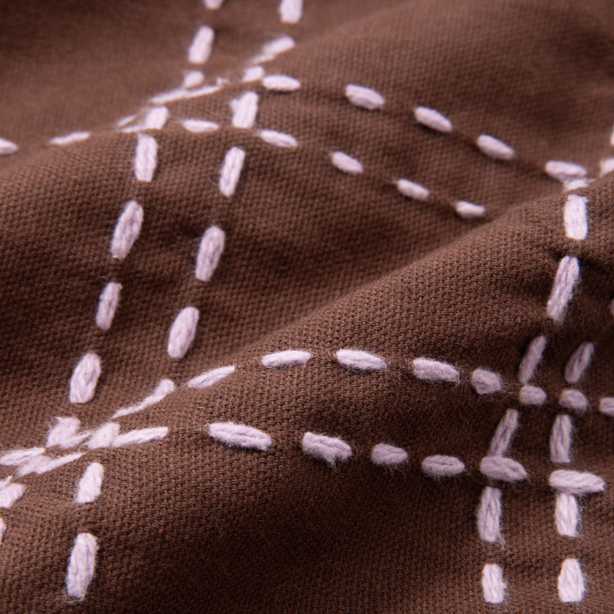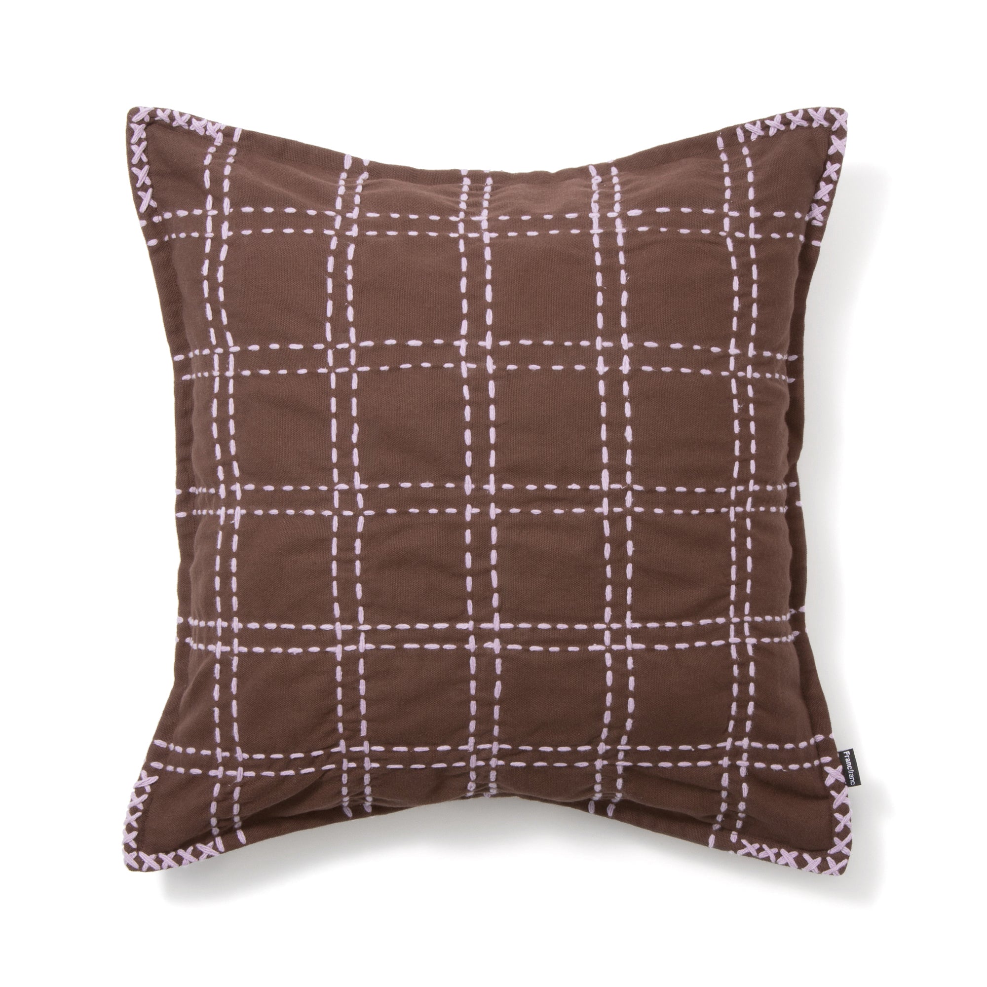 ハンドステッチでチェック柄を表現したクッションカバーです。手仕事ならではの有機的なラインがぬくもりを感じさせ、やさしい雰囲気を演出します。落ち着いたブラウンにミルキーなパープルを合わせることで、上品さと柔らかな個性が引き立つ仕上がりになっています。