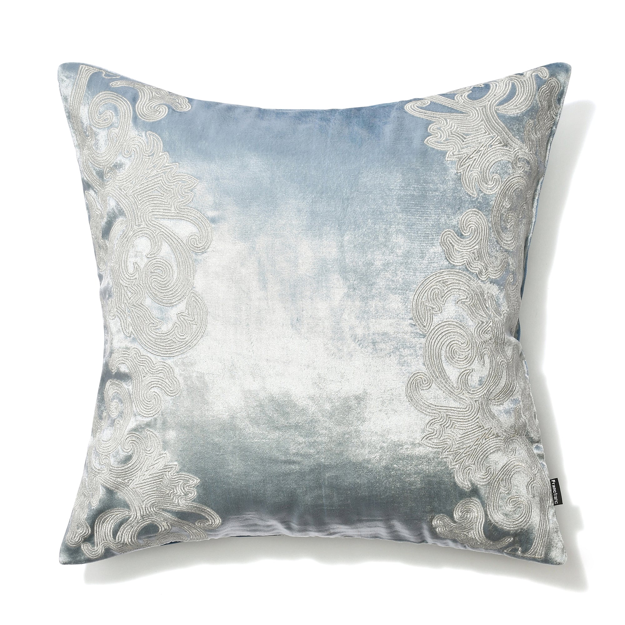 つやのあるベルベット生地に、つやのある糸で左右にオーナメント柄を施し、エレガントな印象に仕上げたクッションカバーです。生地の質感と程よく施された刺繍が絶妙に調和し、上品でありながらも取り入れやすいデザインとなっています。