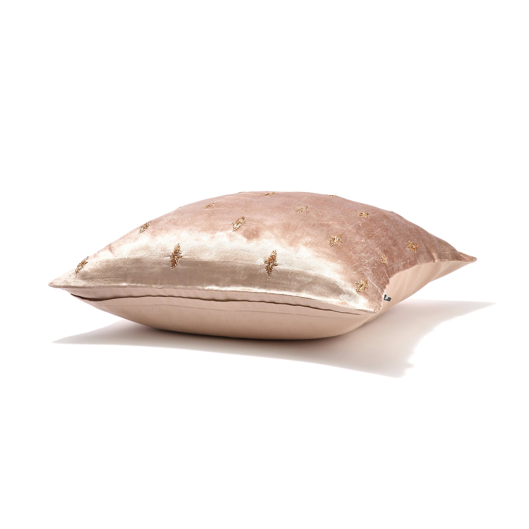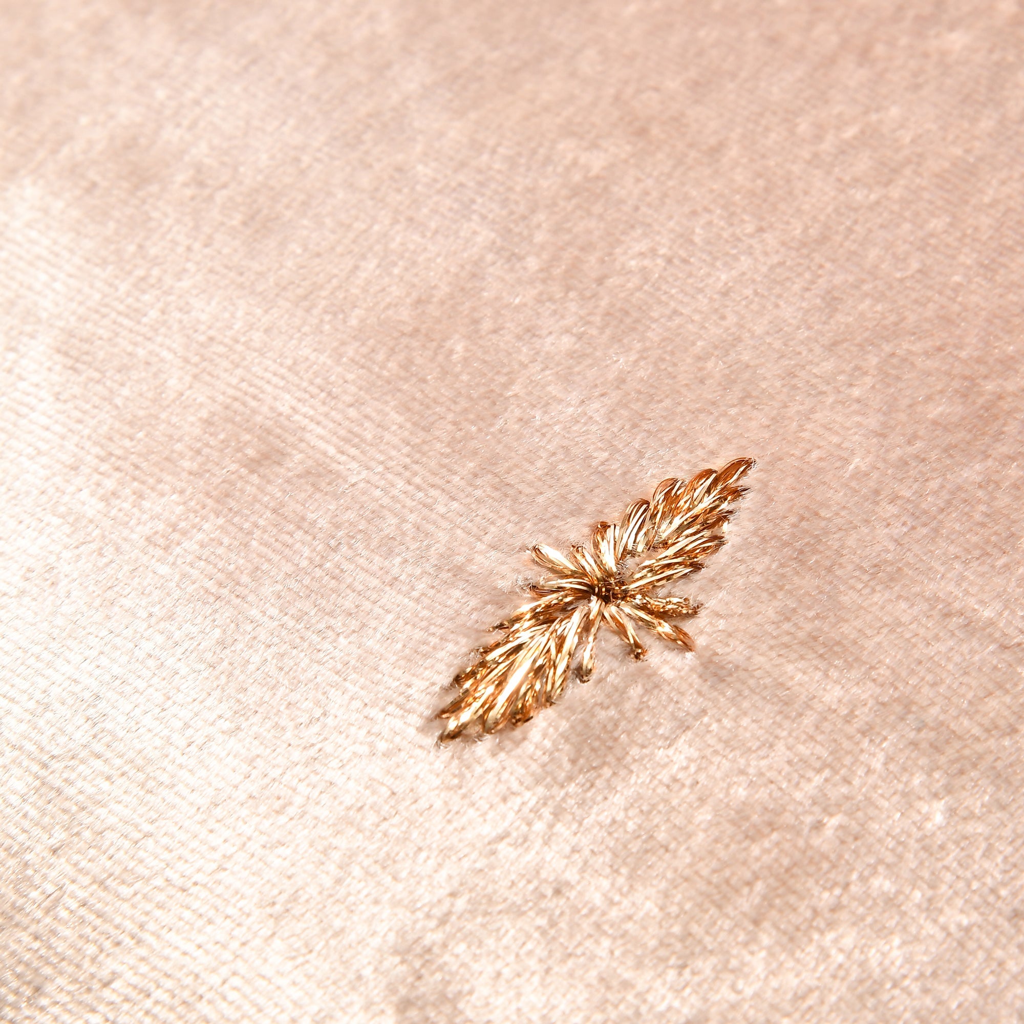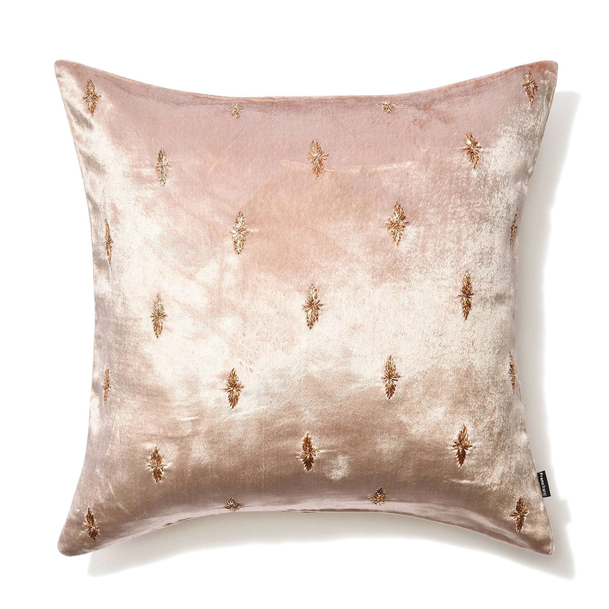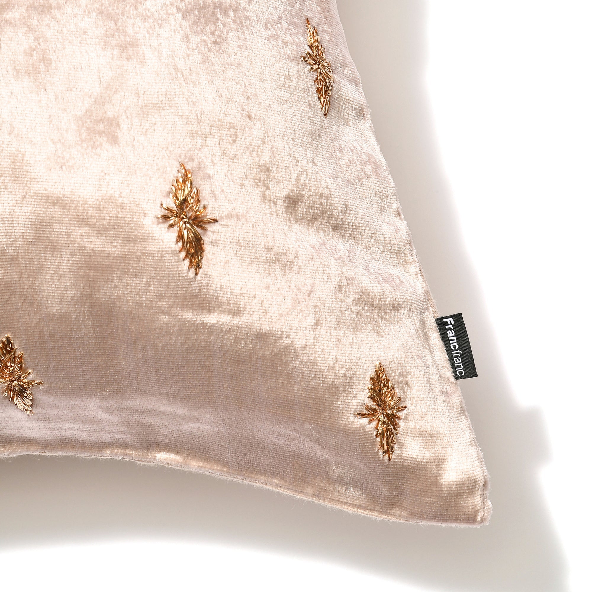 つやのあるベルベット生地に、メタリック糸で全面に刺繍を施したクッションカバーです。生地の美しいつやと、キラキラと輝く刺繍が絶妙に調和し、可愛らしさと高級感を兼ね備えたデザインに仕上がっています。