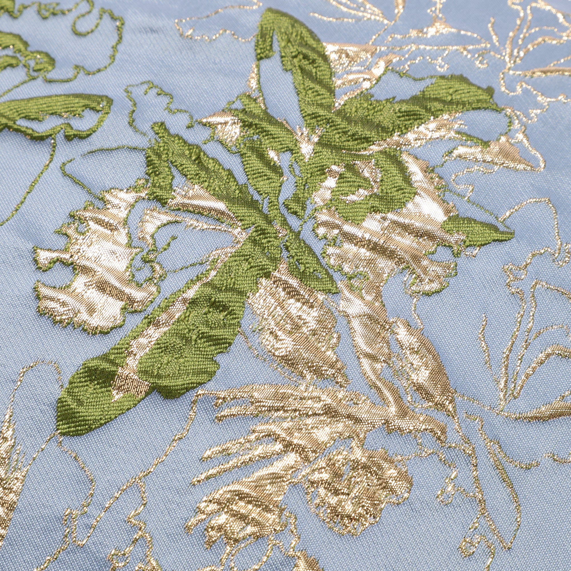 花をモチーフに、メタリック糸を織り込んだジャガード織で柄を表現したクッションカバーです。落ち着いたブルー地に、グリーンとゴールドのラインが映え、奥行きのある上品な印象を演出します。華やかさと静けさが調和した、洗練されたデザインです。