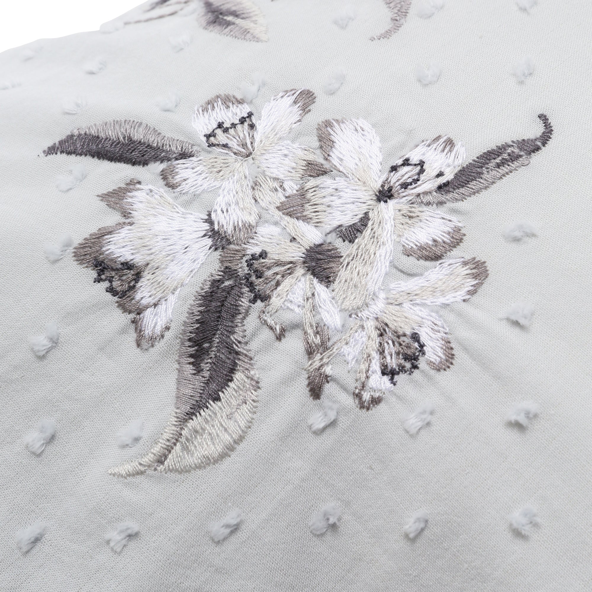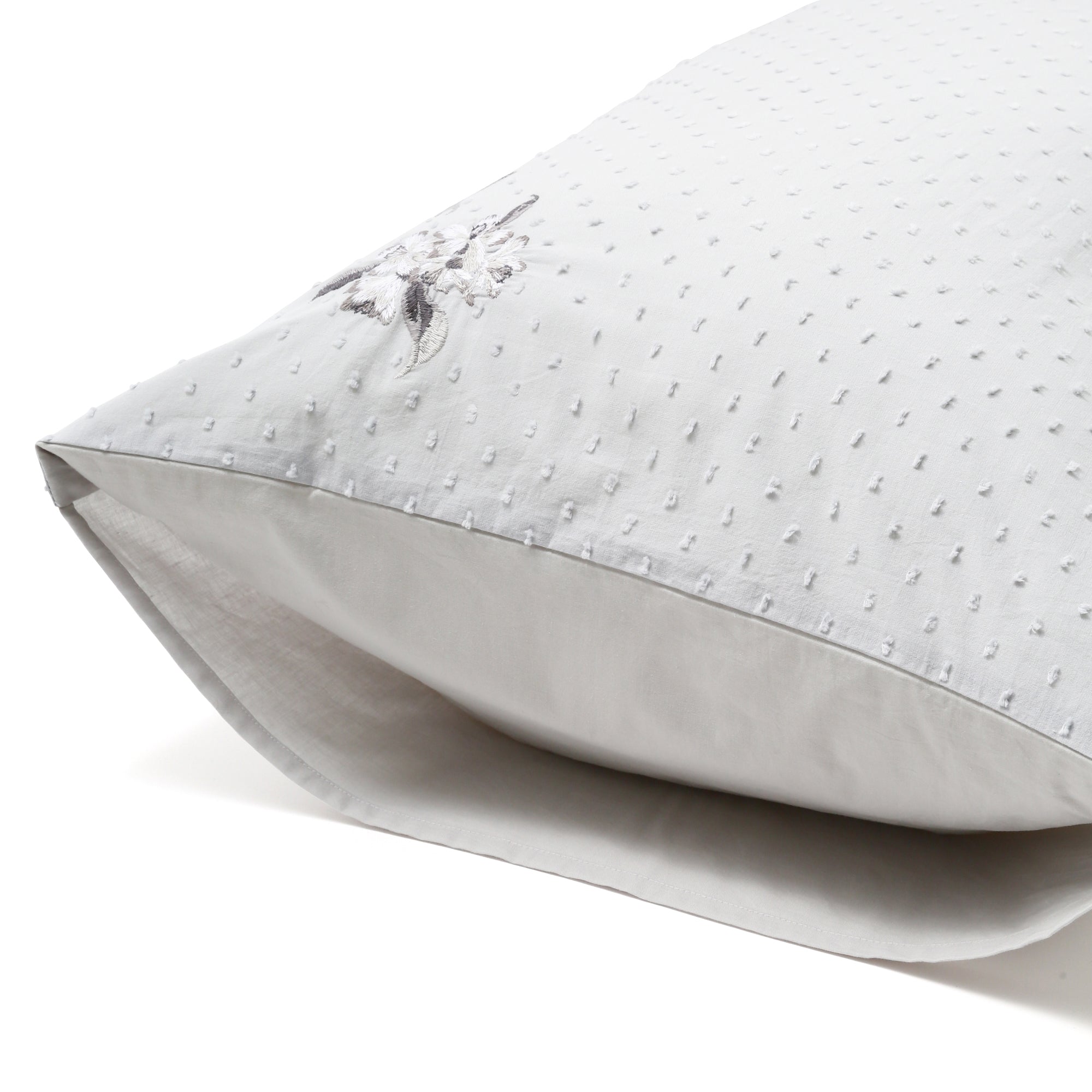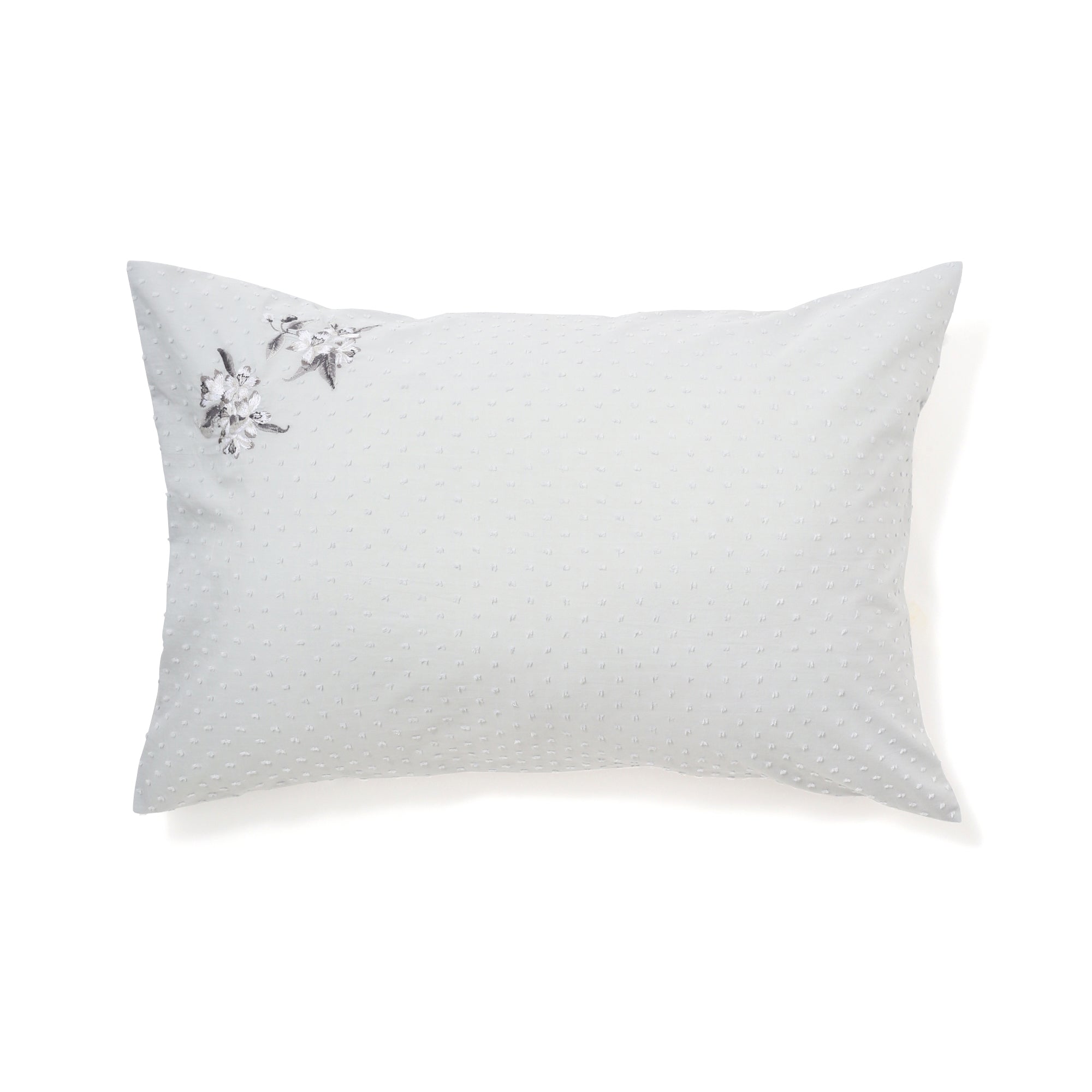 ジャカード織りでドットを表現した生地に、かわいらしいお花の刺繍をあしらった、まくらカバーです。凹凸があり、プリントでは表現できない高級感があります。シンプルだけど、女性らしいお部屋がお好きな方にお勧めです。折り込みタイプで枕にフット。折り込み部分は生地が切り返しになっていて、簡単で綺麗に取り付けをしていただけます。 生地部分はコットン100パーセントの使用で、優しくお肌にふれます。また、通気性に優れているため快適な睡眠をサポートします。こだわりの寝具で心地良いリラックスタイムをお過ごしください。