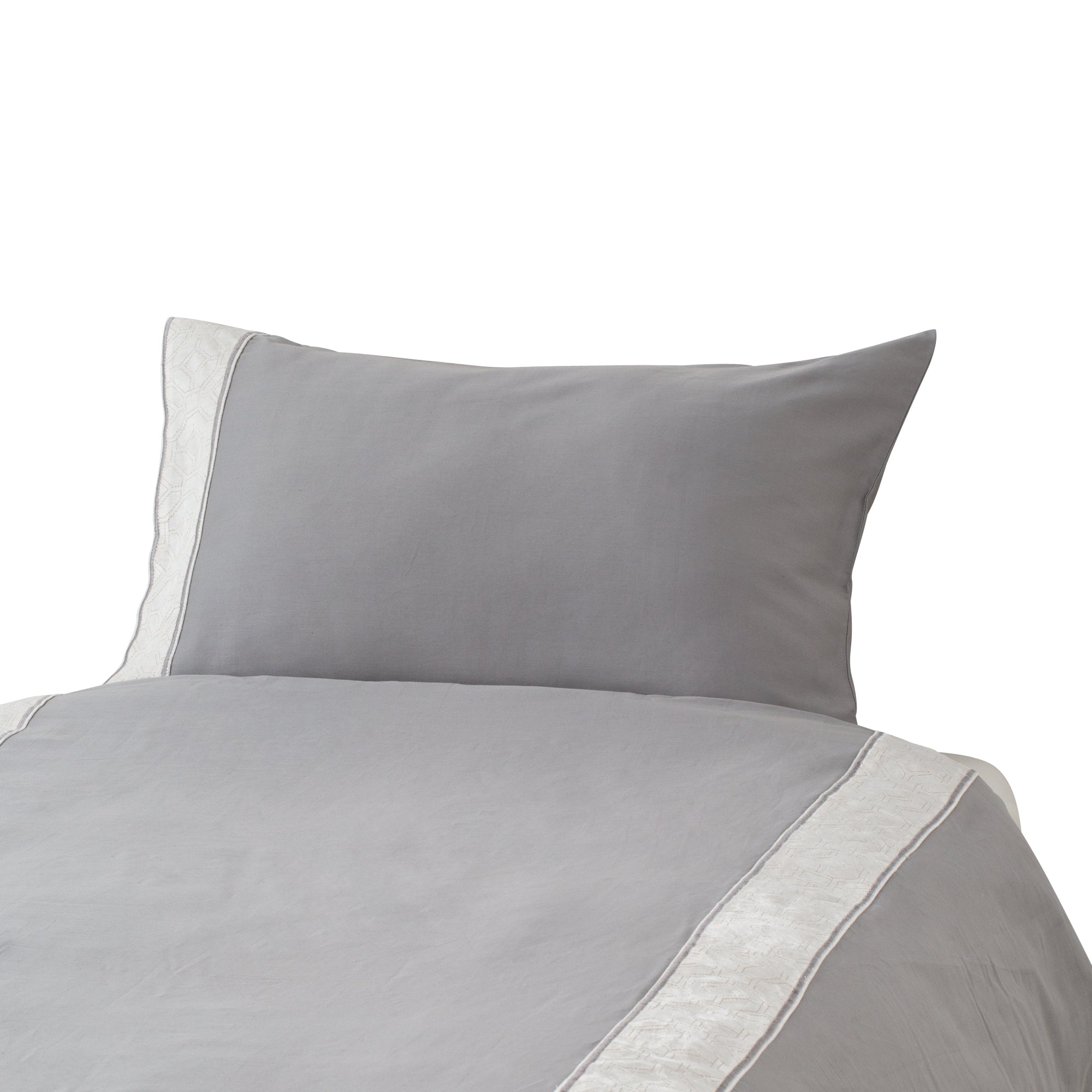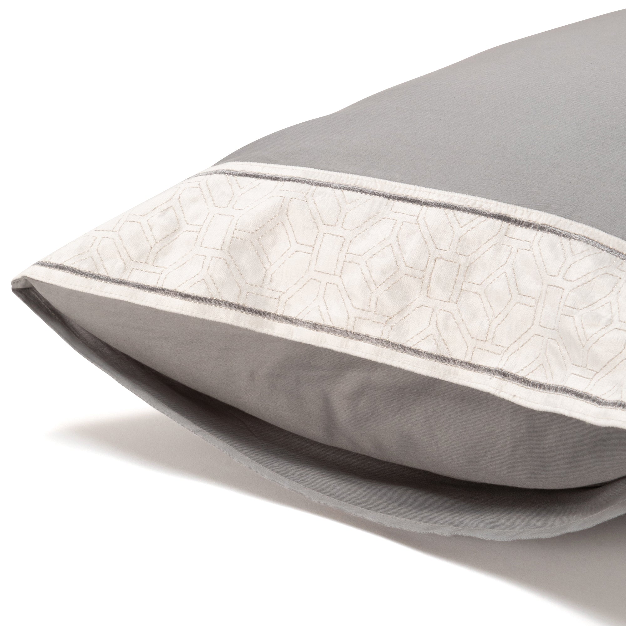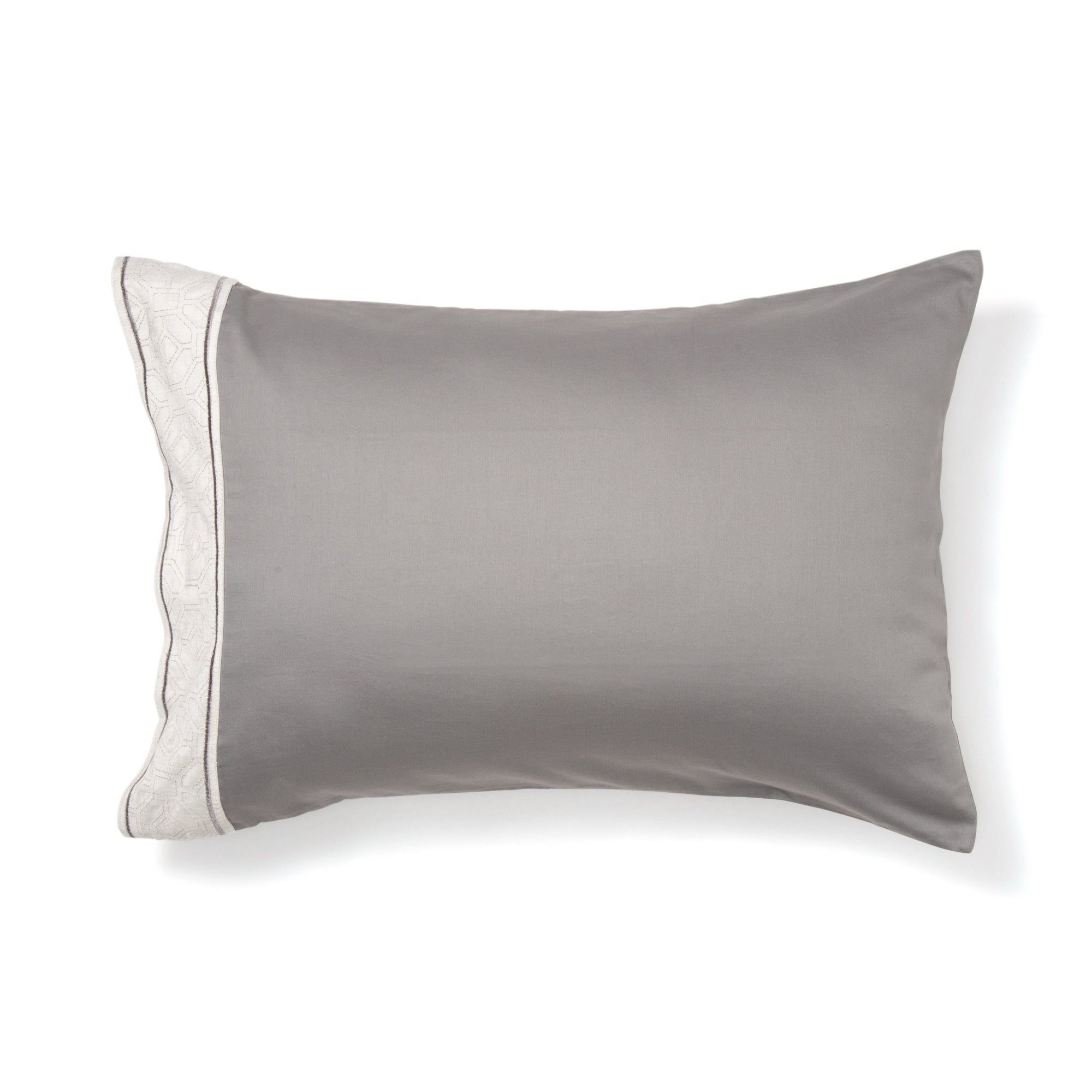 つややかなコットンの手触りが心地よい、高級感あふれる枕カバーです。光沢のあるコットンヴィスコースのテープをあしらい、異国情緒あふれる繊細な刺繍を施しました。シンプルなデザインが素材の上質感をより一層引き立て、モダンでラグジュアリーな空間を生み出します。ホテルのベッドルームのような極上のリラックスタイムをお楽しみください。