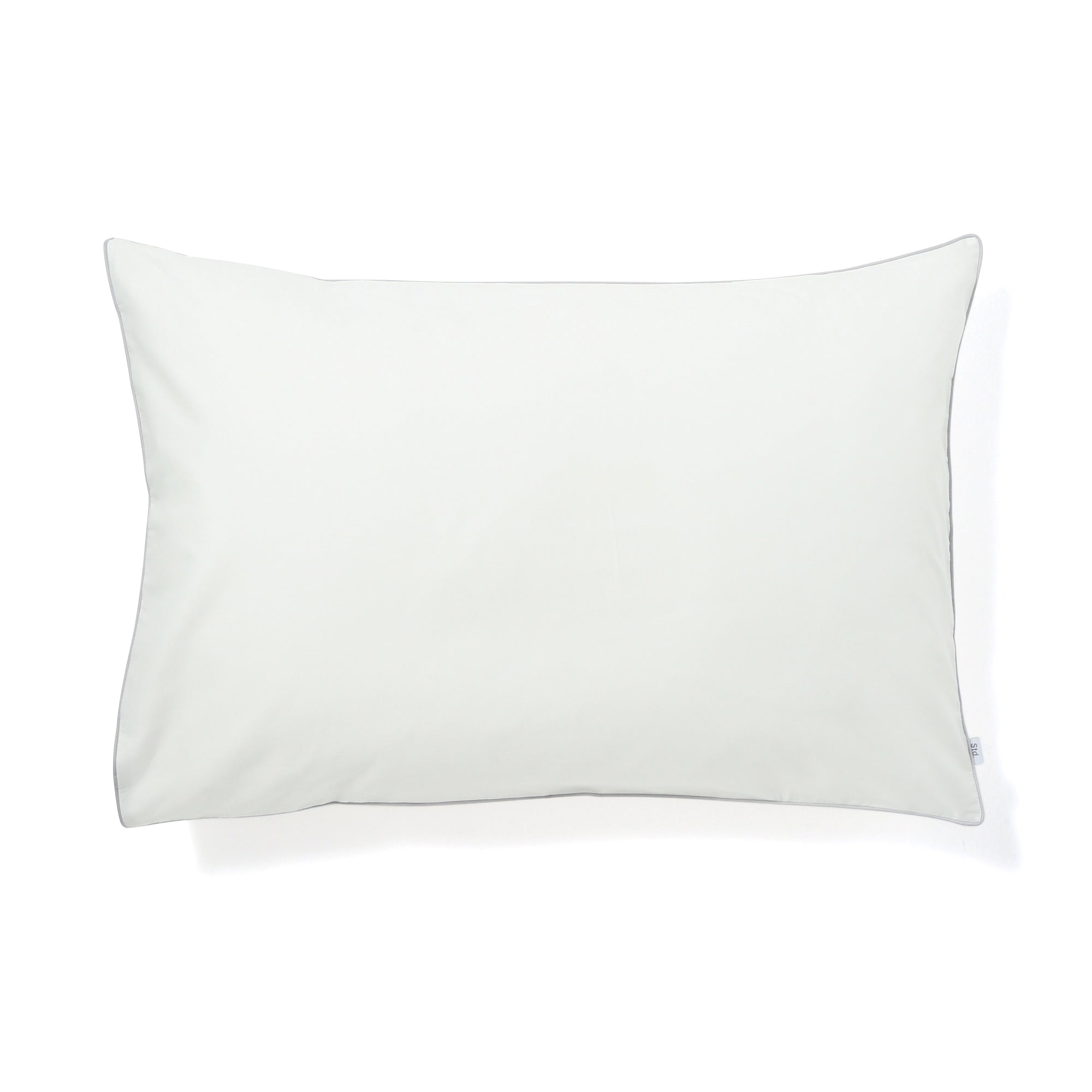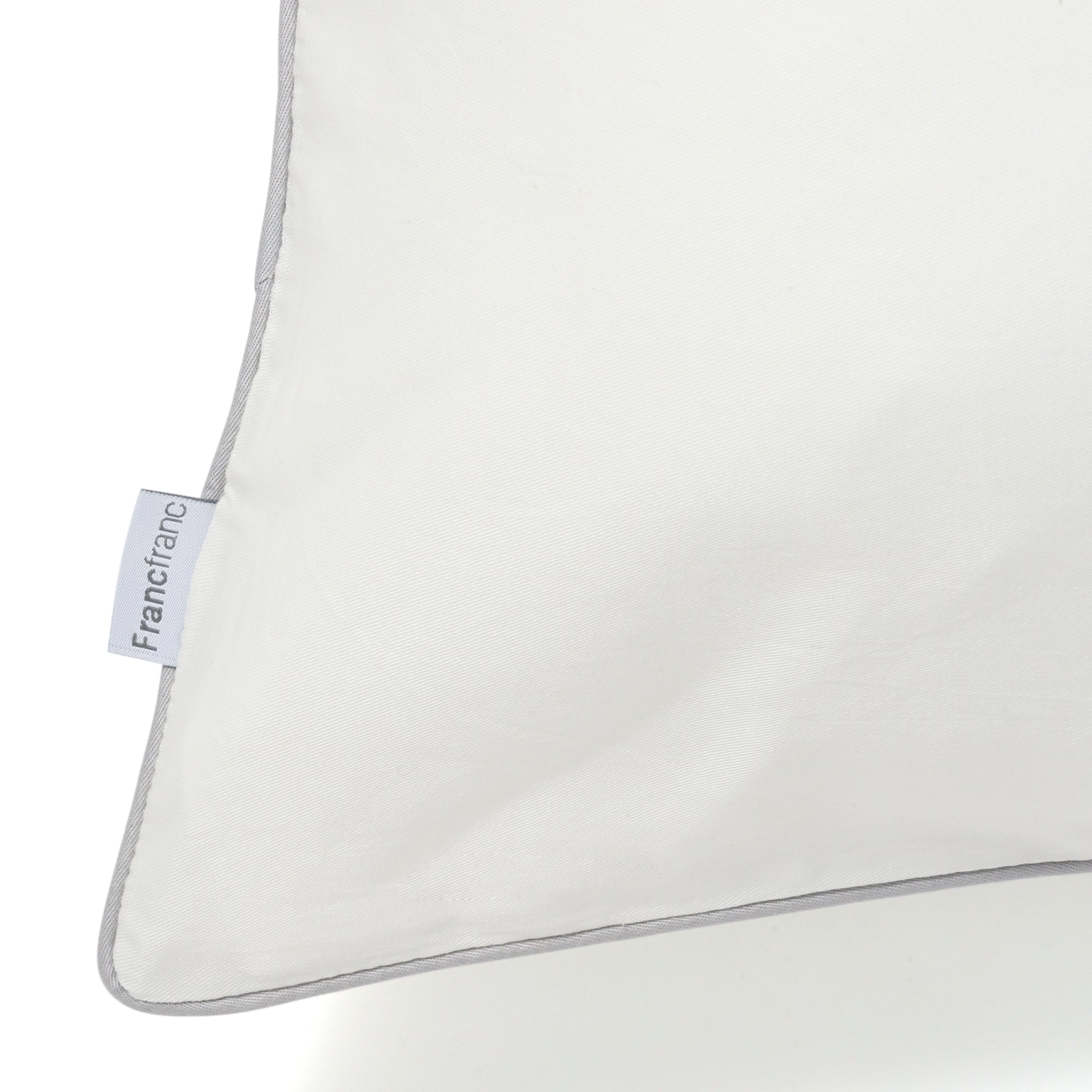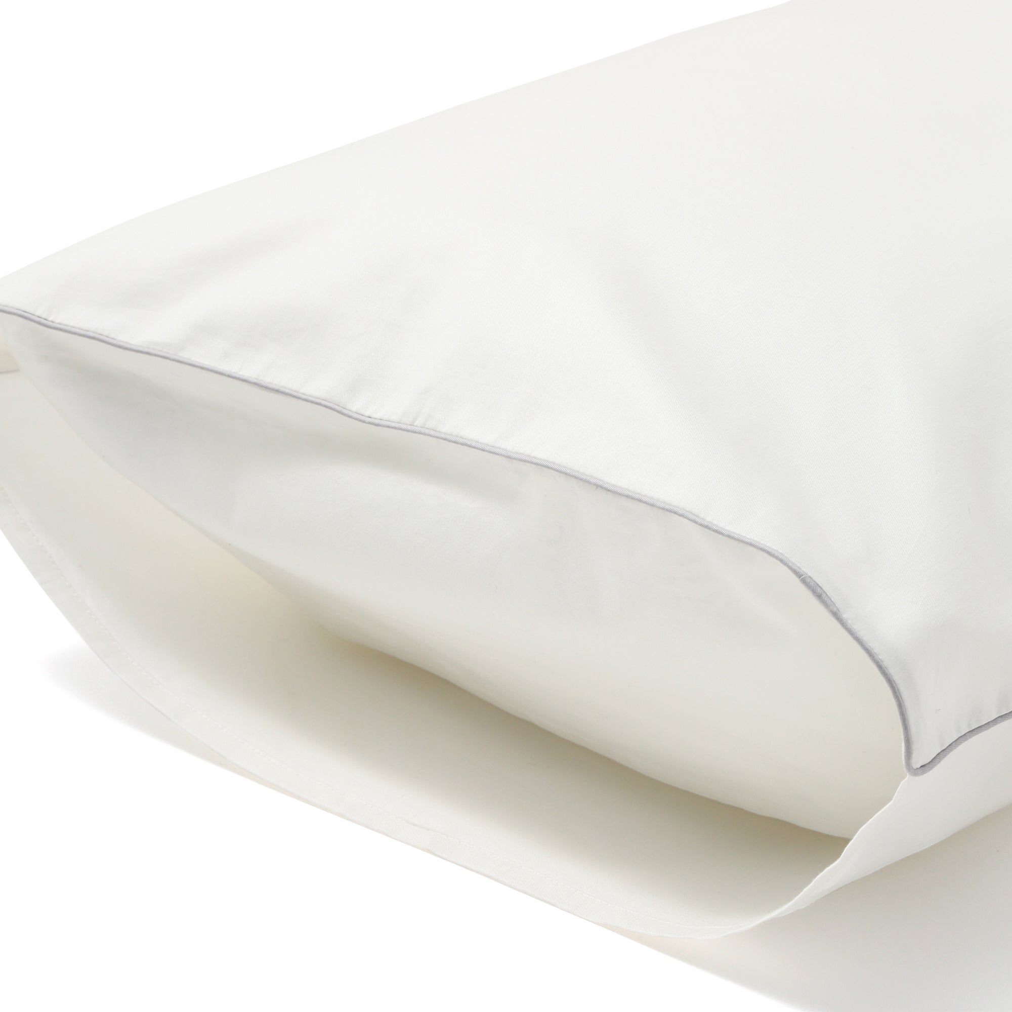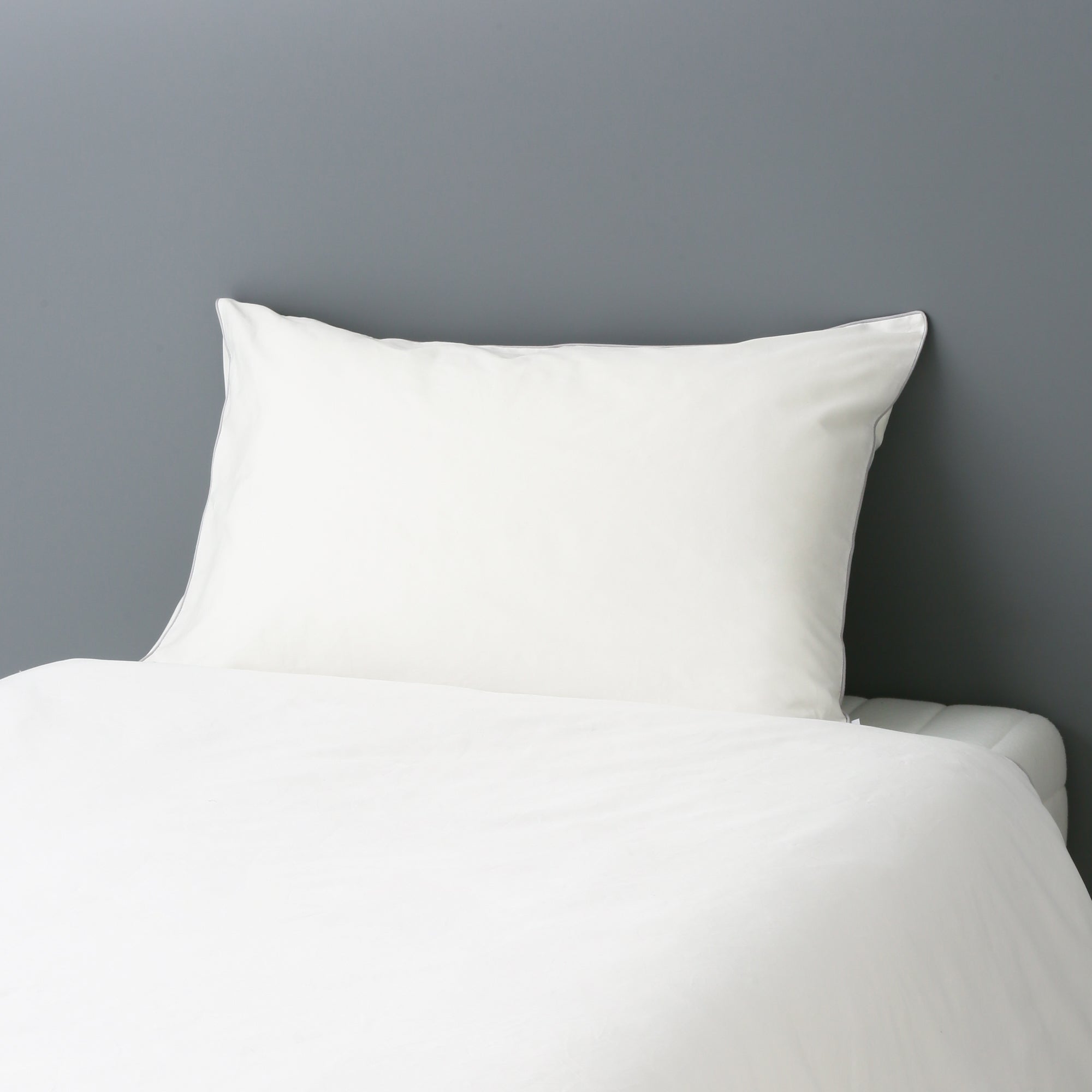 目の細かいコットンを贅沢に使用した、ホテルライクな清潔感のある寝装品です。幅70cm×奥行50cmと、一般的な枕に比べ大きめのサイズ感。枕から落ちる心配がないので、寝返りが多い方にもおすすめです。素材にこだわり、通気性や吸水性に優れたコットンを使用。蒸れにくくさらさらした状態を保ちます。柔らかな感触はコットン100%だからこそ感じられる特別なものです。通常はポリエステル素材が使われることの多いパイピング部分にも、同素材のコットンを採用しました。どんなインテリアにもなじむシンプルなホワイトカラーが魅力です。ホワイトのアイテムは、ベッドルームを明るくすっきりとした空間にしてくれます。パイピングはライトグレーを使用し、落ち着きのある印象をプラス。全体のいいアクセントになっていますね。お手持ちの寝装品にも合わせやすいデザインです。カバーは片側が開いている封筒式を採用。枕の出し入れが簡単にできます。同じシリーズには、ライトグレーもご用意しました。ライトグレーはパイピングがホワイトになっています。季節で使い分けたり、ご夫婦で色違いにしたりとさまざまな使い方が可能です。シンプルだからこそ際立つ上品な光沢感が、すっきりと洗練された上質な安らぎ空間を演出します。