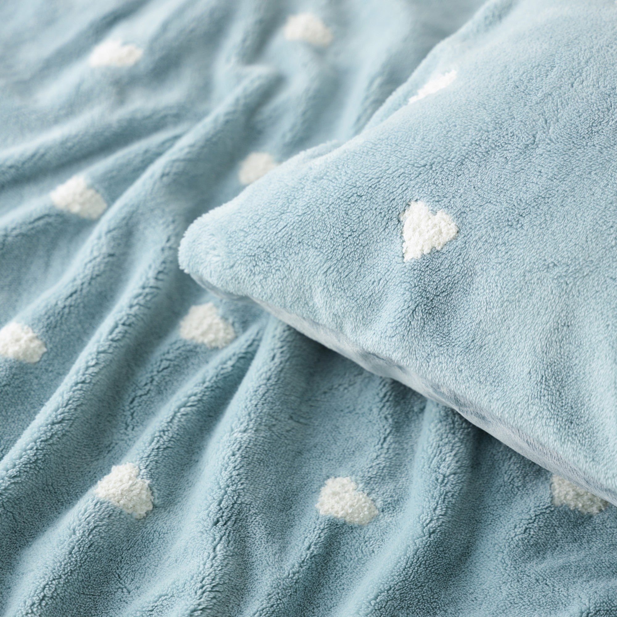 ハートモチーフの刺繍が可愛らしいまくらカバーです。表側は毛足長めのふんわりとしたマイクロファイバー生地で、ふわふわと肌触りよく仕上げました。裏側には肌触り滑らかなマイクロファイバー生地を使用し、布団に入った時のヒヤっと感を軽減しました。秋冬の快適な入眠をサポートします。
