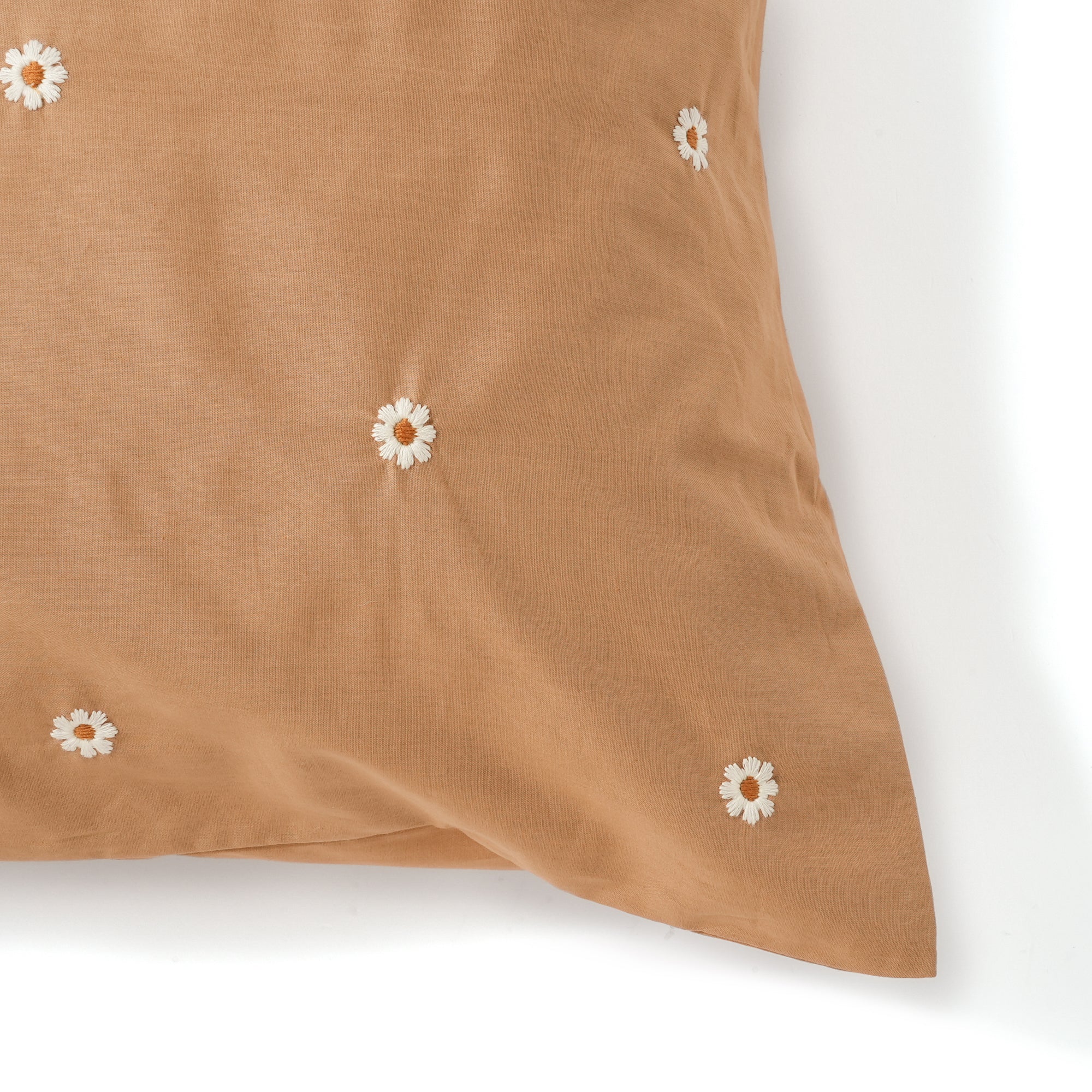 コットン100%のやわらかな生地に、デイジーモチーフを刺繍した枕カバーです。小さめの刺繍にしたことで、無地に近い感覚で取り入れやすく、さりげないアクセントに。立体感が出る方法で刺繍を施しており、ほどよい存在感と上品な垢抜け感の印象を与えます。