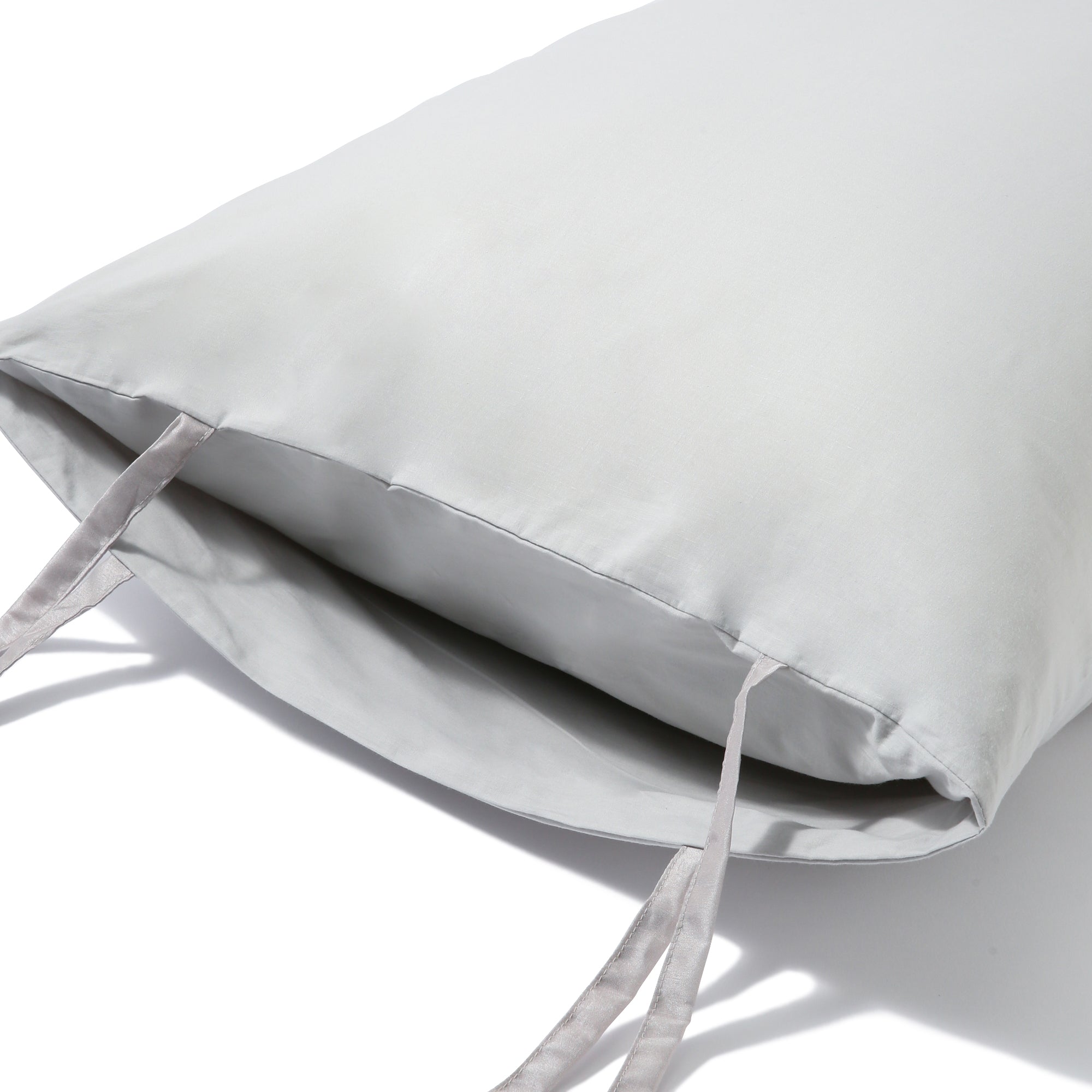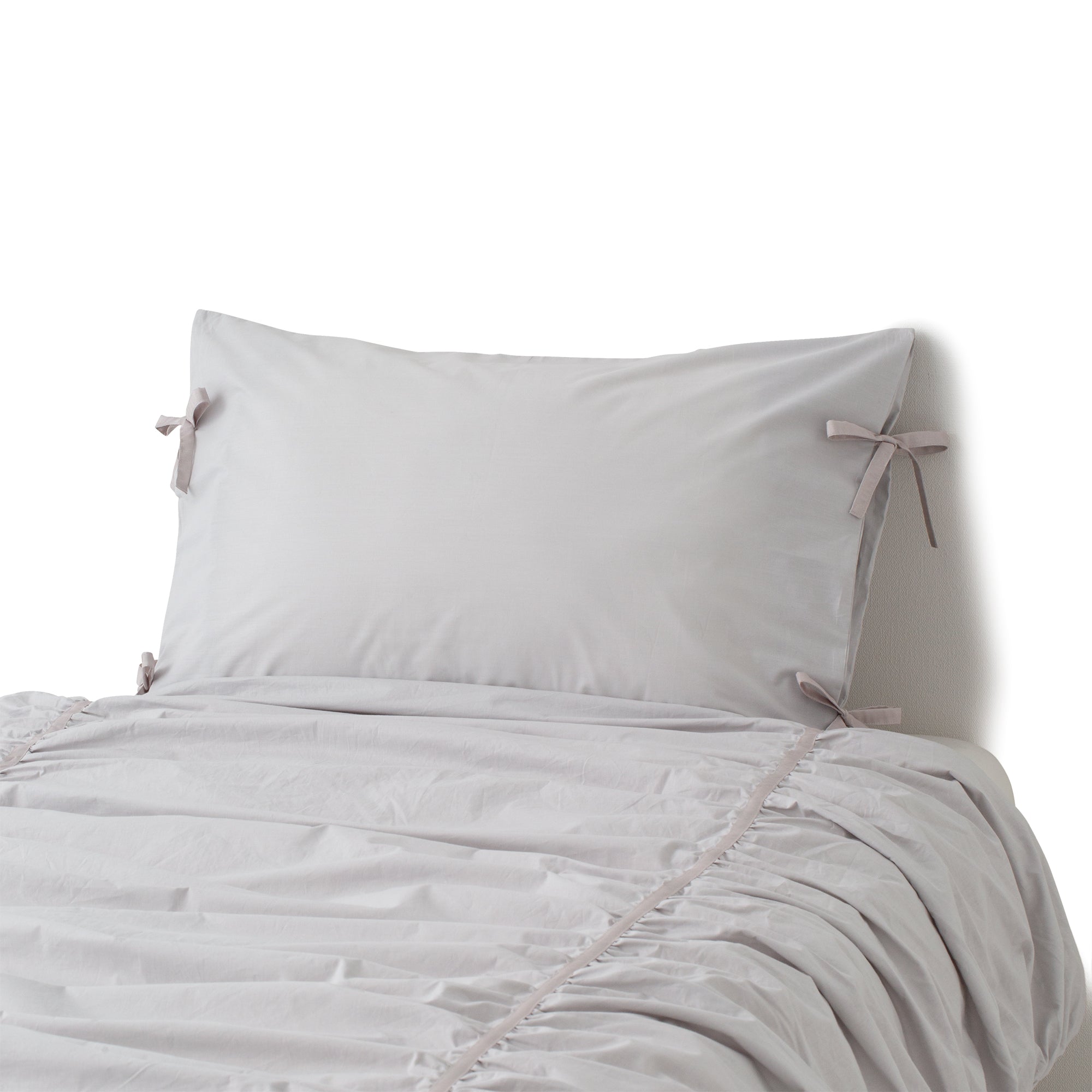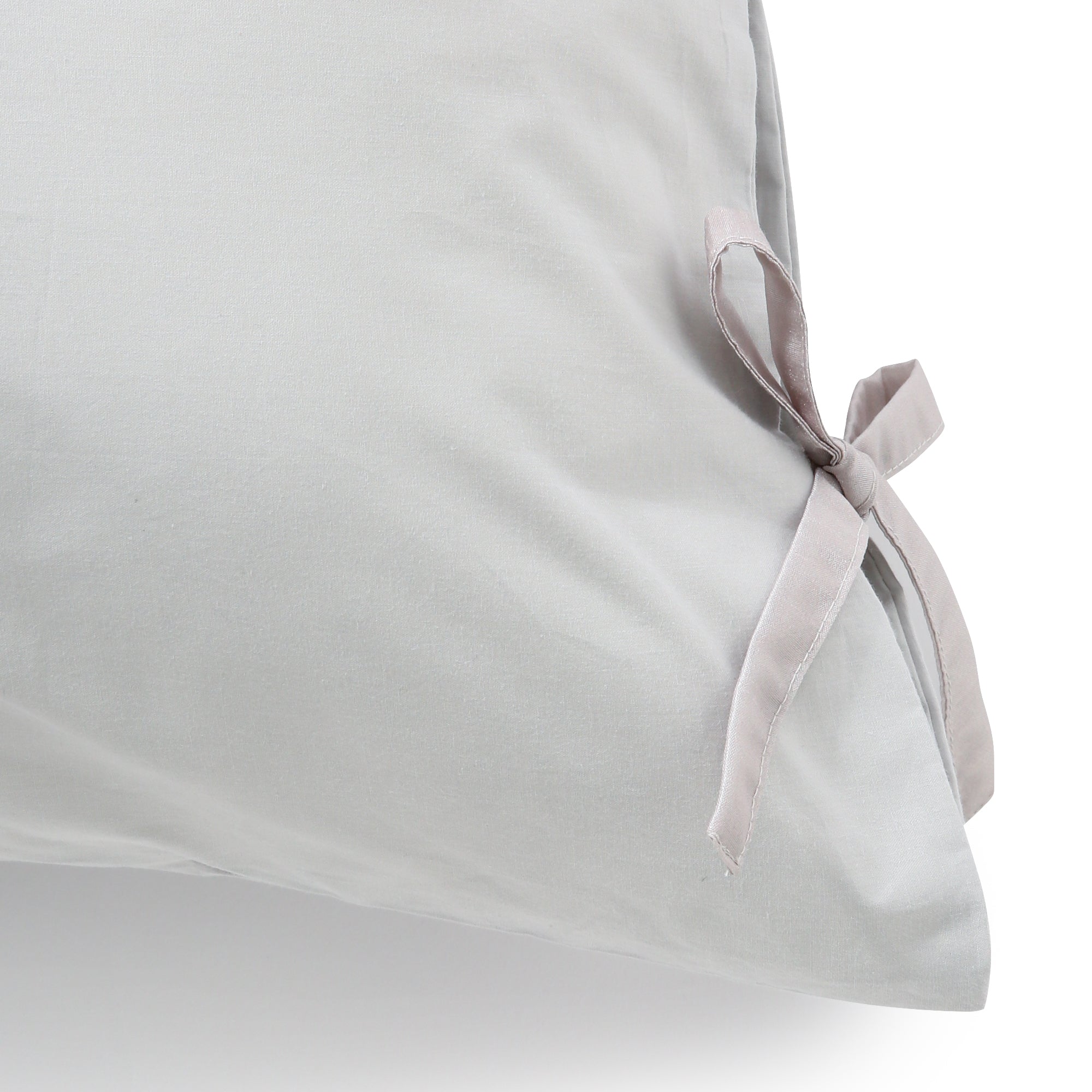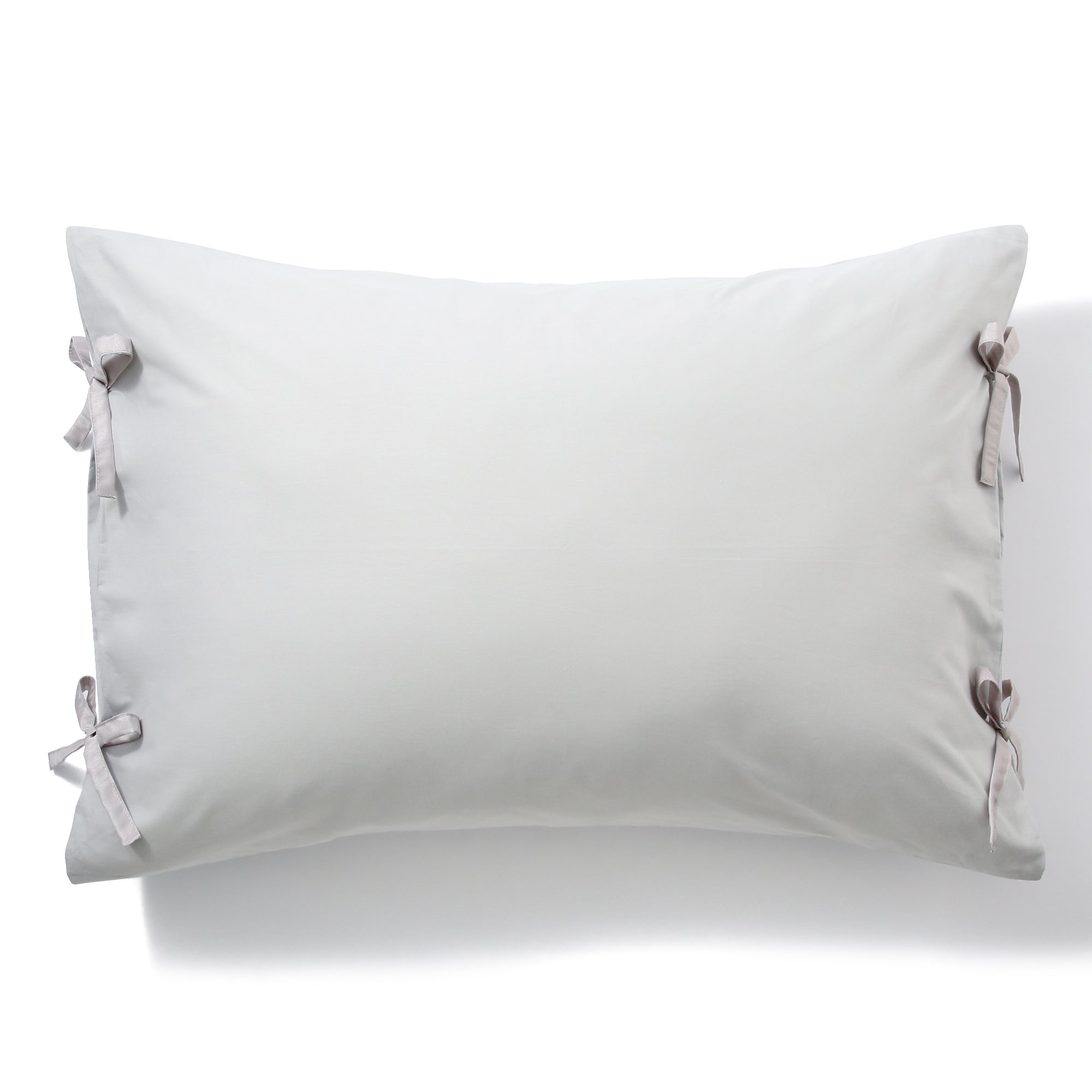 優しいグレーの生地に光沢のあるリボンをあしらった、シンプルフェミニンなまくらカバーです。リボンでボリュームを出したデザインはシンプルながら十分な存在感。ナチュラルなインテリアによくあう仕上がりです。