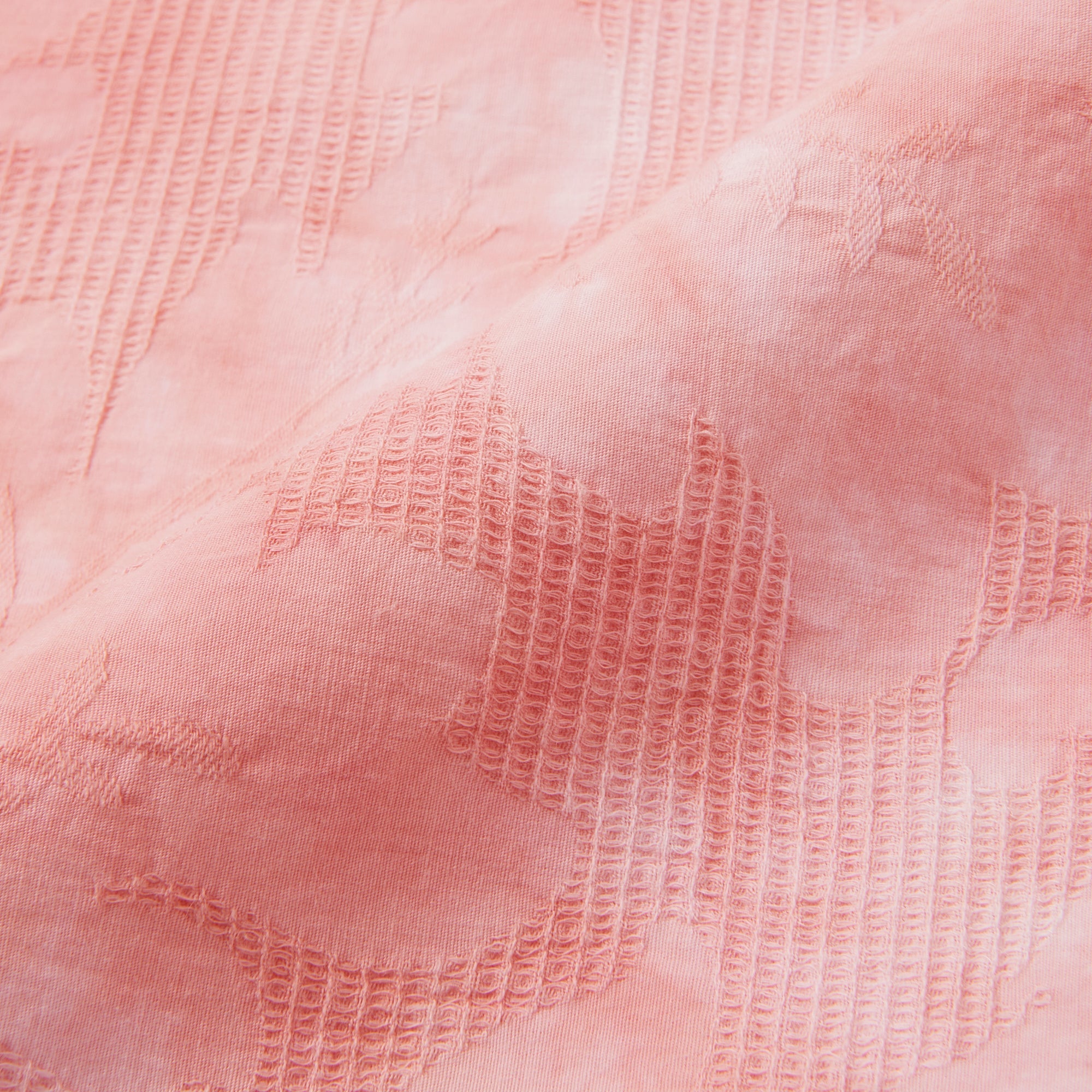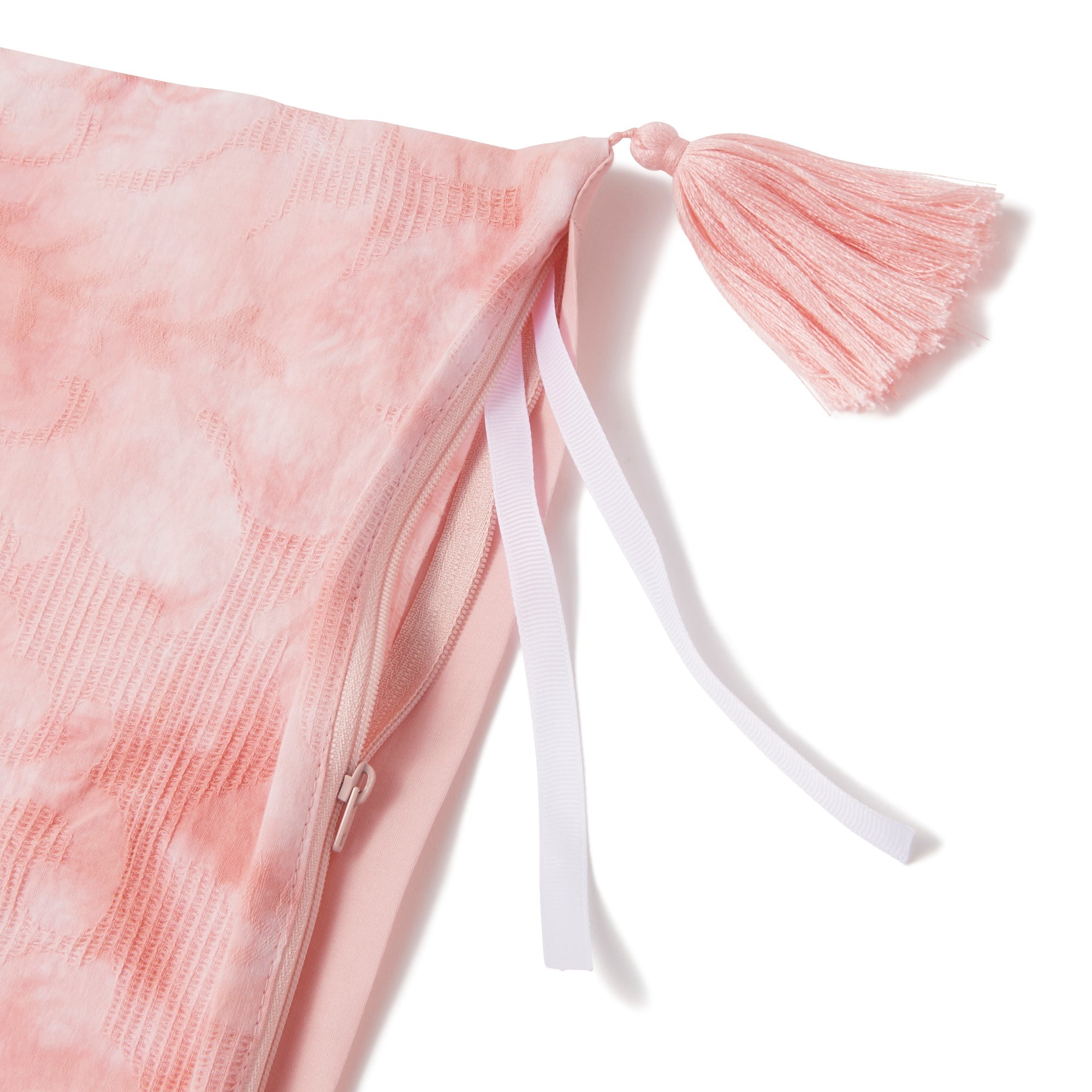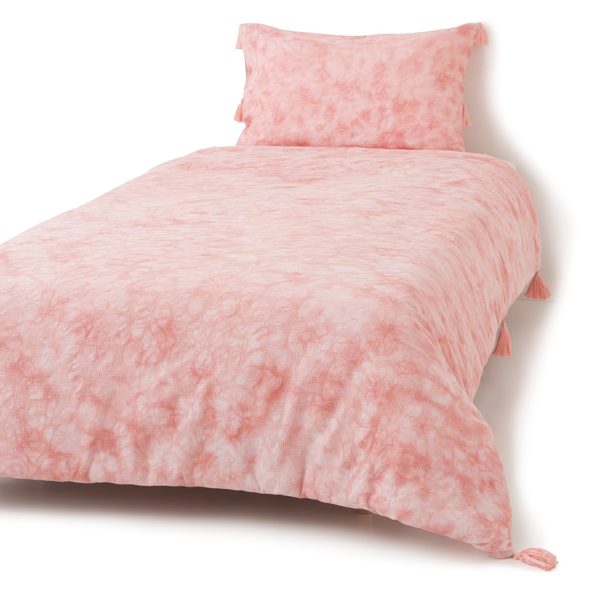 淡いピンクのダイダイ染めが目を引く掛け布団カバーです。生地自体にワッフル織で花柄を織り込んだ、フェミニンなデザイン。爽やかでかわいらしいタッセルもポイントです。