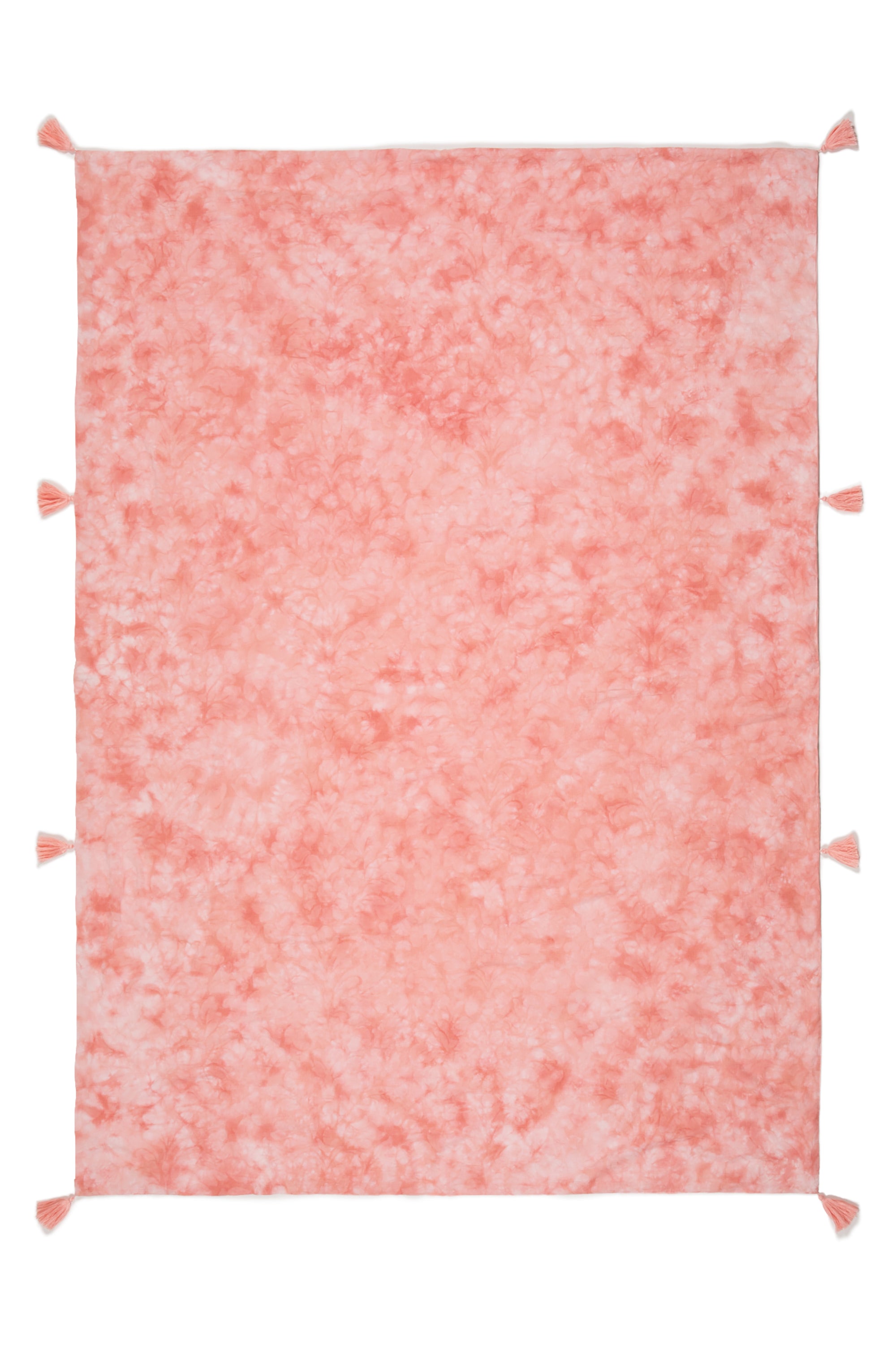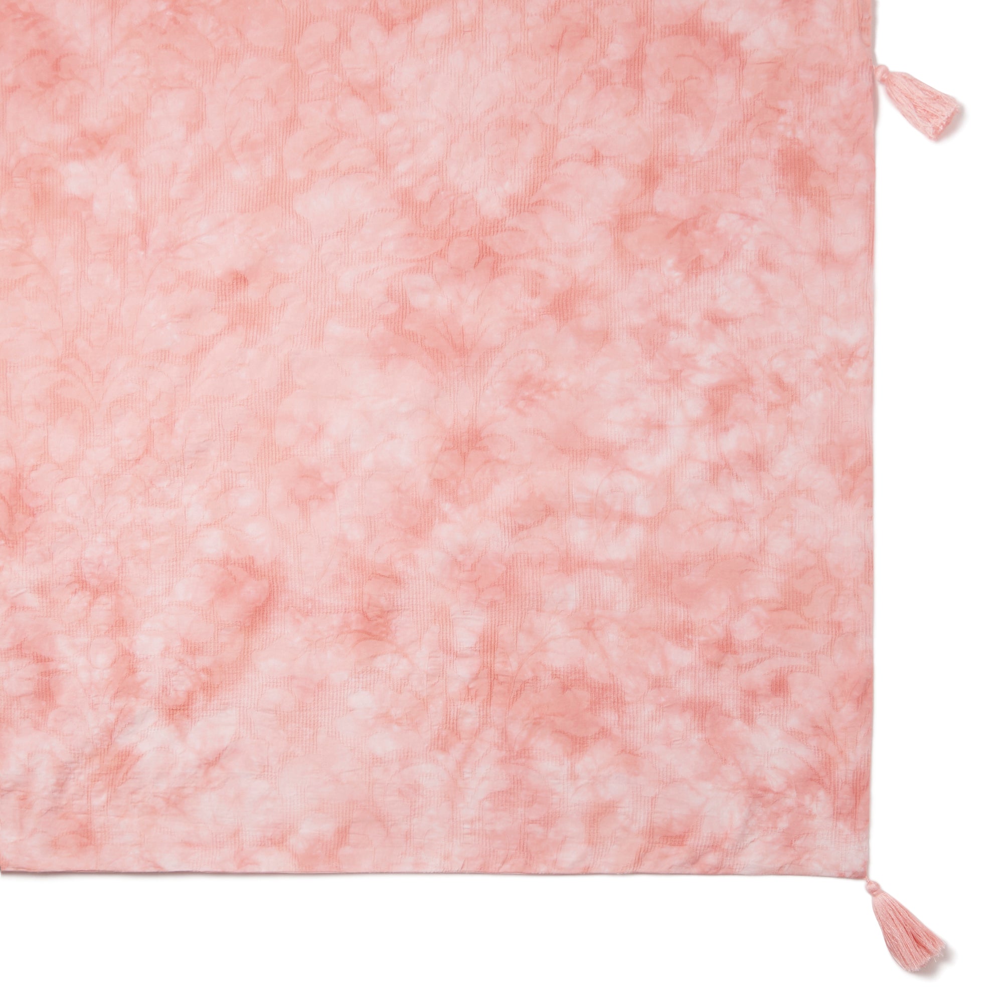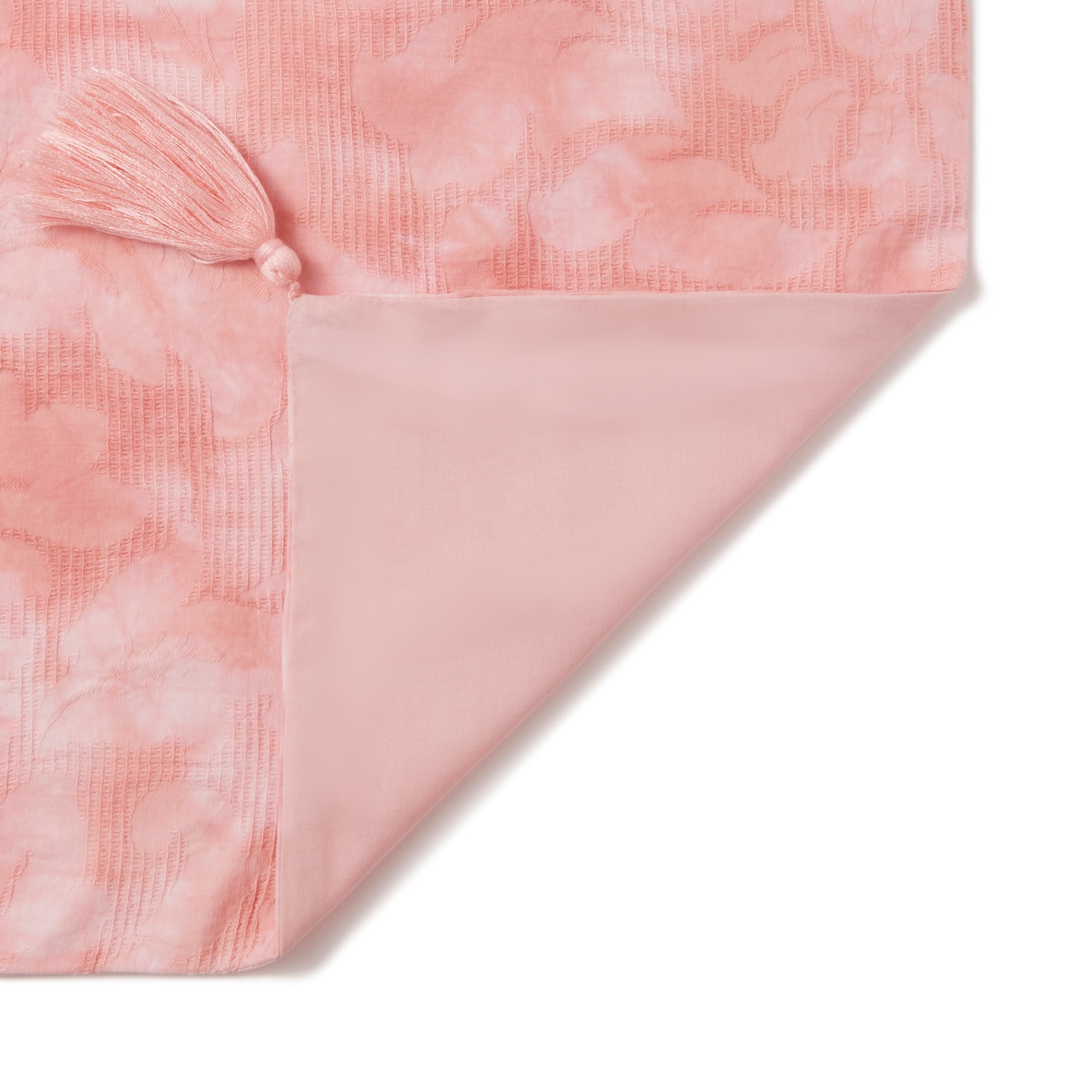 淡いピンクのダイダイ染めが目を引く掛け布団カバーです。生地自体にワッフル織で花柄を織り込んだ、フェミニンなデザイン。爽やかでかわいらしいタッセルもポイントです。