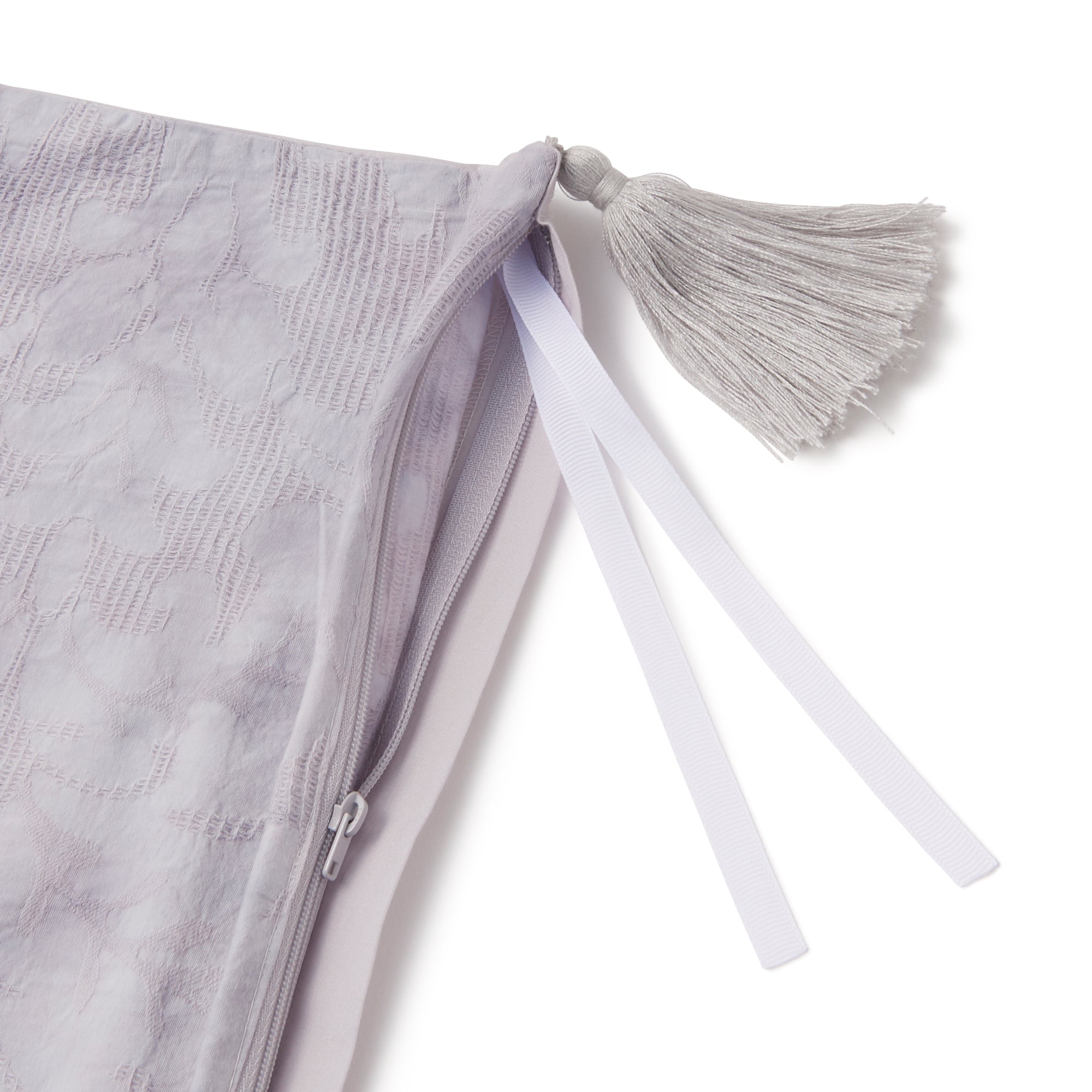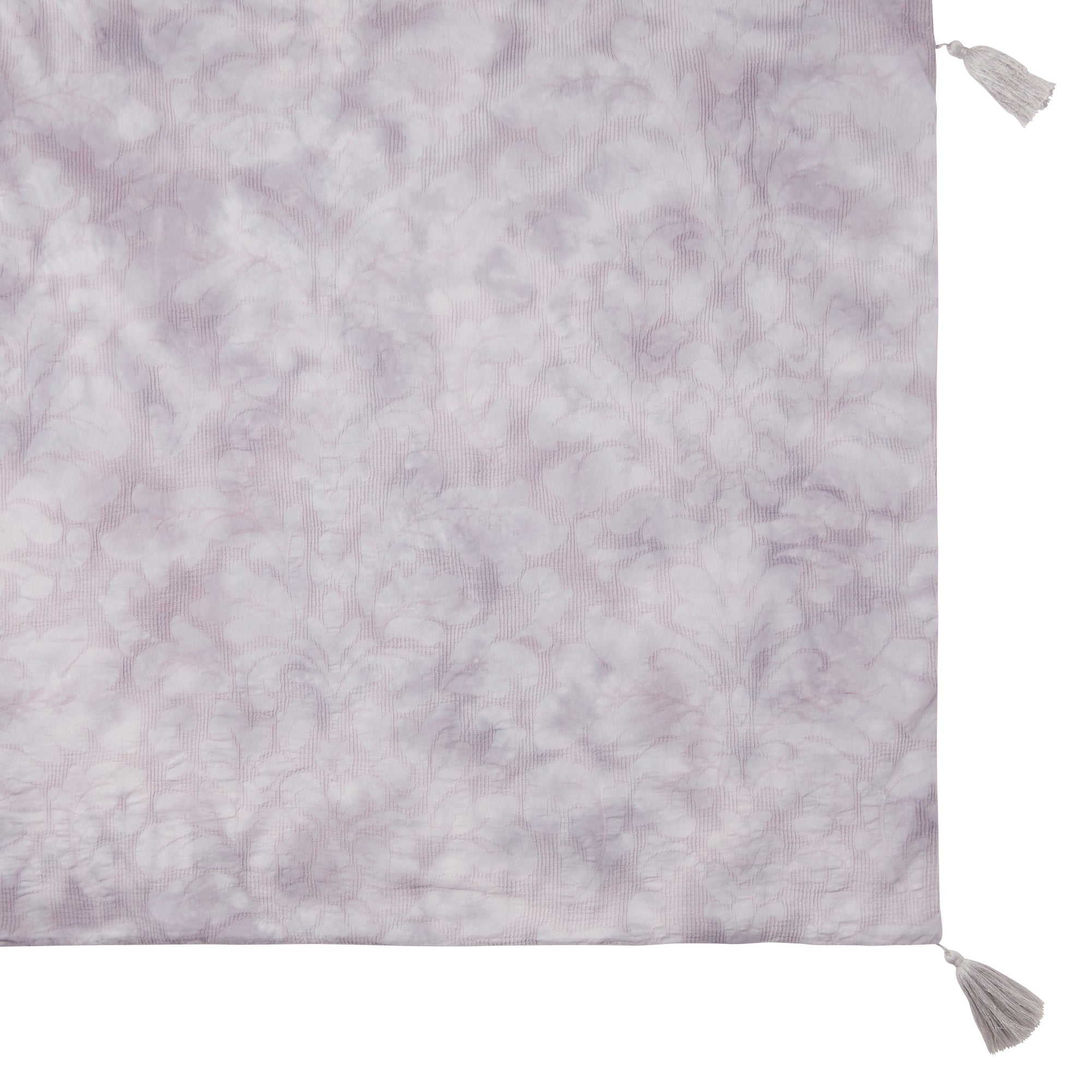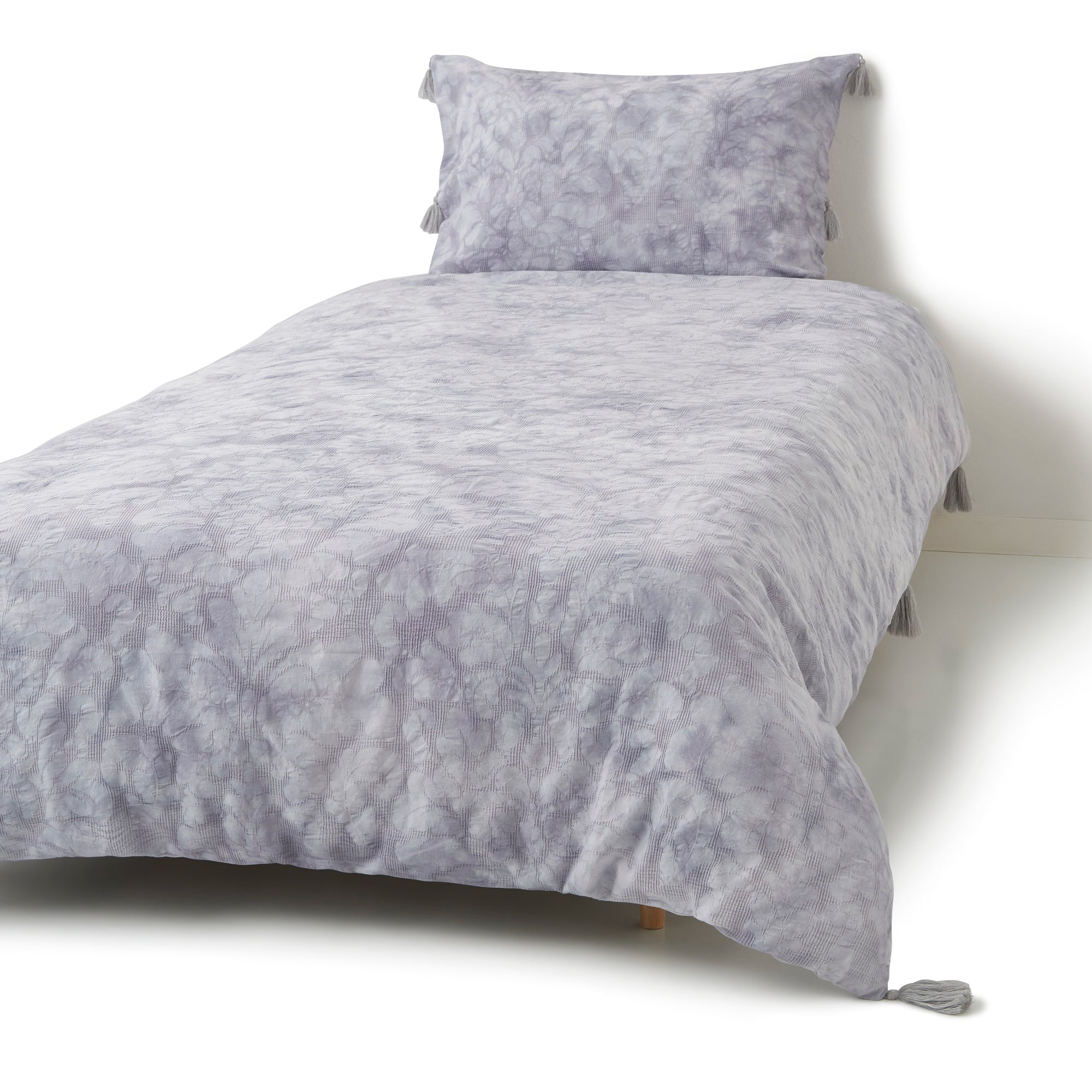 生地自体にワッフル織で花柄を織り込んだフェミニンな掛け布団カバーです。淡いグレーのダイダイ染めがフェミニンなデザイン。爽やかでかわいらしいタッセルもポイントです。