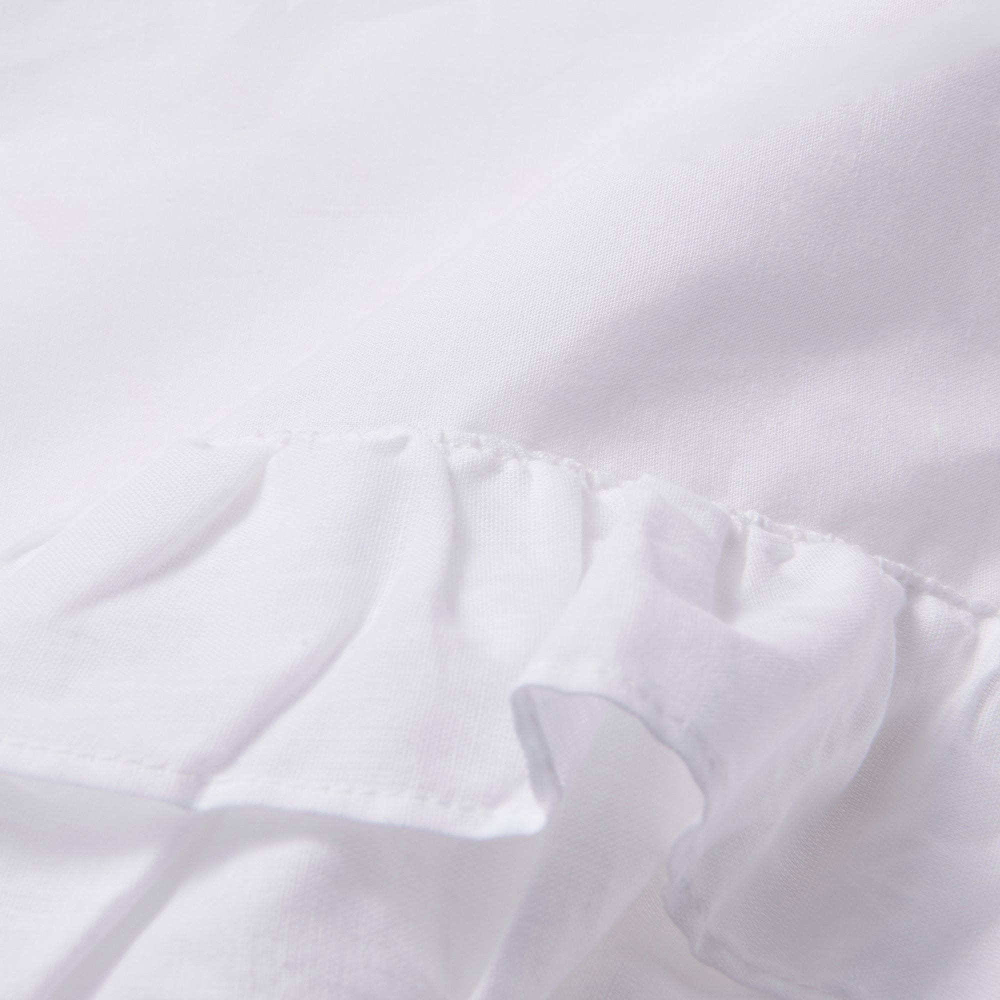 透け感があるフリルをあしらったフェミニンな掛け布団カバーです。シンプルなお部屋が好きだけれど華やかさも大切にしたい方にぜひおすすめしたいアイテムです。ボリュームたっぷりのフリルで華やかに。シンプルな無地なのでどんなインテリアにもすんなりなじみます。内側に中材を固定する紐がついているので、取り付けがスムーズに行えます。おやすみ中もカバーと中材のずれを防いですっきり快適です。コットン100%のさらりとした風合いが心地よい眠りに誘います。