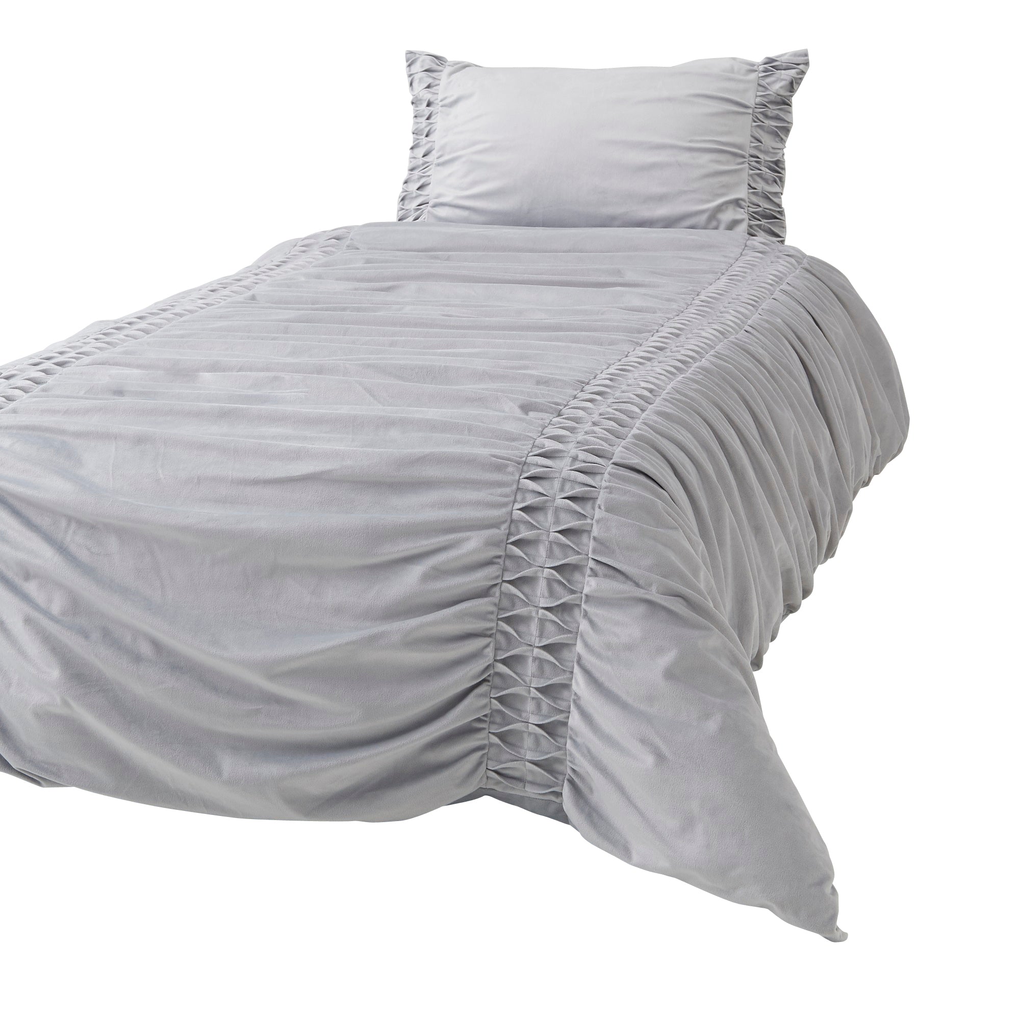 マイクロファイバー素材を使った、肌触りなめらかなあったか掛け布団カバーです。布団に入った瞬間から感じられるぬくもりとなめらかな触り心地。肌寒い季節にうれしい、癒しのアイテムです。立体感のあるデザインが華やかな雰囲気を漂わせ、シンプルなだけで終わらないエレガントなコーディネートが楽しめます。落ち着いた色味のグレーは、ベッドで過ごすリラックスタイムを優しく包み込んでくれるようなカラーです。年代を問わずに使いやすい、マイクロファイバー寝具の中でもシンプルなデザインのシリーズ。細かく生地にタックを寄せて、ワンポイントになるラインが両サイドに入っています。そこから生まれるひだが流れるようなデザインが綺麗な、贅沢に生地を使用したデザインです。ふんわり軽くて暖かい。マイクロファイバー寝具で快適な寝心地。Francfrancのマイクロファイバー寝具は、超極細繊維できめが細かく、ソフトで滑らかな肌触り。繊維と繊維の間に空気を溜め込み、体温を逃がさず暖かさを保ちます。保湿性にも優れた生地は布団に入った時のヒヤっと感を軽減させ、快適な入眠をサポートします。