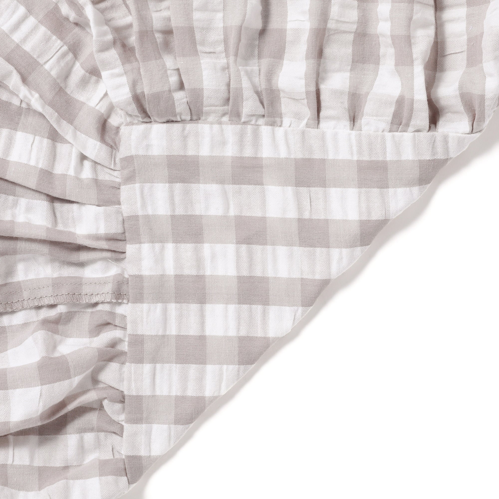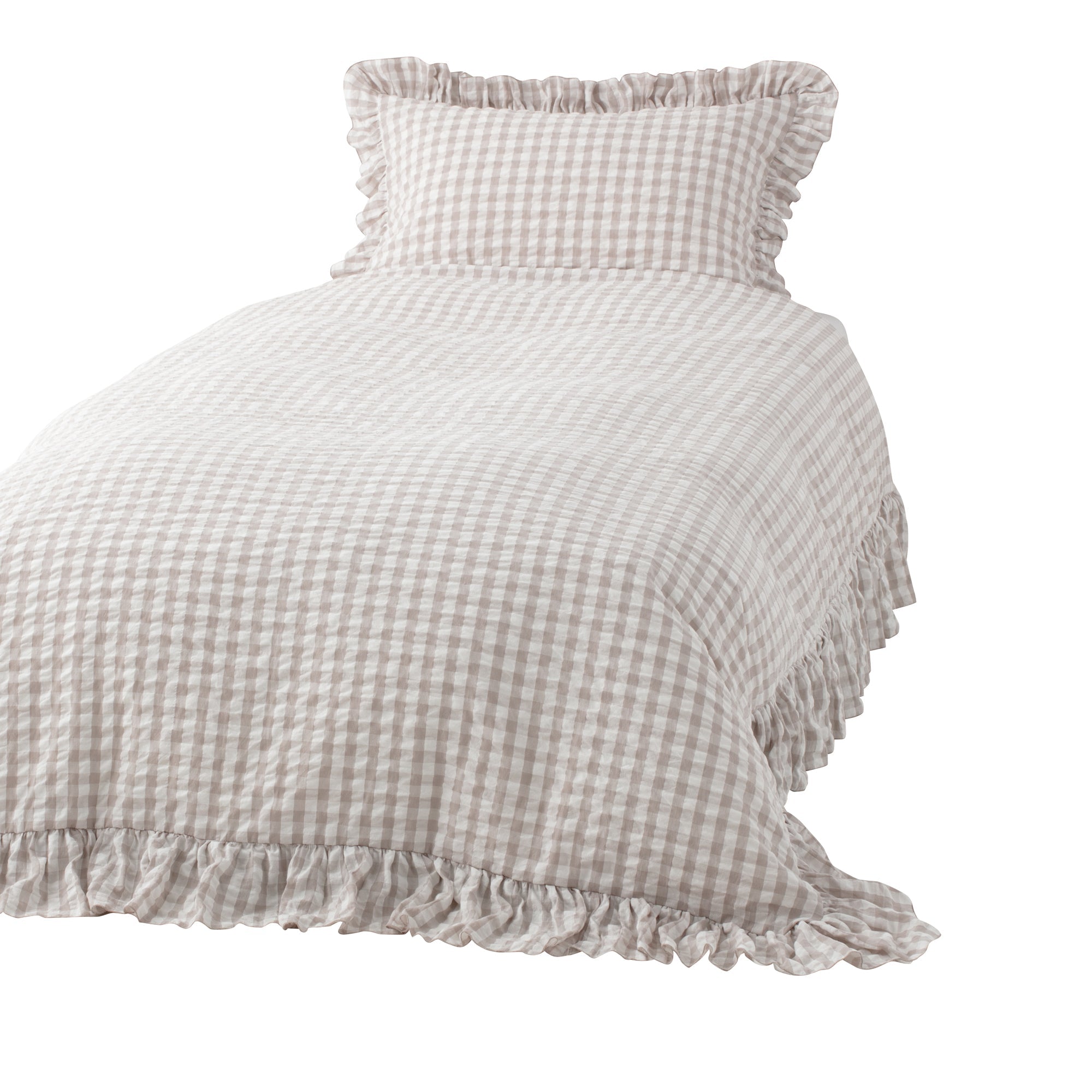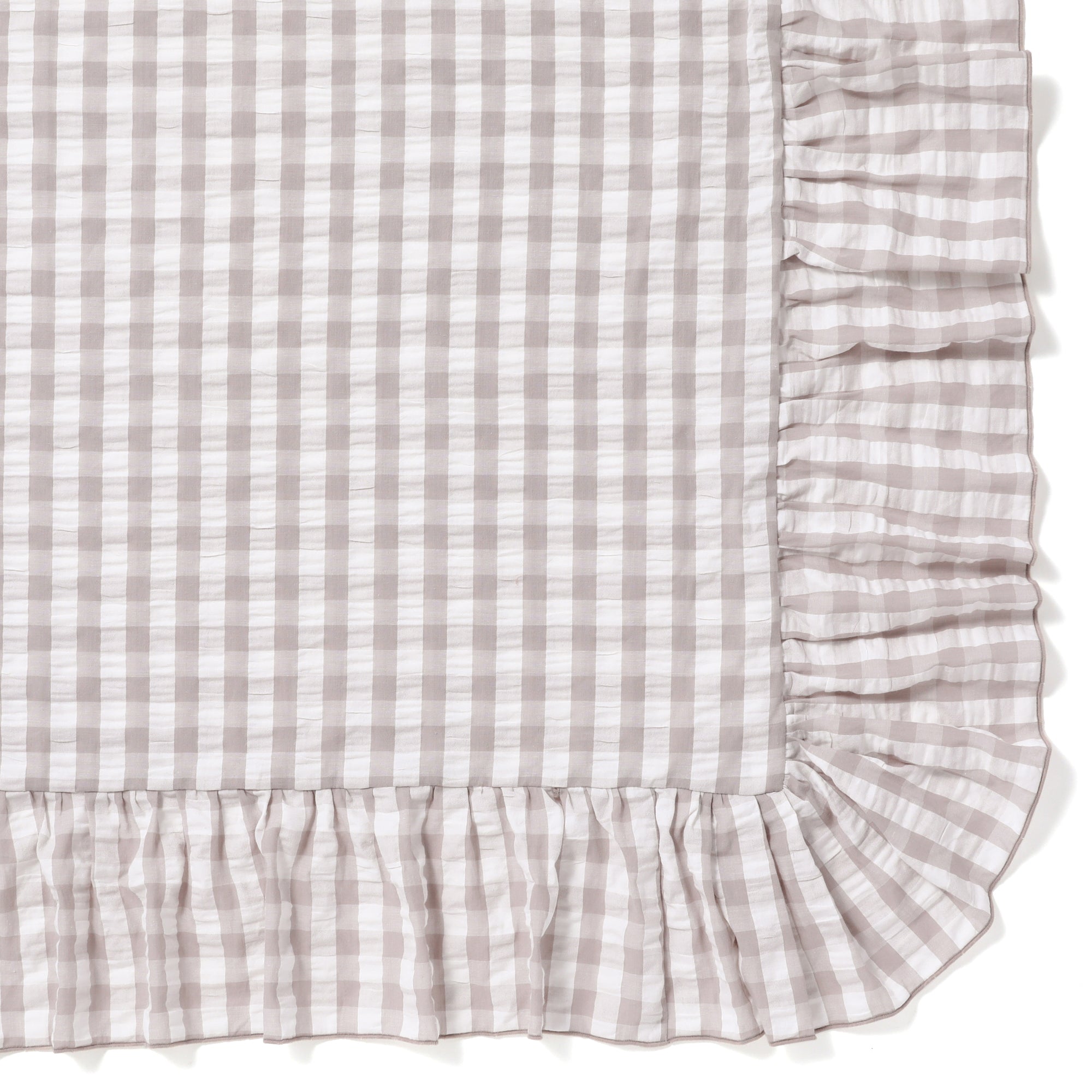 シアサッカー織でチェックを表現したデザインの掛け布団カバーです。周囲にあしらったフリルがかわいらしいデザインです。