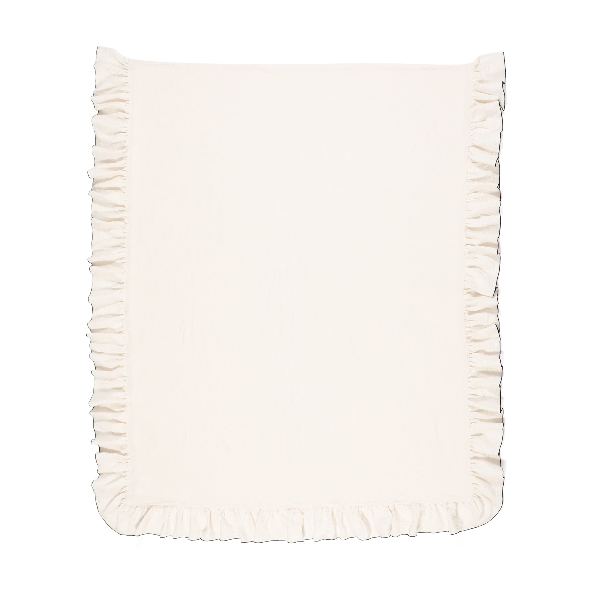 風合い豊かなガーゼ素材を贅沢に使用した、掛け布団カバーです。肌にやさしく馴染むやわらかなガーゼは、素肌に直接触れても気持ちよい、日常的に使いたくなる快適な使い心地です。周囲を華やかなフリルで飾り、フリルの縁はブラックのロック仕上げでアクセントを加えたデザイン。シンプルでありながら、目を引くディテールが魅力です。