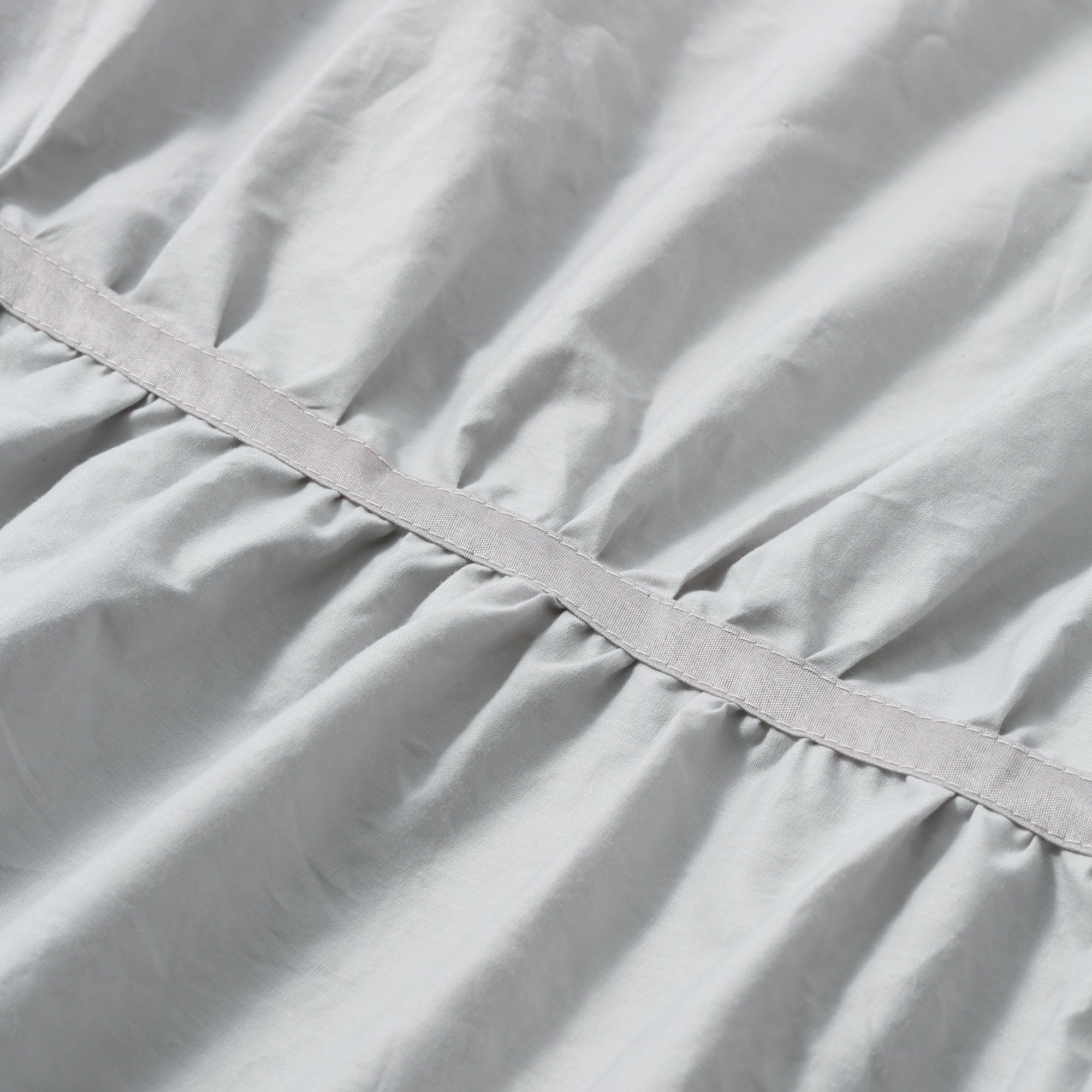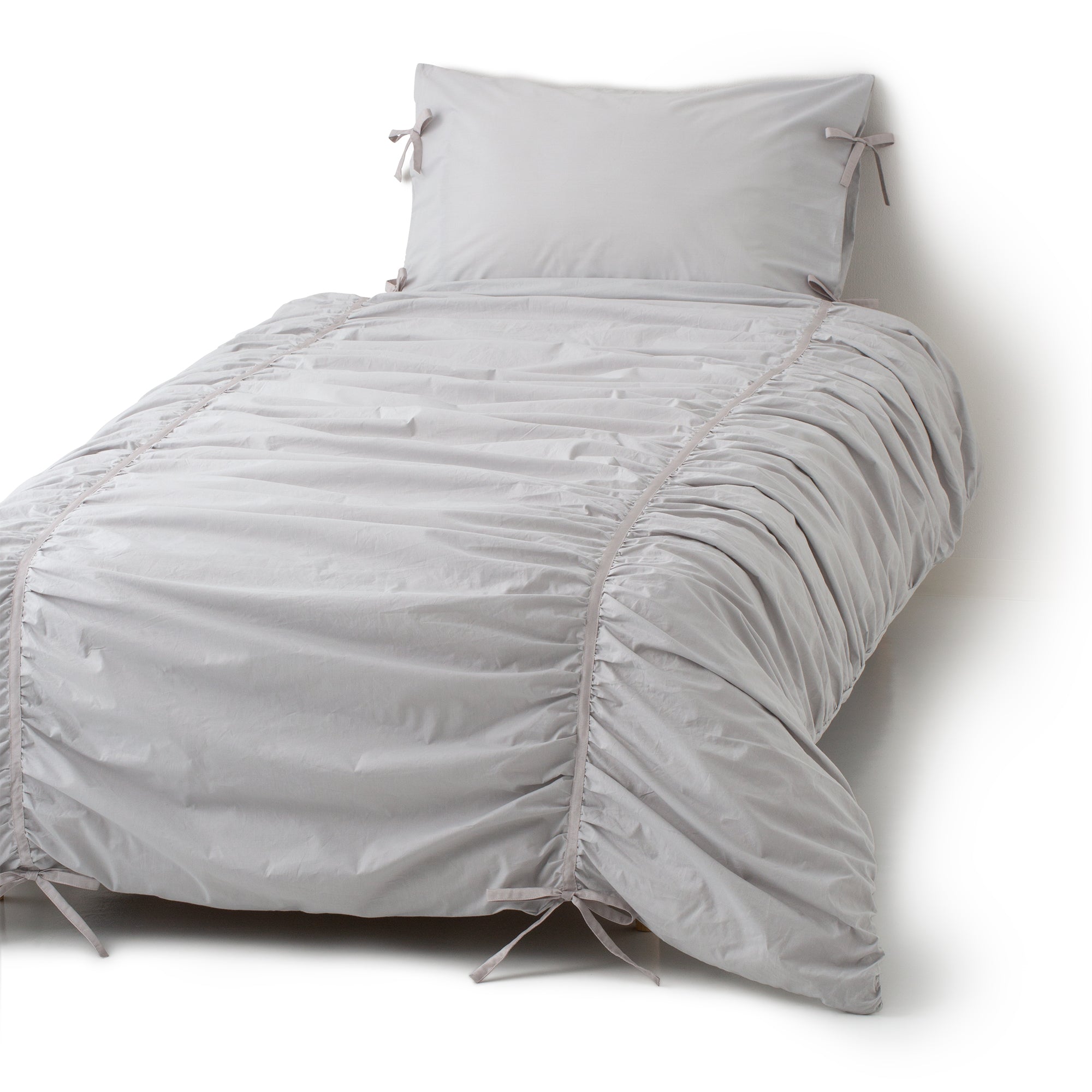 シンプルな白い生地に光沢のあるリボンをあしらったシンプルフェミニンな掛け布団カバーです。リボンでギャザーを寄せているため、見た目にもボリュームがあり、シンプルながら存在感のあるデザインです。白っぽい明るいお部屋によくあう仕上がりです。