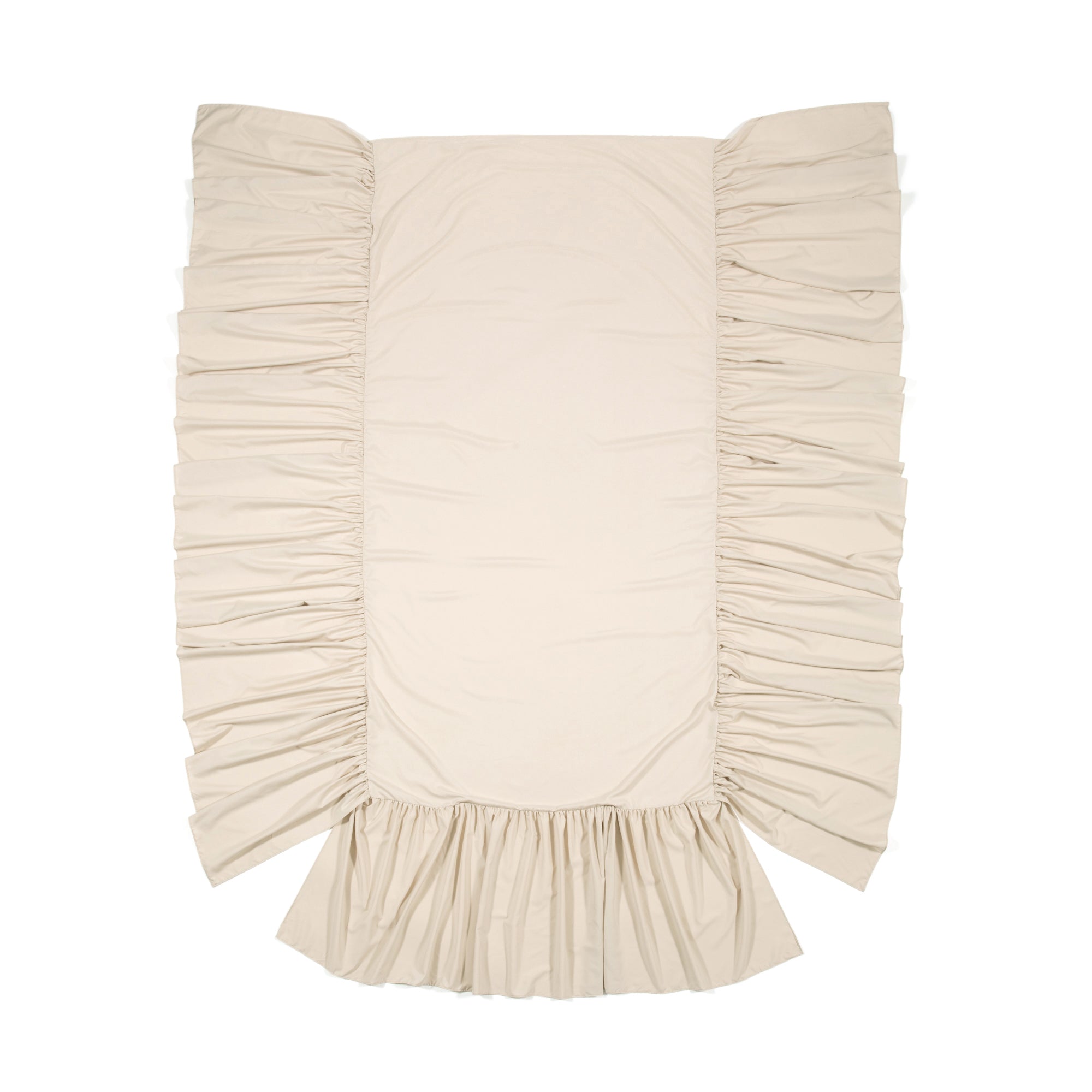 ベッド下をおしゃれに目隠しできるフリル付きシーツです。機能的でありながら、見た目にもナチュラルでかわいいデザインが魅力です。程よい光沢とさらっとした優しい肌触りのある素材感で、心地よい眠りを叶えてくれます。色合いはシンプルながら、ゴージャスにあしらったフリルがとってもキュート。ベッドルームを女性らしくロマンチックに演出します。シーツの3辺に施したたっぷり長めのフリルでベッド下の収納スペースをエレガントにカバーします。