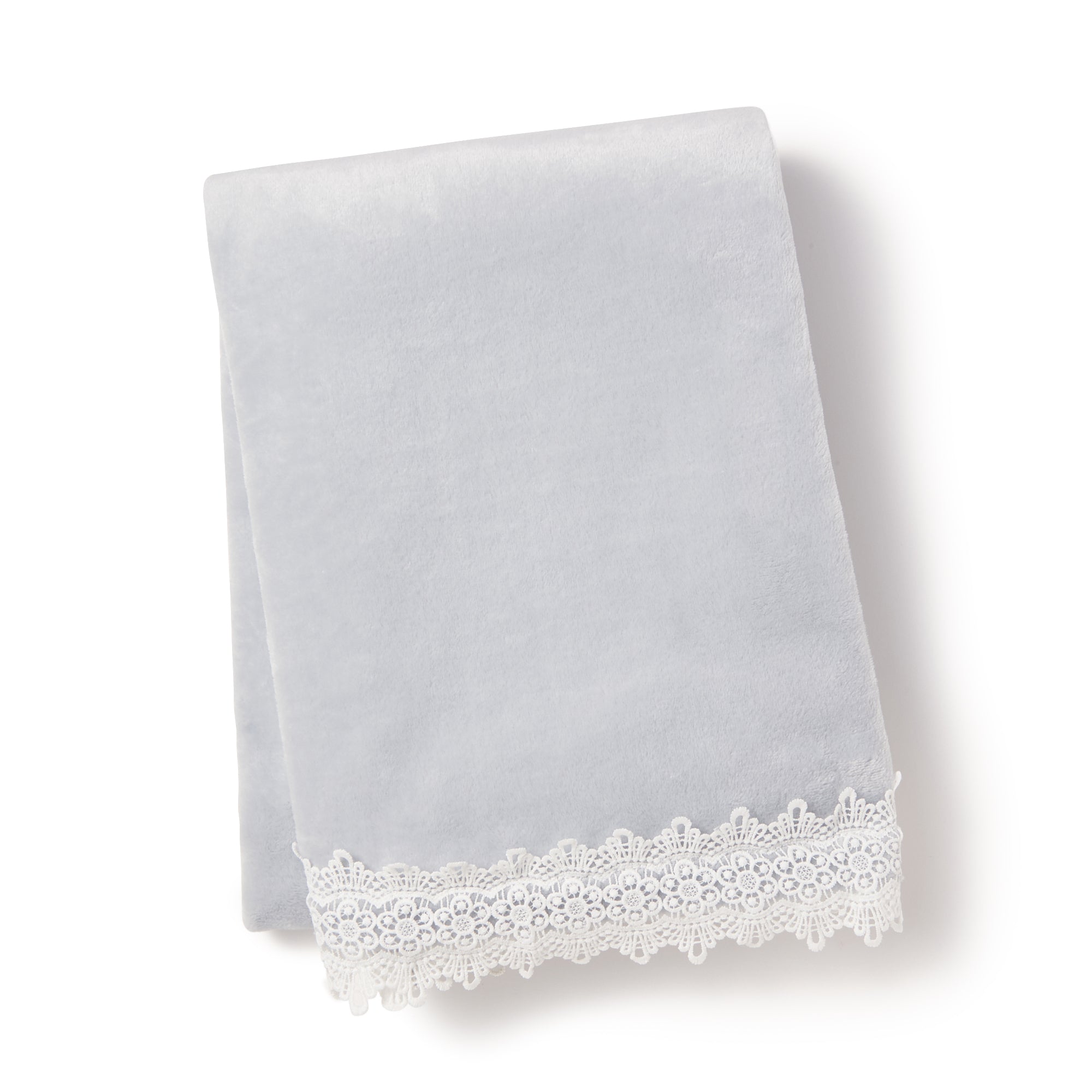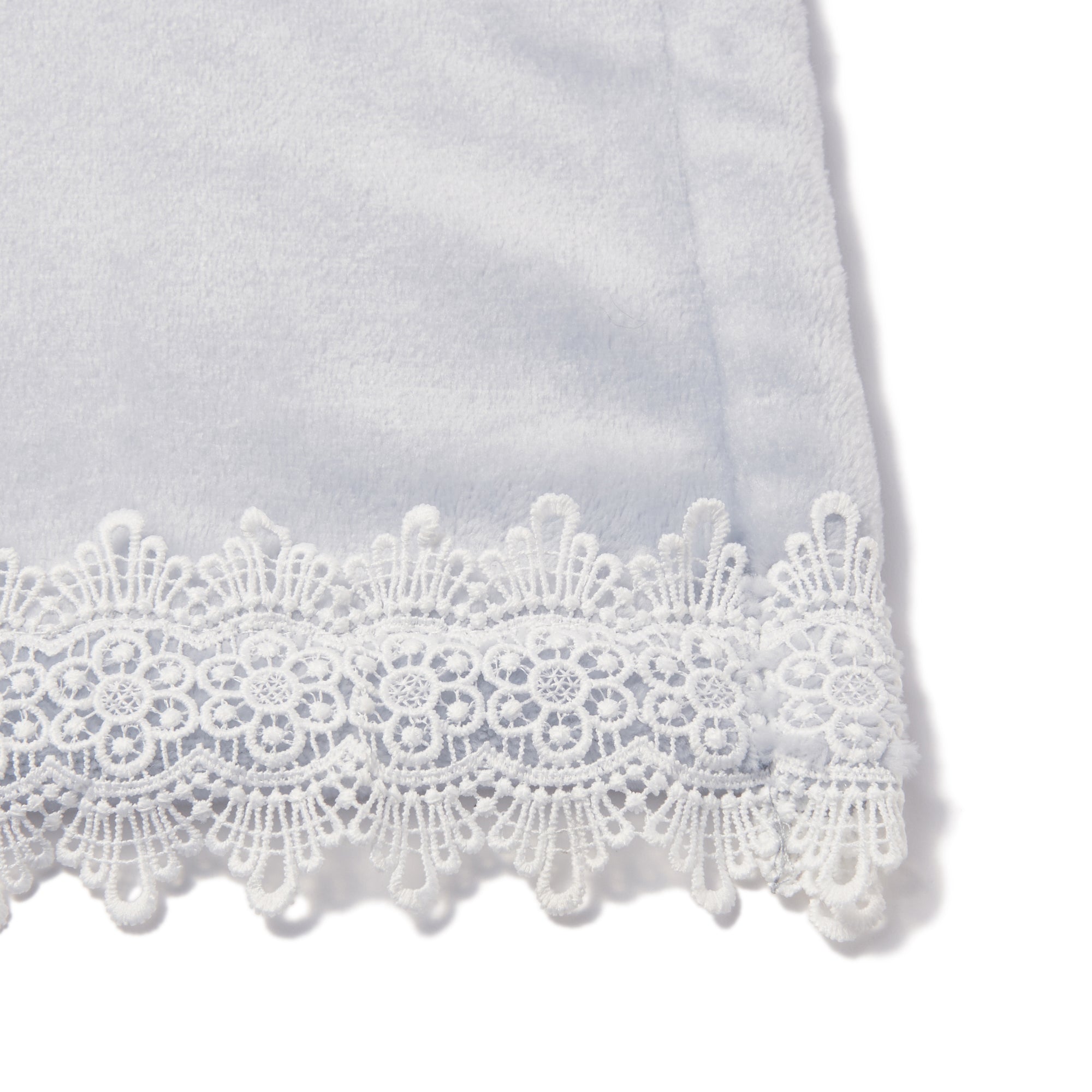 裾のレースがフェミニンでかわいいマイクロファイバースローです。扱いやすい軽さとふわふわなめらかな肌触りが魅力です。お部屋やオフィスでサッと使えて、本格的な冬にも負けない安心の暖かさです。