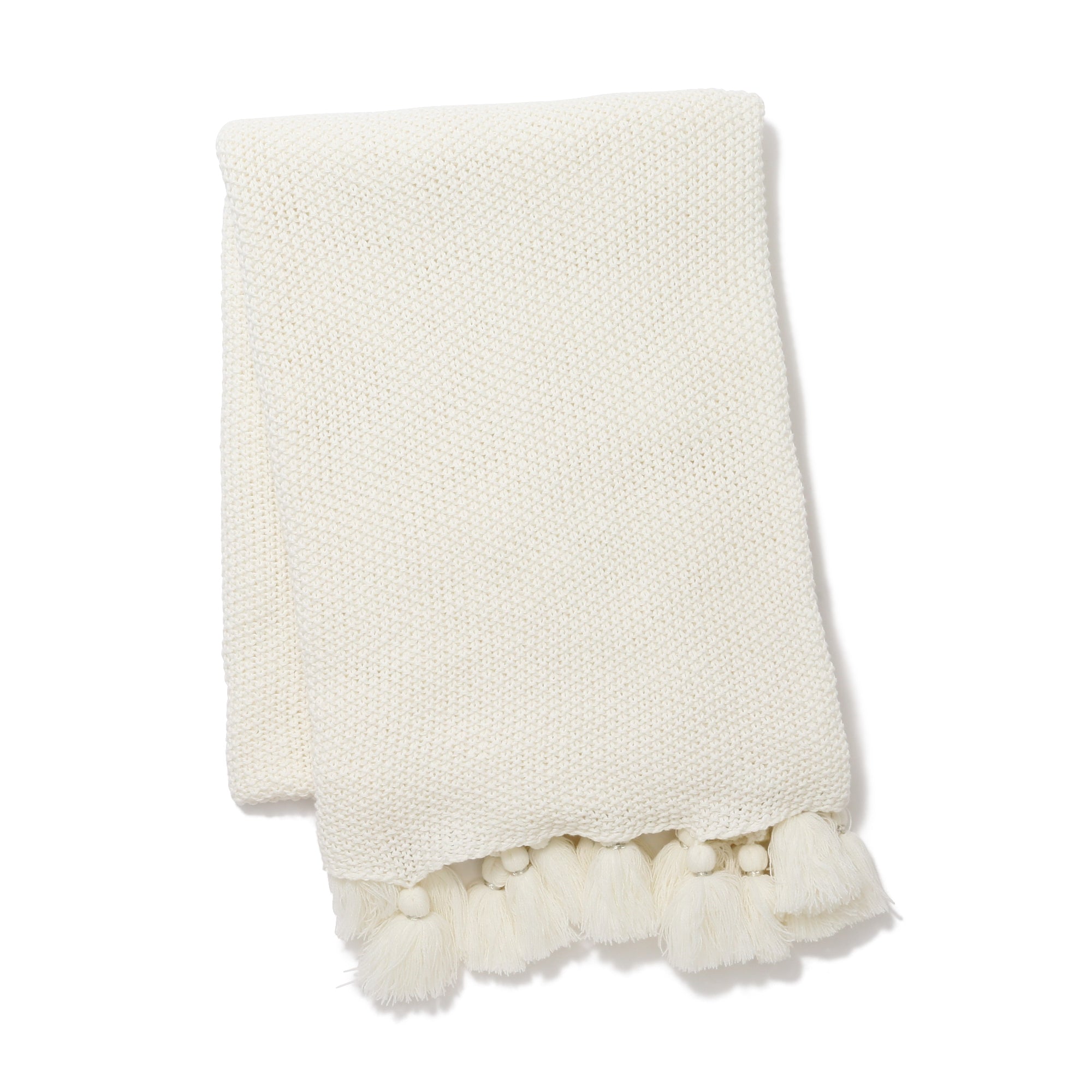 コットン素材の糸を使用したシンプルな鹿の子編みがかわいいニットスローです。ふんわりしたタッセルにメタリック糸のポイントがおしゃれで、お部屋のインテリアとしても、素敵に飾っていただけます。サラッとした肌触りで、夏の時期にピッタリの仕上がりです。