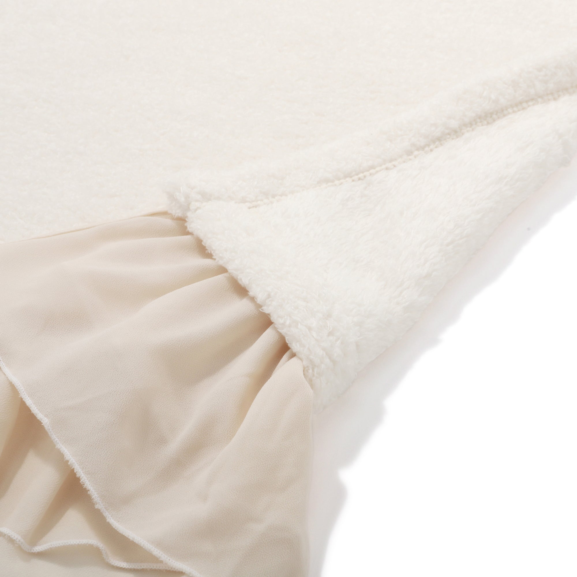 伸び縮みするモコモコ素材に柔らかなシフォン生地のフリルをあしらったスロー(ひざ掛け)です。 ふわふわでやわらかな素材感とフリルの組み合わせがキュート。ずっと触れていたくなる肌触りです。 ソファやベッド周りでのコーディネートはもちろん、オフィスや外出先でも活躍します。