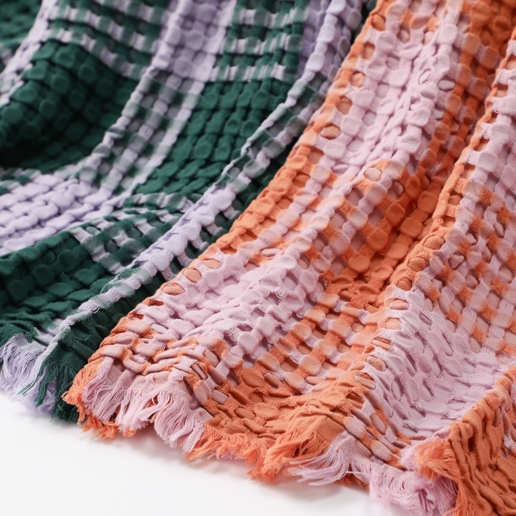 レーヨンを混ぜたことで、しっとりなめらかな肌触りが楽しめるワッフル織りのスロー(ひざ掛け)です。大きめのワッフルにブロックチェック柄を落ち着いた色味でデザインしました。暖かい季節も冷房対策などに大活躍のアイテムです。