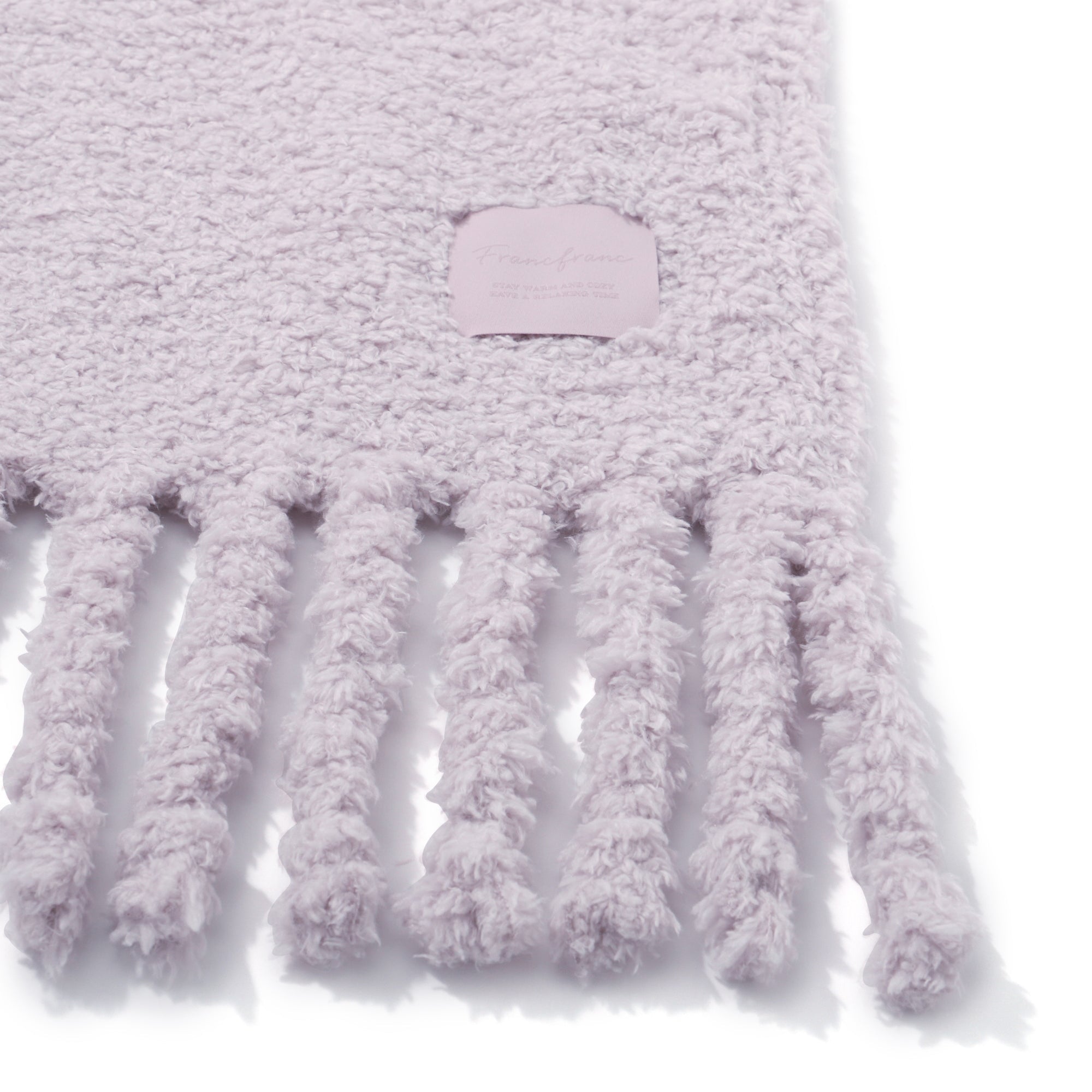 ふわふわもこもこのやわらかな触り心地のスロー(ひざ掛け)です。シーンを選ばず使えるカラーで、両端の大きなフリンジがアクセントになっています。