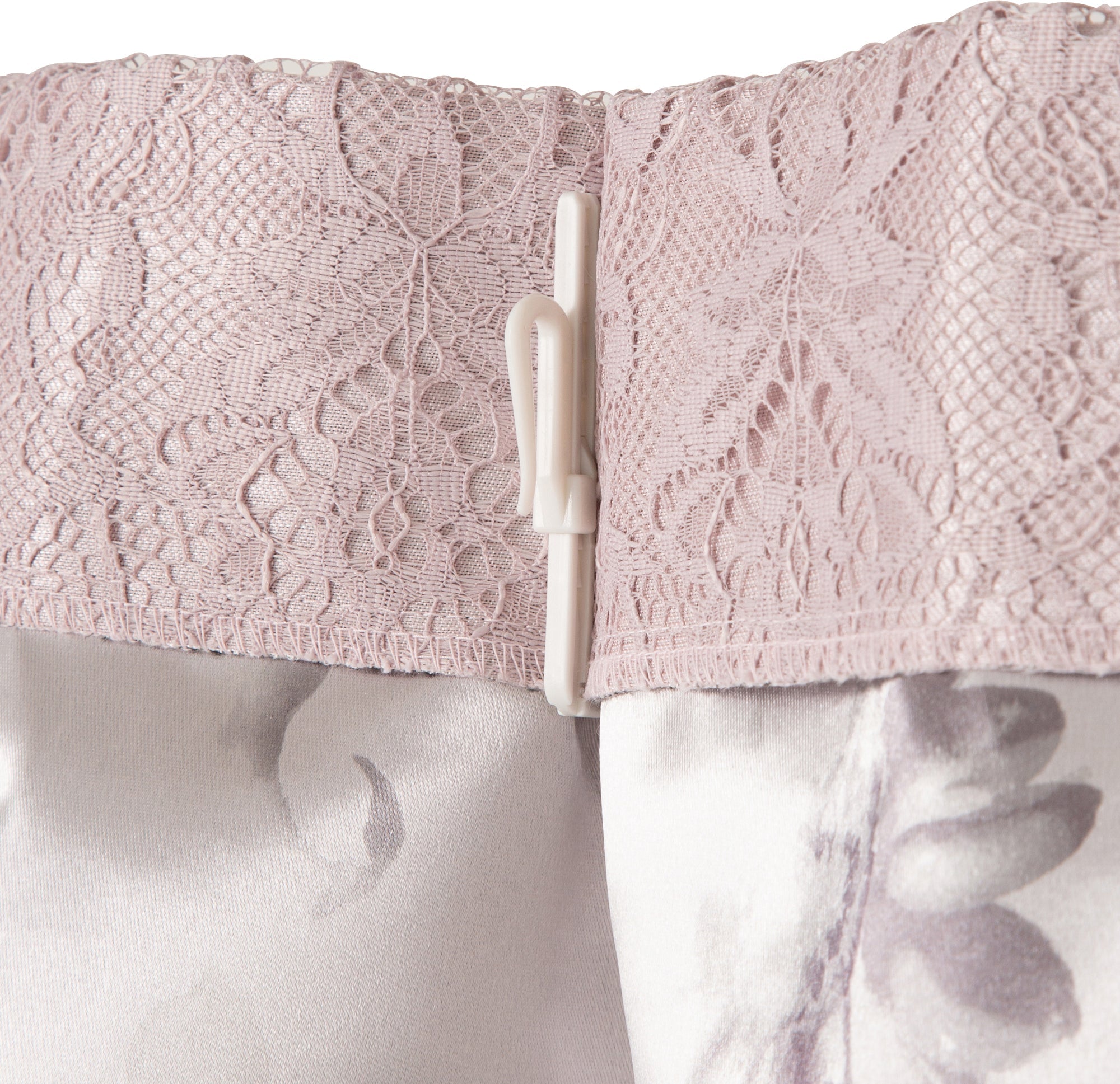 レースとドレープがもともと2重になっている、新しいタイプのカーテンです。 フェミニンなレースと光沢のあるドレープを重ねる事で、ドレスのような女性らしいデザインとなっています。 レースのみをまとめればドレープとして、ドレープのみをまとめればレースとしてご使用いただけます。 ※カーテンは全て1枚での販売です。2枚入りではございません。 ※こちらの商品は店舗でのイージーオーダー対象外です。 ドレープの裏面にはシックな花柄がプリントされております。 カーテンをまとめたときや風が吹いたときにチラッと見える花柄がまた違った印象を与えてくれます。 一枚で、様々な表情が楽しめるカーテンです。 付属のフックで約5.5㎝長さの調節が可能です。