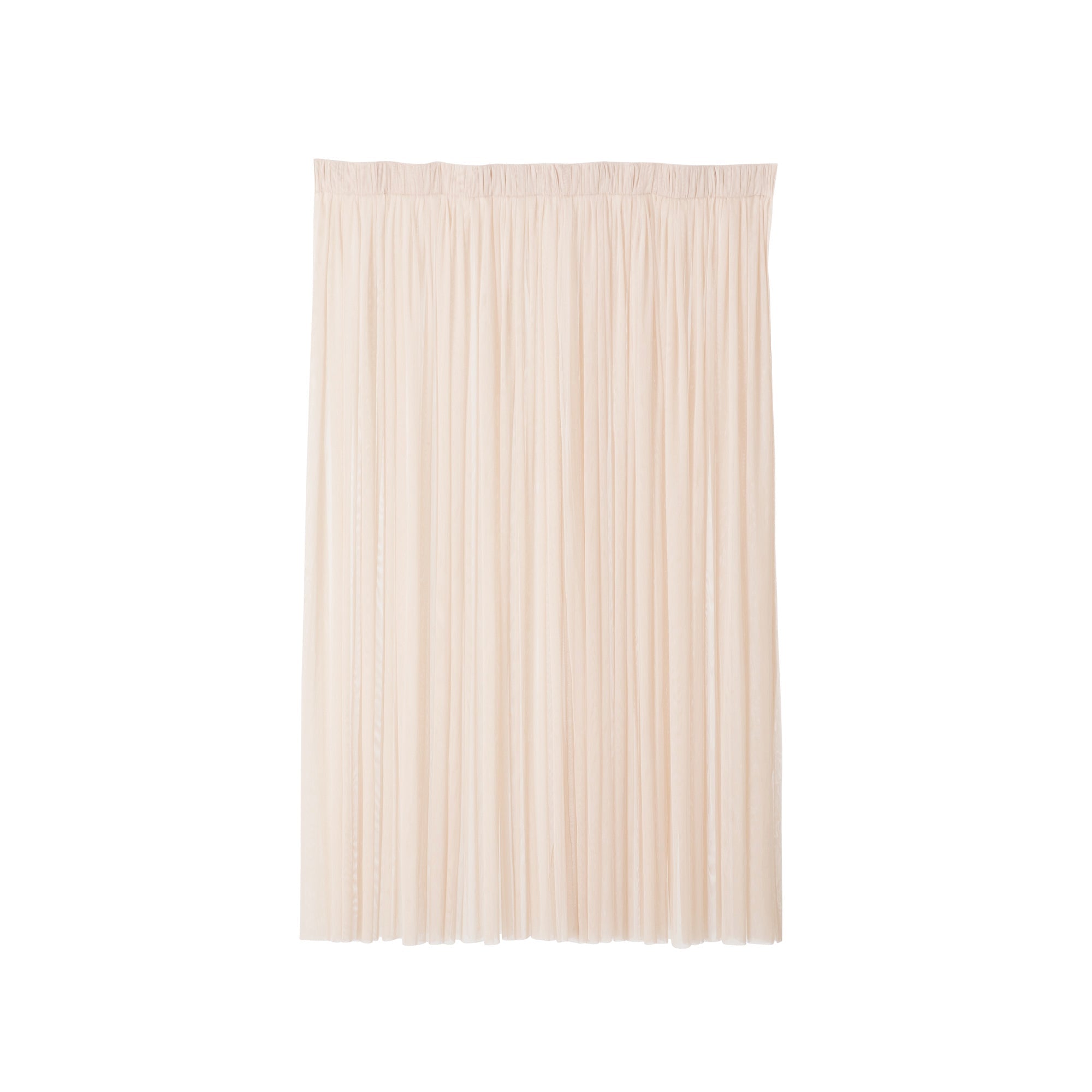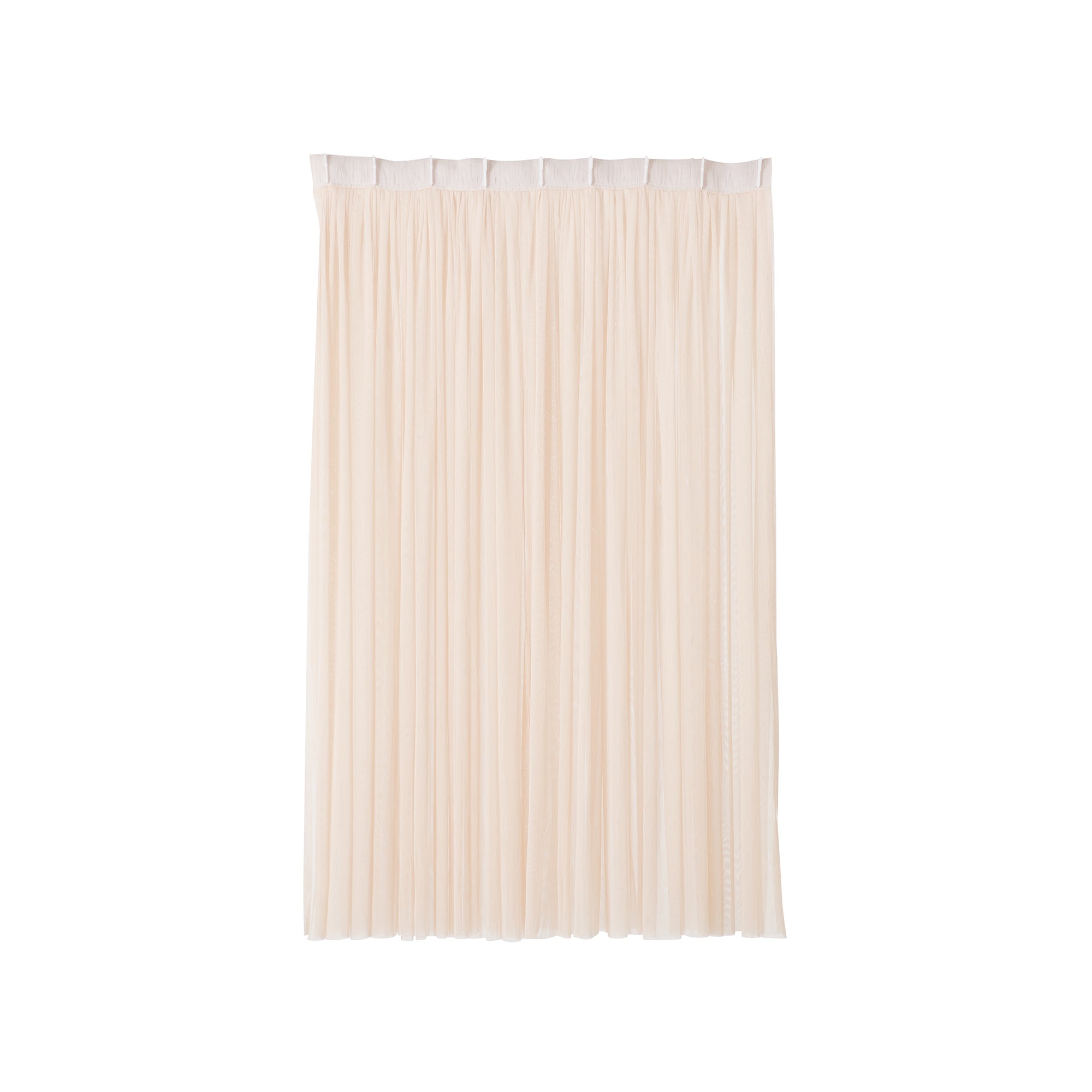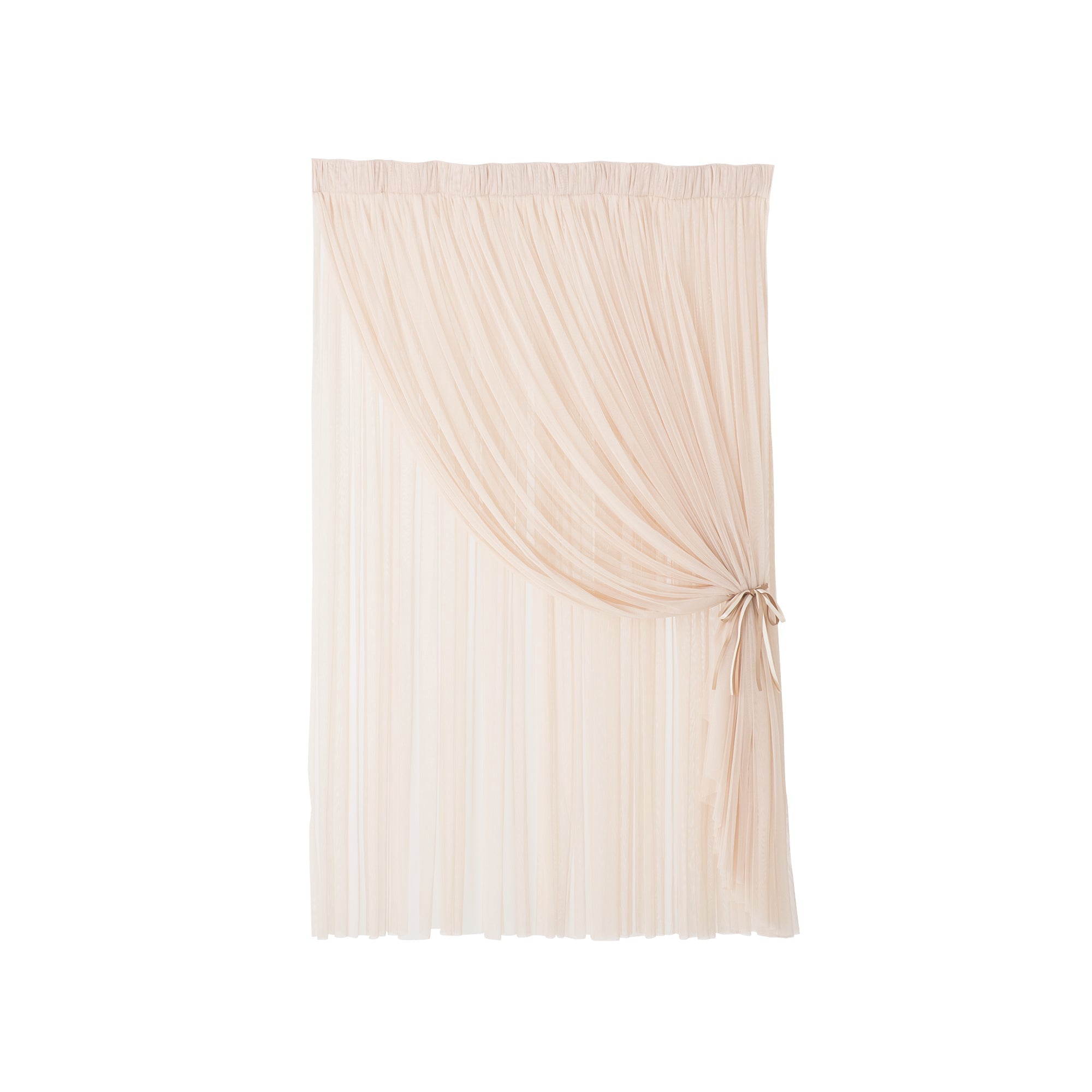ボリュームたっぷりのチュールを2枚重ねにした、お部屋の主役になれるカーテンです。前後あわせて12mの生地を使用しているため、レース生地でありながら薄地のドレープと同程度のほどよい透け感が楽しめます。細い3本のリボンをタッセル仕様にして、エレガントにもスウィートにもコーディネートできるアイテムに仕上げました。二重縫製の作りを活かし、手前側のチュールだけをリボンでまとめると新たな表情が楽しめます。※カーテンは全て1枚での販売です。2枚入りではございません。