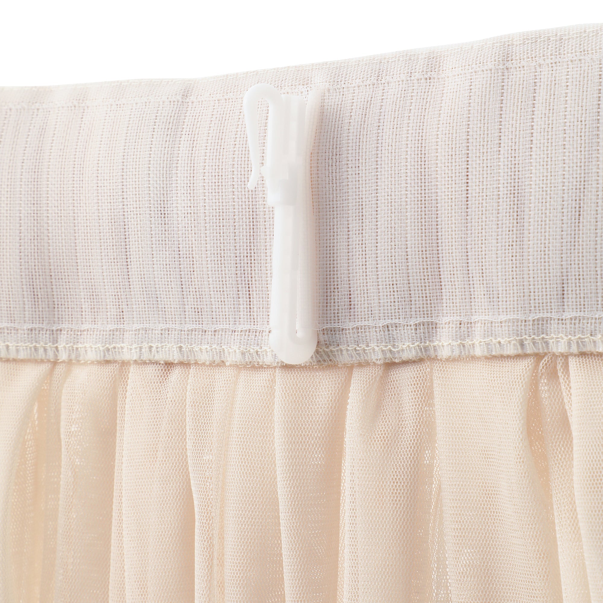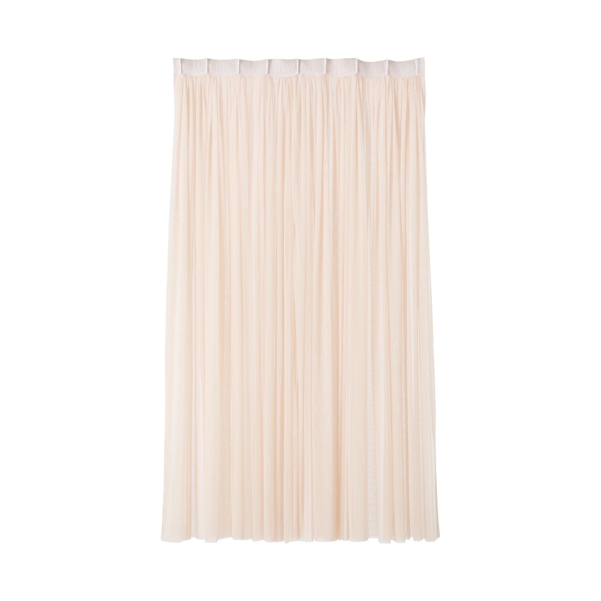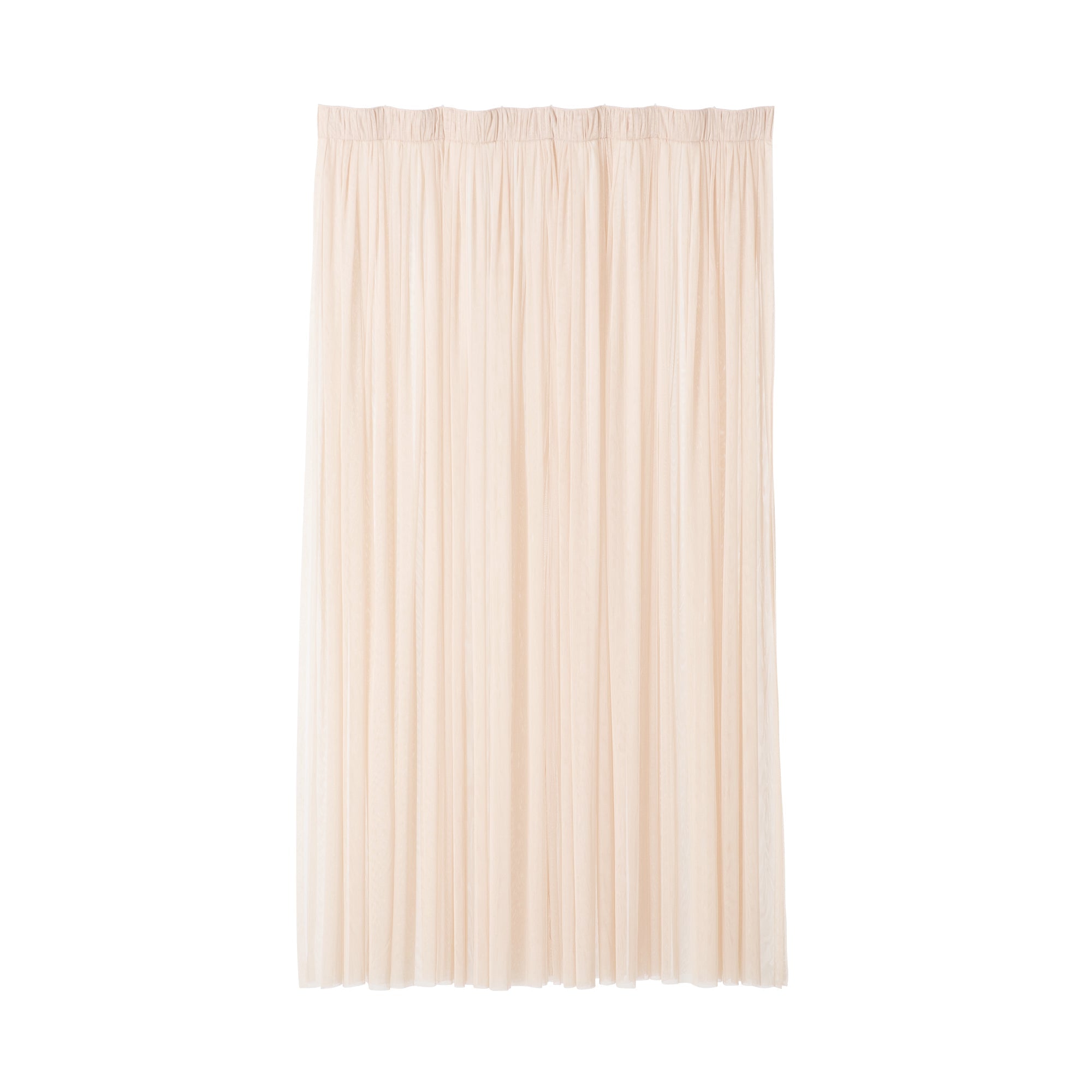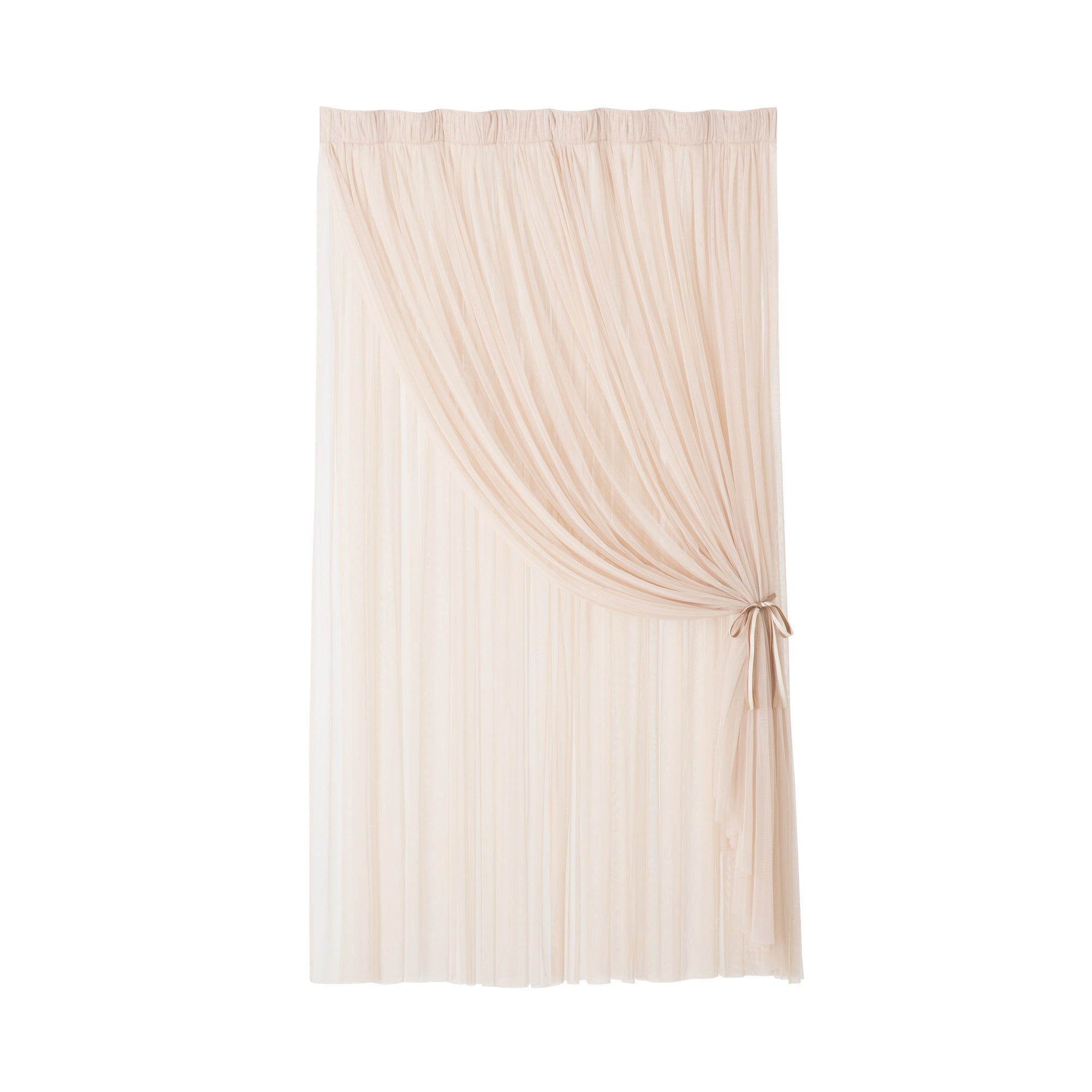 ボリュームたっぷりのチュールを2枚重ねにした、お部屋の主役になれるカーテンです。前後あわせて12mの生地を使用しているため、レース生地でありながら薄地のドレープと同程度のほどよい透け感が楽しめます。細い3本のリボンをタッセル仕様にして、エレガントにもスウィートにもコーディネートできるアイテムに仕上げました。二重縫製の作りを活かし、手前側のチュールだけをリボンでまとめると新たな表情が楽しめます。※カーテンは全て1枚での販売です。2枚入りではございません。