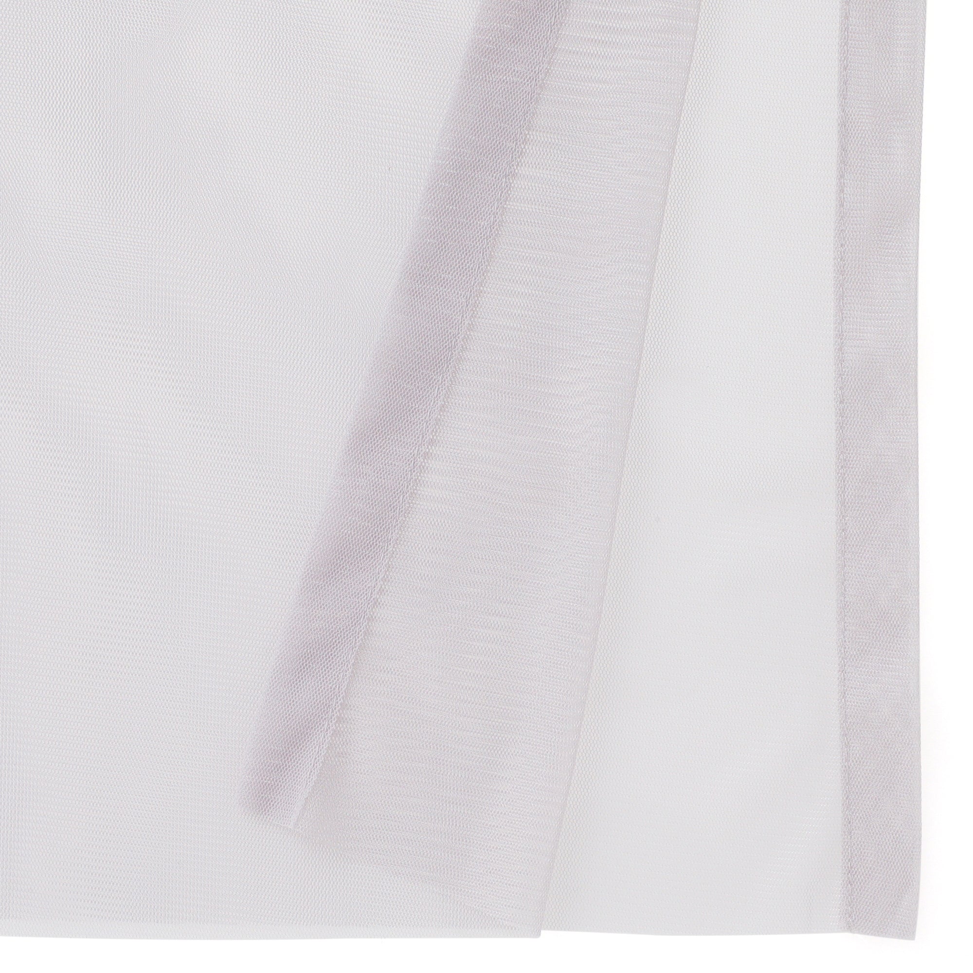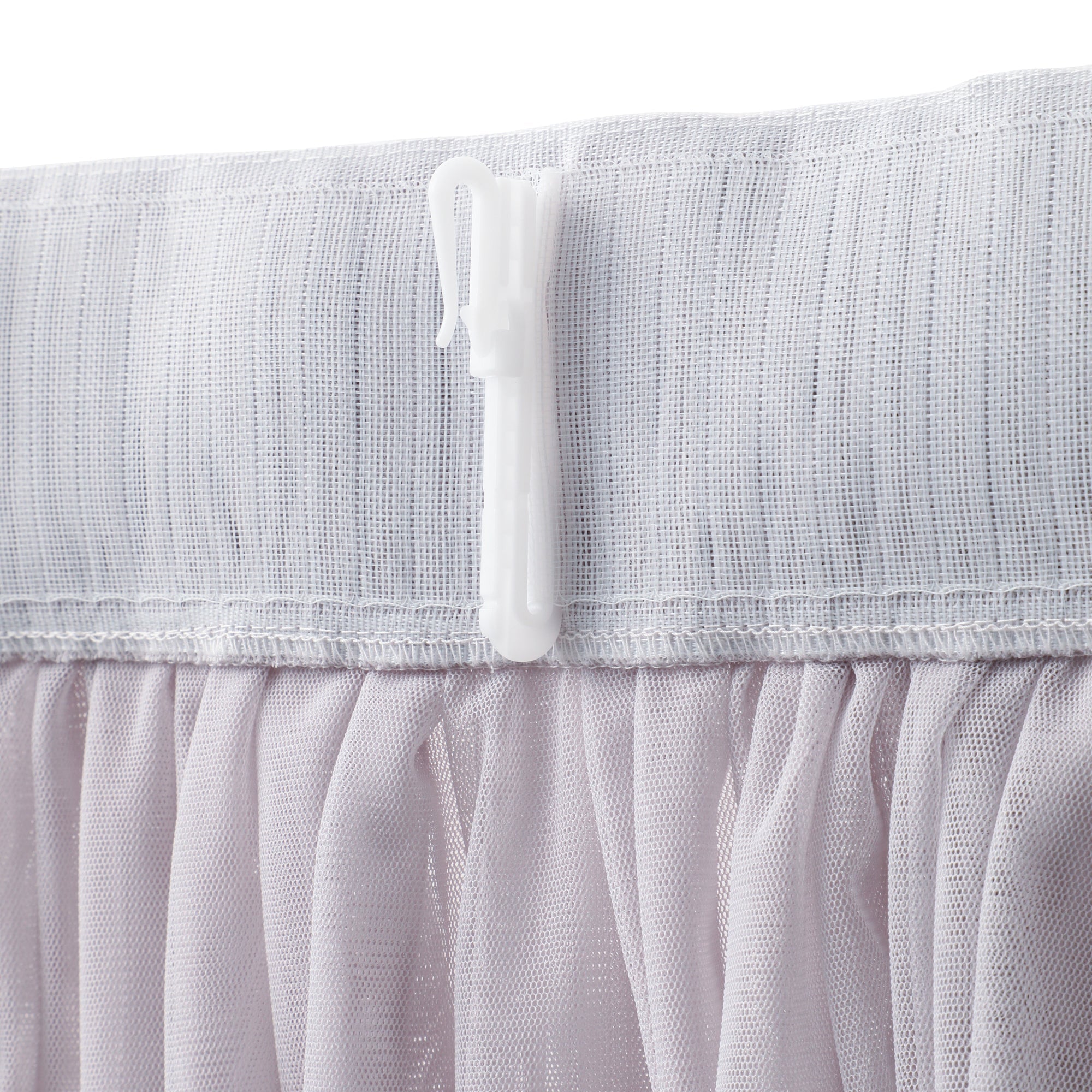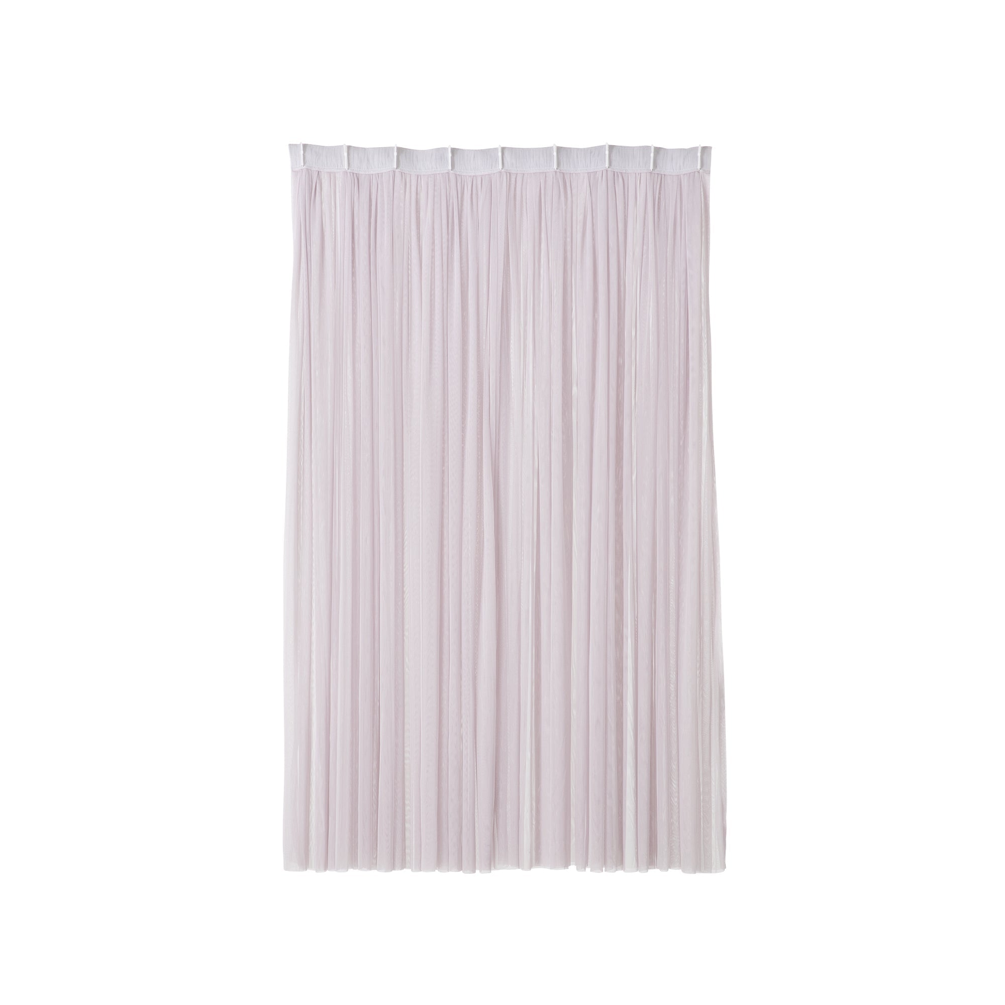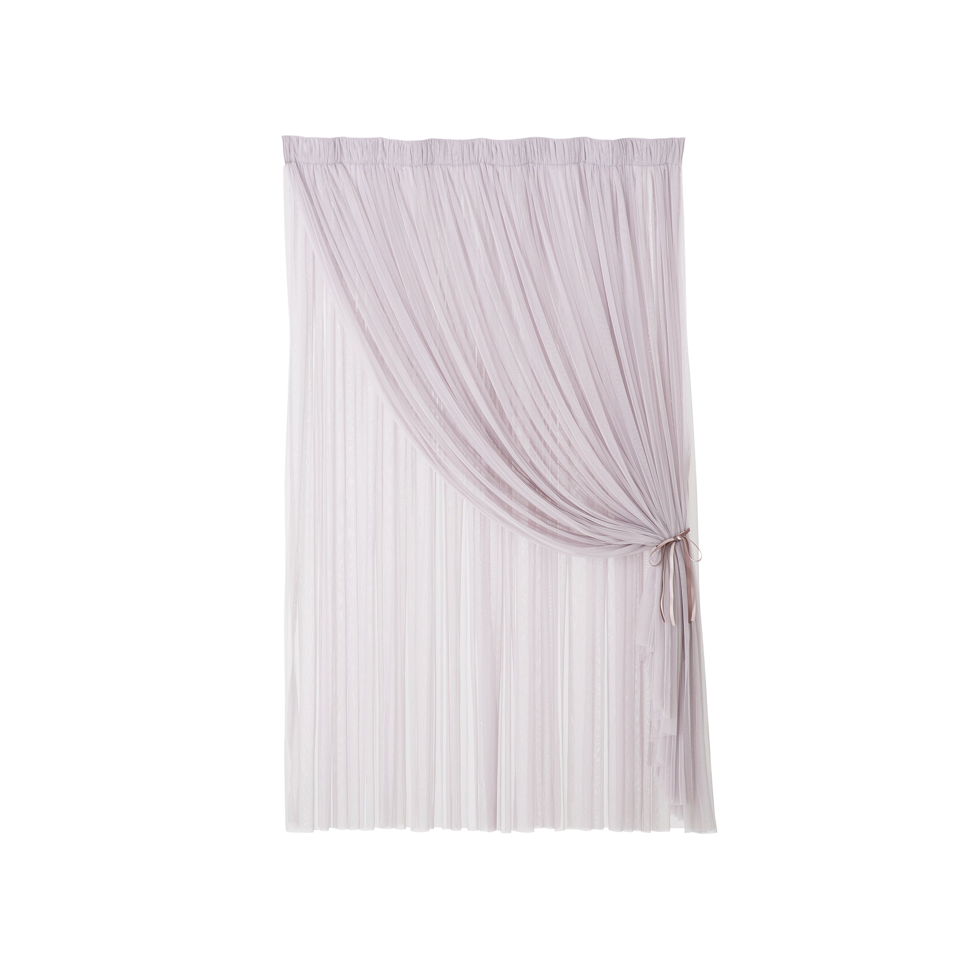 ボリュームたっぷりのチュールを2枚重ねにした、お部屋の主役になれるカーテンです。前後あわせて12mの生地を使用しているため、レース生地でありながら薄地のドレープと同程度のほどよい透け感が楽しめます。細い3本のリボンをタッセル仕様にして、エレガントにもスウィートにもコーディネートできるアイテムに仕上げました。二重縫製の作りを活かし、手前側のチュールだけをリボンでまとめると新たな表情が楽しめます。※カーテンは全て1枚での販売です。2枚入りではございません。