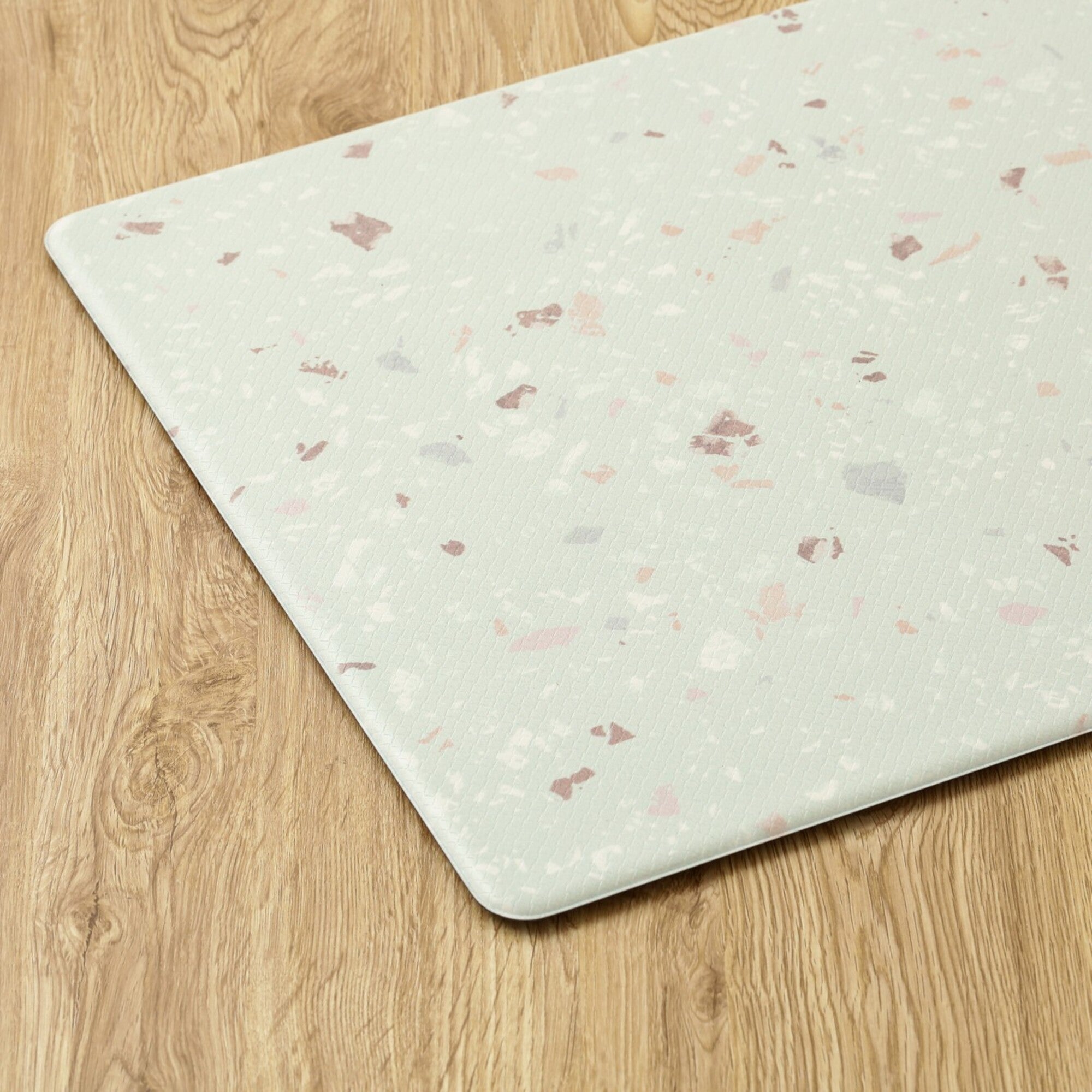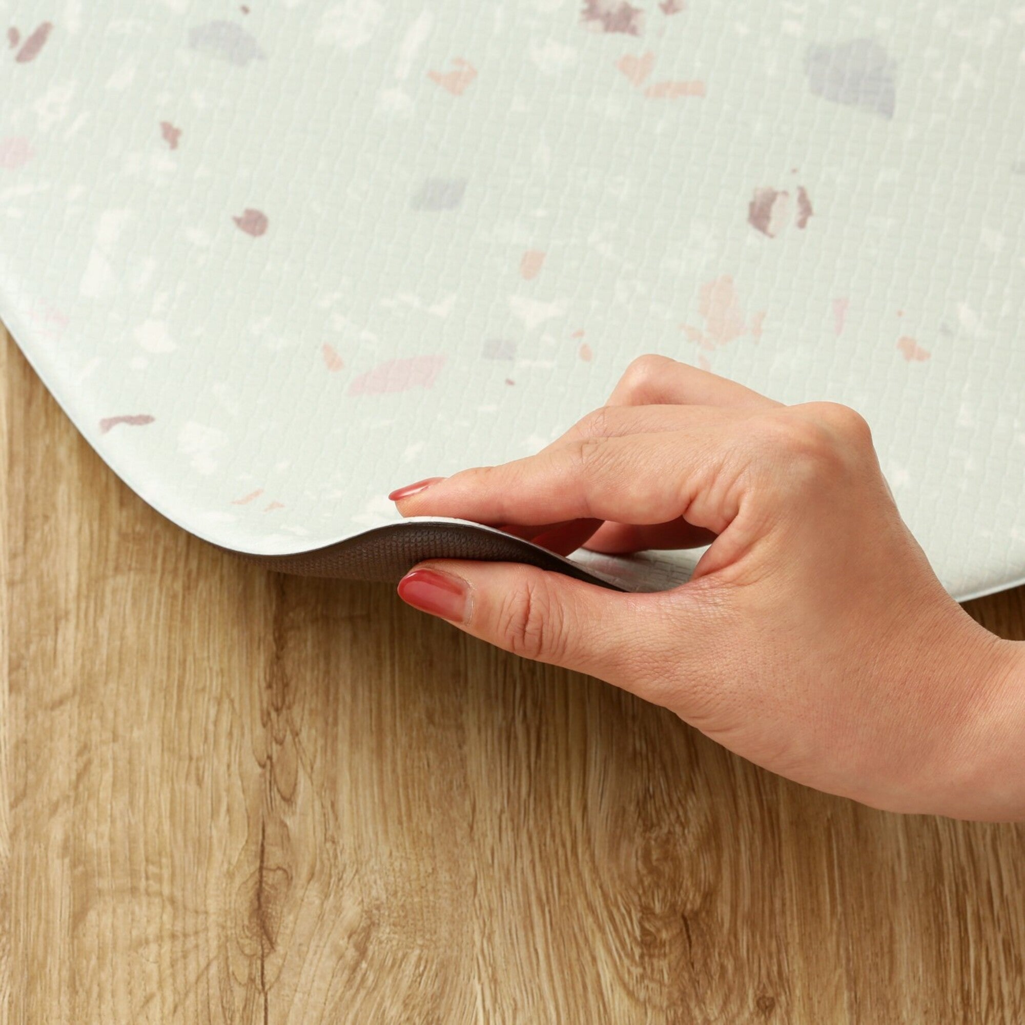 拭けば汚れが落ちる、お手入れ簡単なキッチンマットです。8mmの厚みのクッション性のあるもちもちとした気持ち良い感触で、足への負担も軽減できます。滑り止め付きなのでずれずに安心してご使用いただけます。抗菌・防臭・防カビ加工つき。