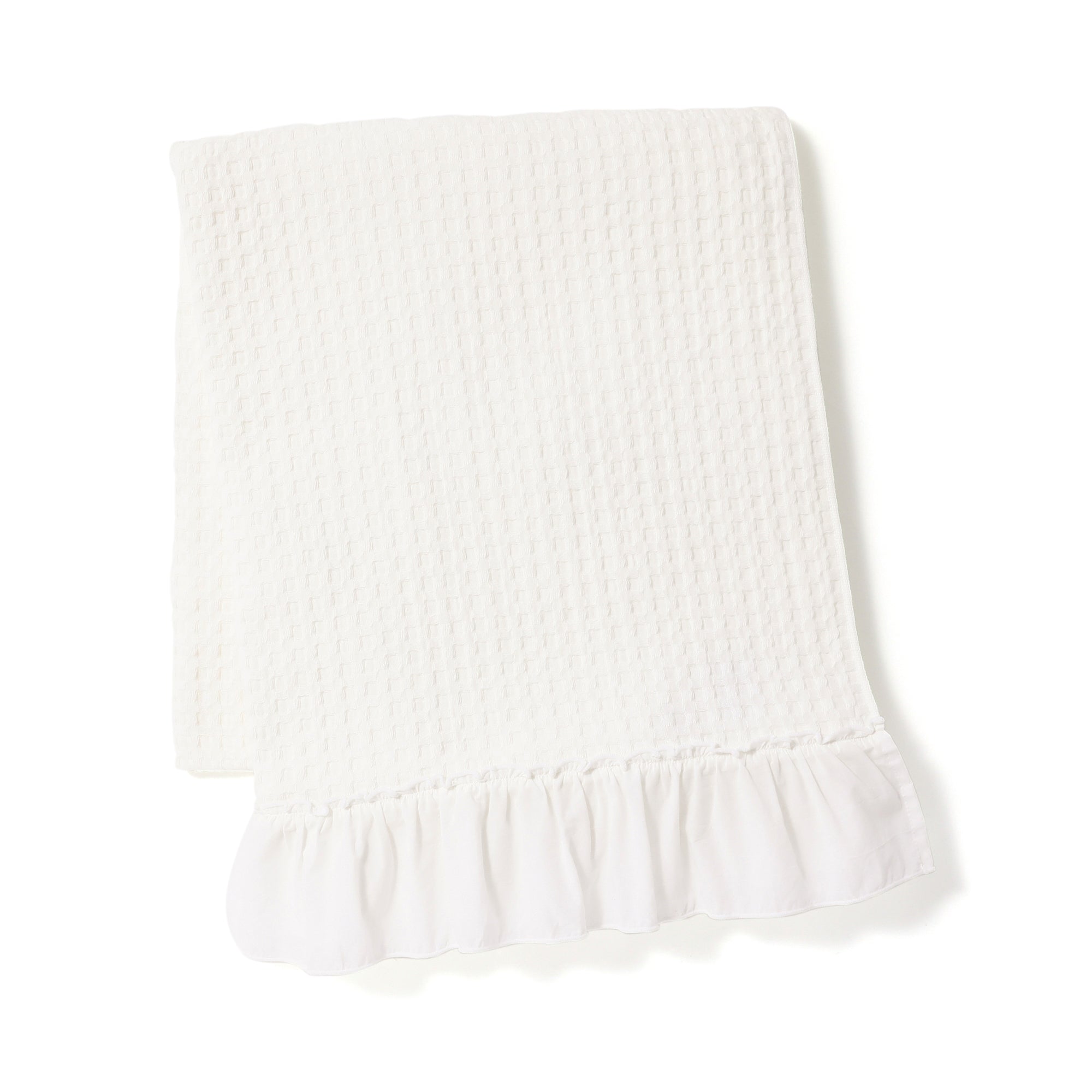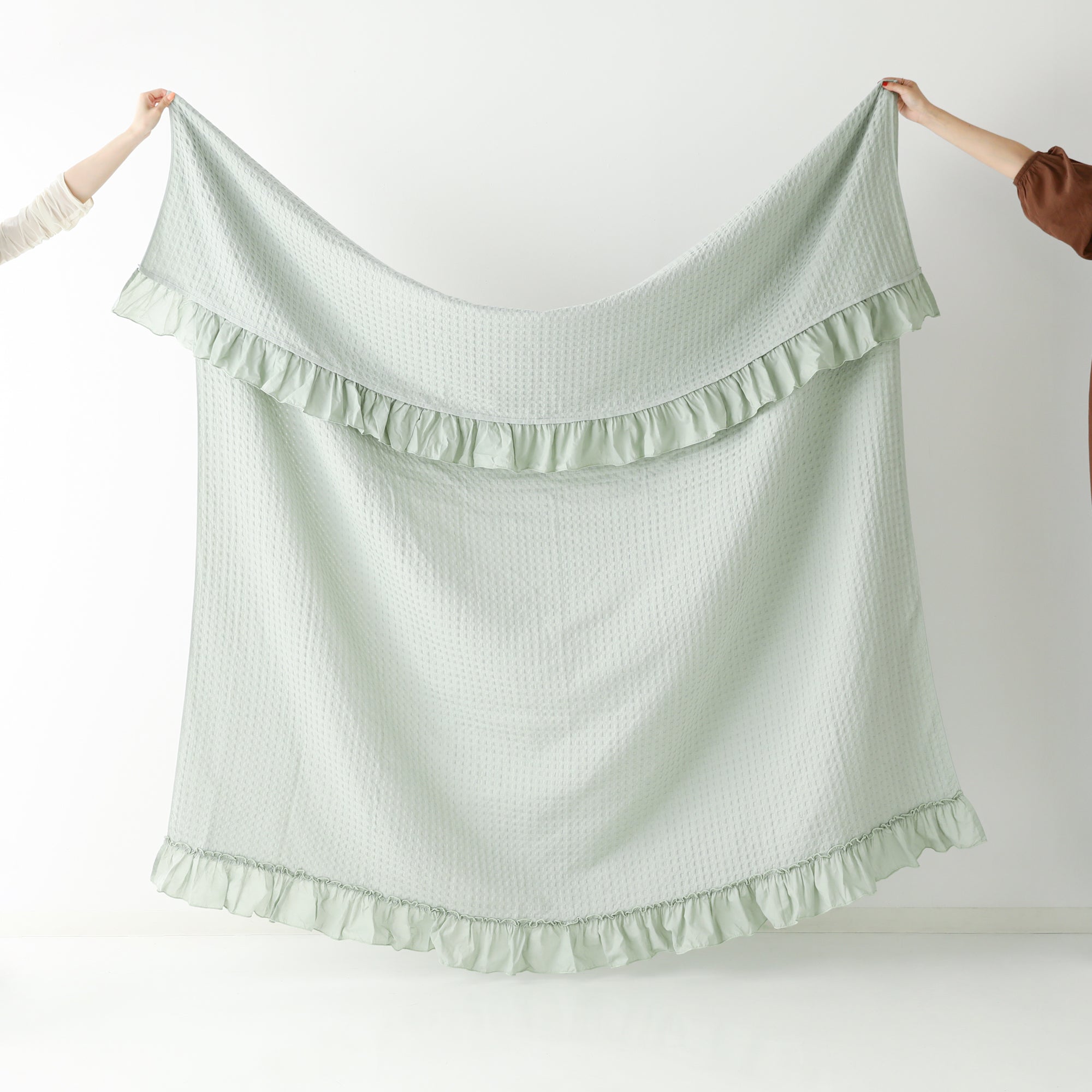 韓国風ナチュラルコーディネートにぴったりなワッフル織りのサマーブランケットです。綿100%で通気性がよく、さらっとした肌触り。伸縮性があり、心地よく包み込んでくれます。ナチュラルテイストの寝具とのコーディネートがおすすめ。上下についたフリルがアクセントです。おうちで洗濯できるのも嬉しいポイントです。