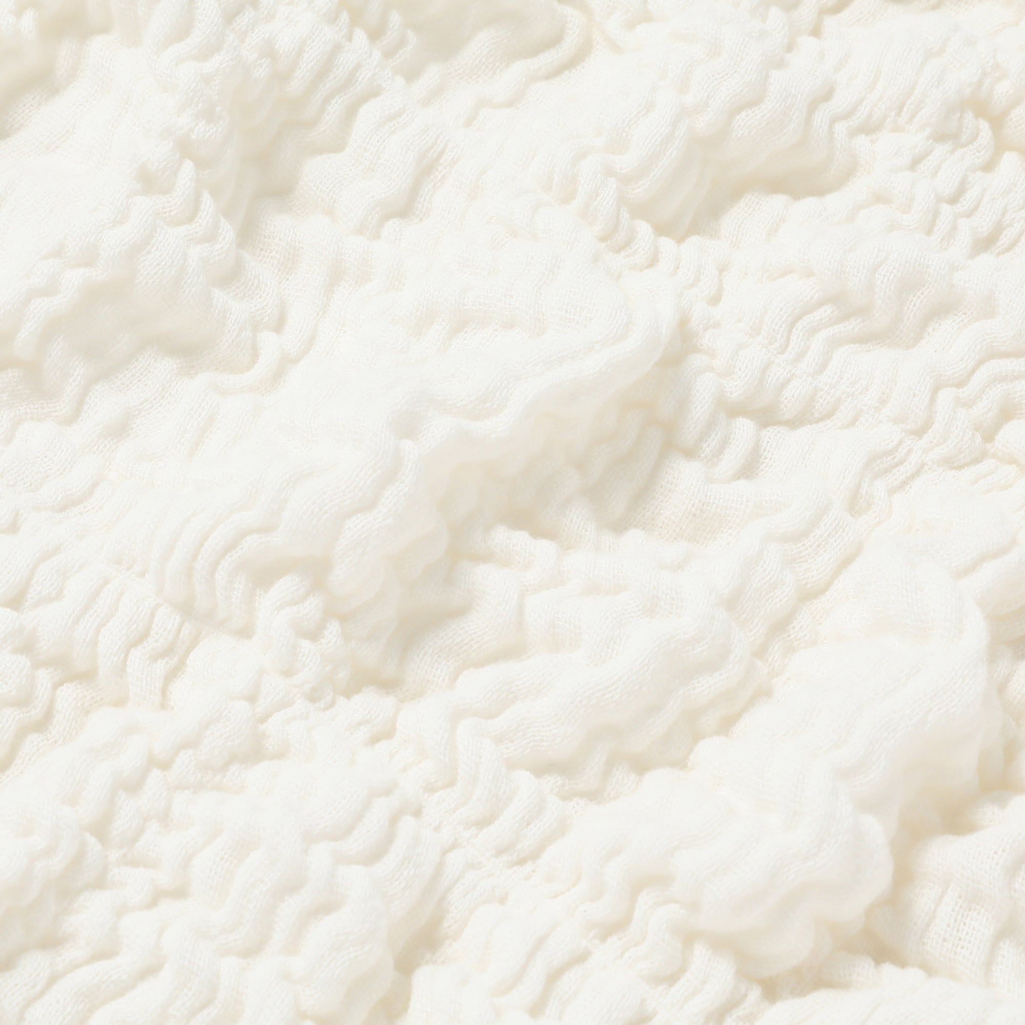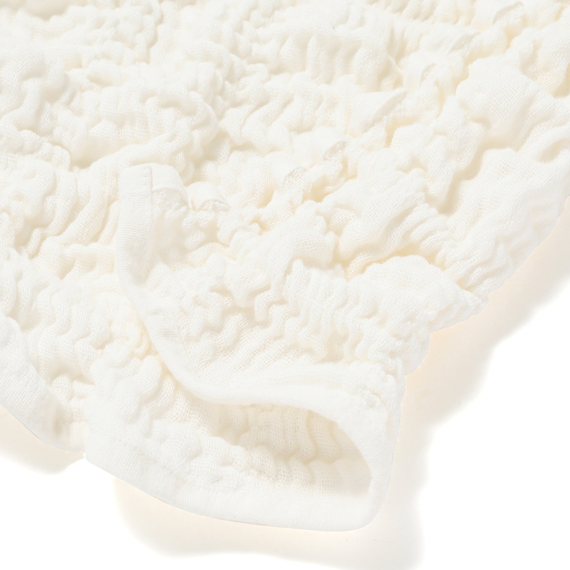 くしゅくしゅとした見た目がかわいらしいサマーブランケットです。伸縮性のある糸を織り込むことによって独特のくしゅくしゅとしたテクスチャーを表現しています。肌離れがよく、ムレを逃がしやすい、気持ちのいい肌触りに仕上げました。おうちで洗濯ができるのも嬉しいポイント。3色展開なのでお部屋のテイストに合わせてお選びいただけます。