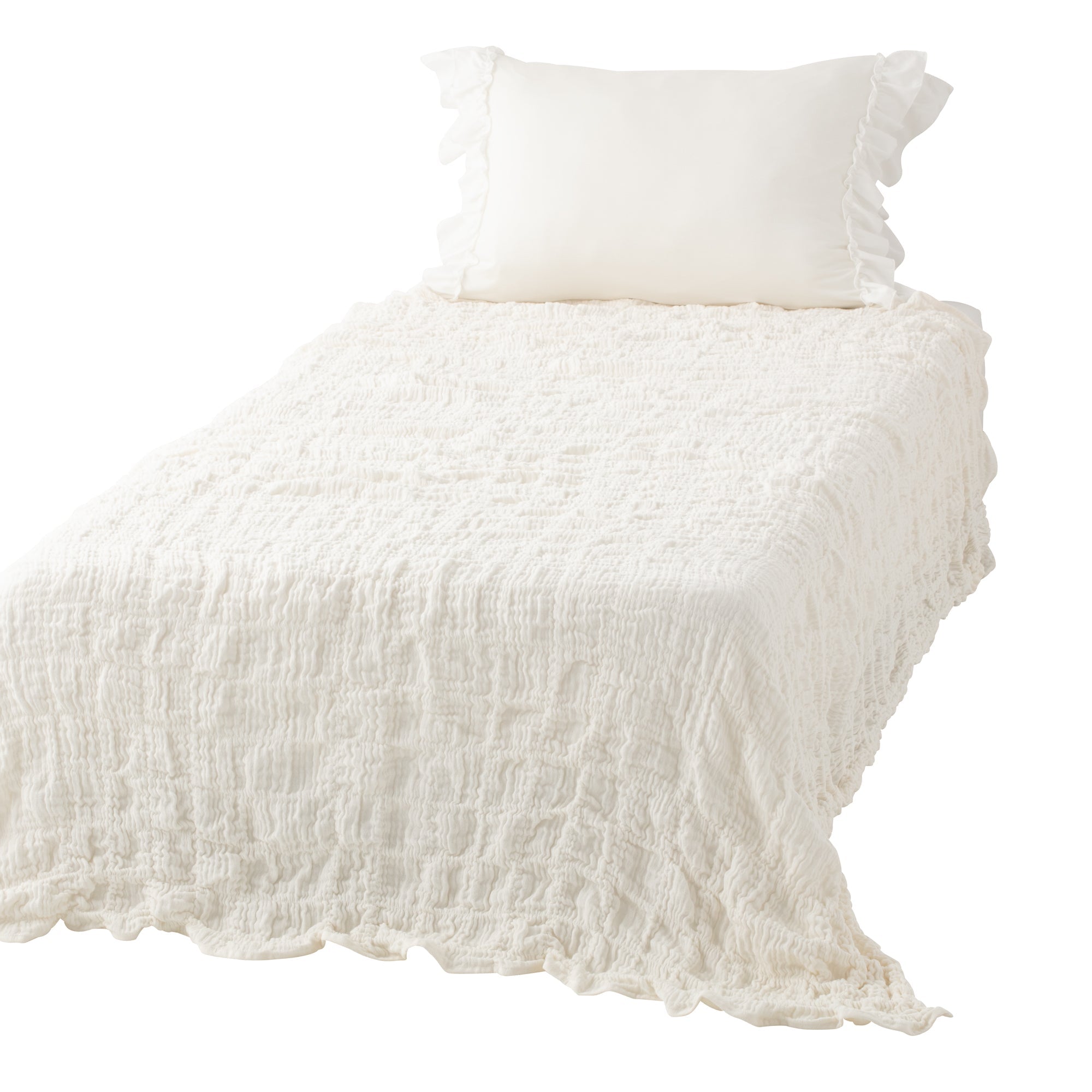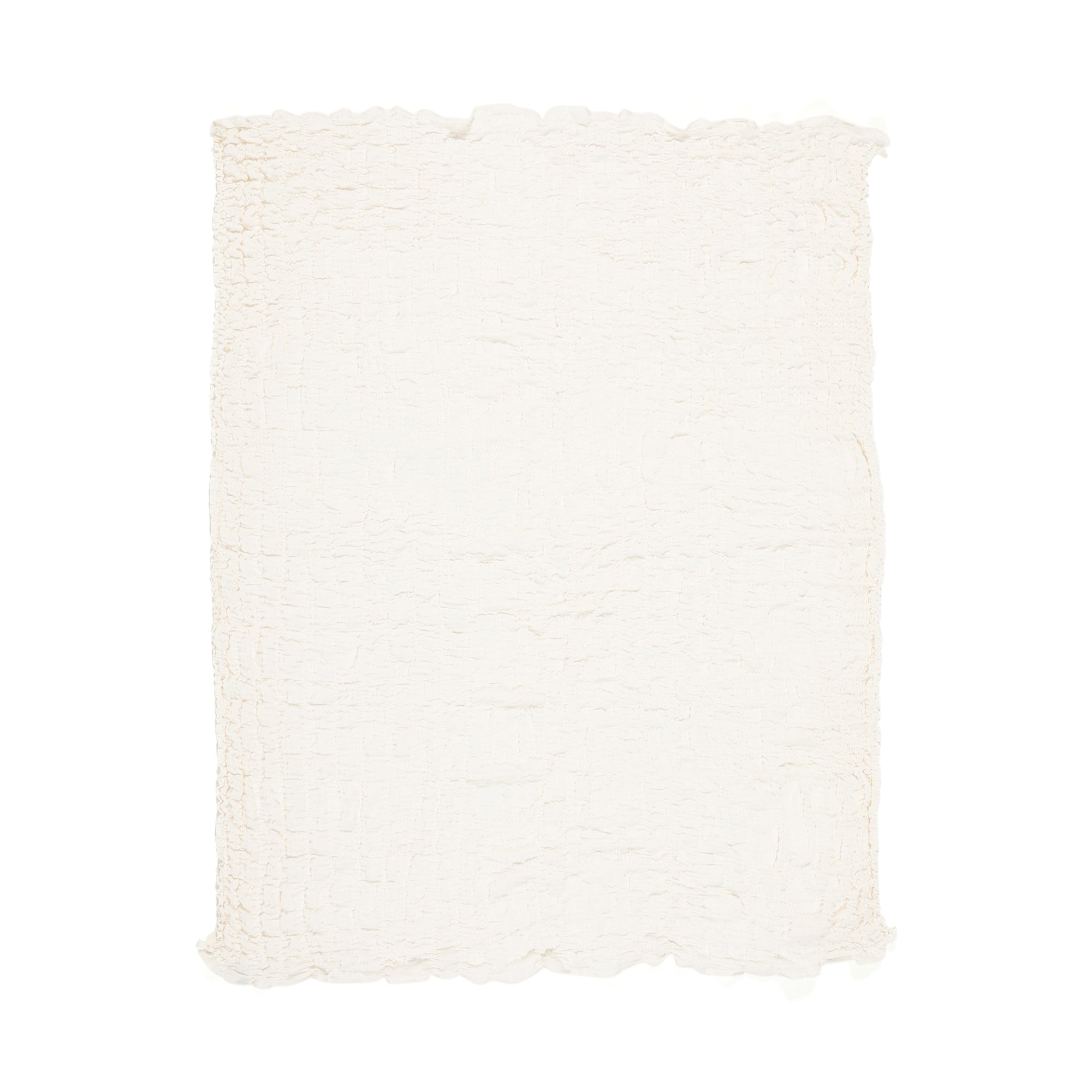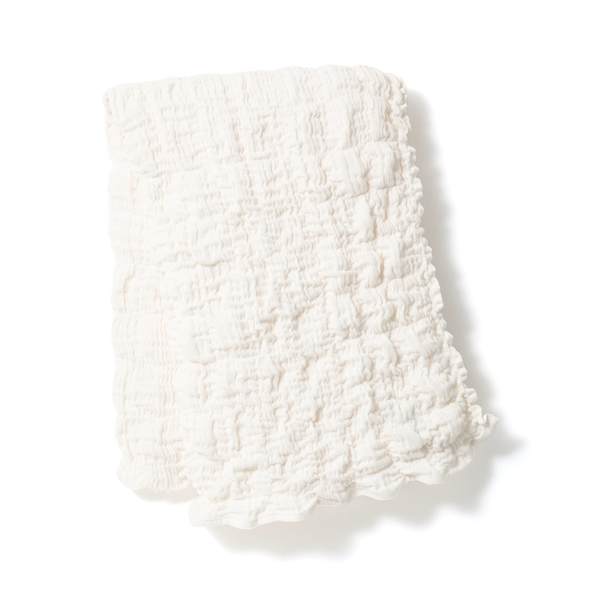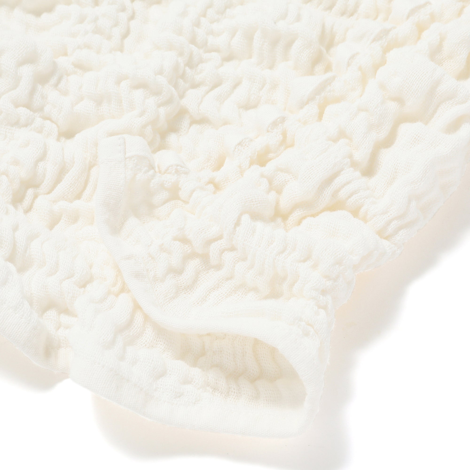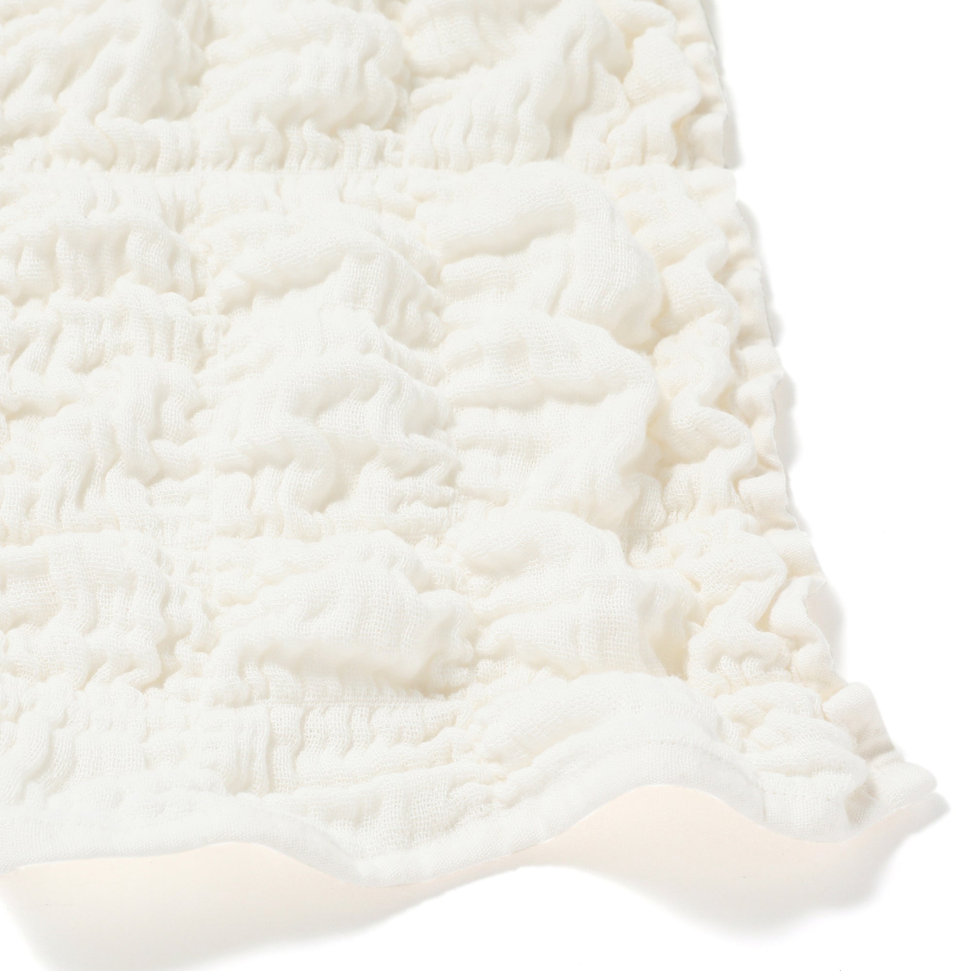 くしゅくしゅとした見た目がかわいらしいサマーブランケットです。伸縮性のある糸を織り込むことによって独特のくしゅくしゅとしたテクスチャーを表現しています。肌離れがよく、ムレを逃がしやすい、気持ちのいい肌ざわりに仕上げました。おうちで洗濯ができるのも嬉しいポイント。3色展開なのでお部屋のテイストに合わせてお選びいただけます。