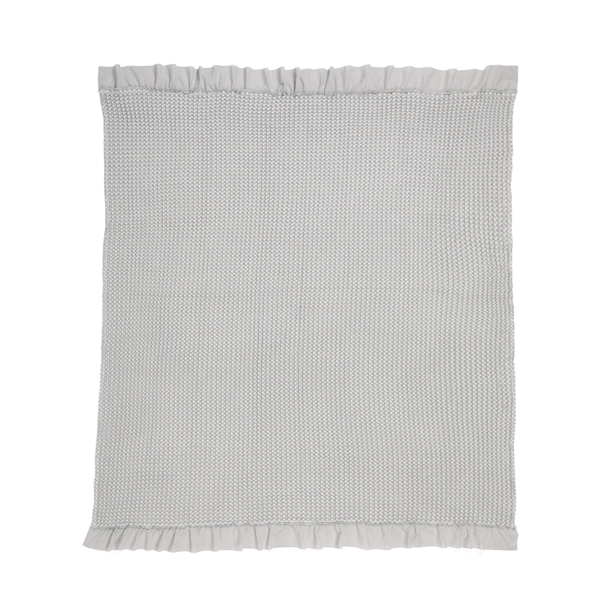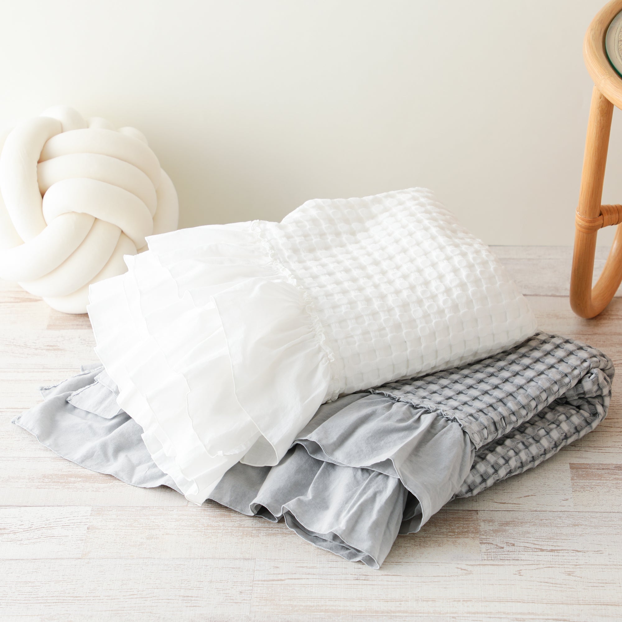 表情豊かなワッフル織りのブランケットです。大きめのワッフルと両端にあしらったフリルがガーリーなポイントです。レーヨンを混ぜることでしっとりなめらかな肌ざわりを実現しました。水洗い・クリーニング可能なので汗をかきやすい季節も清潔にお使いいただけます。