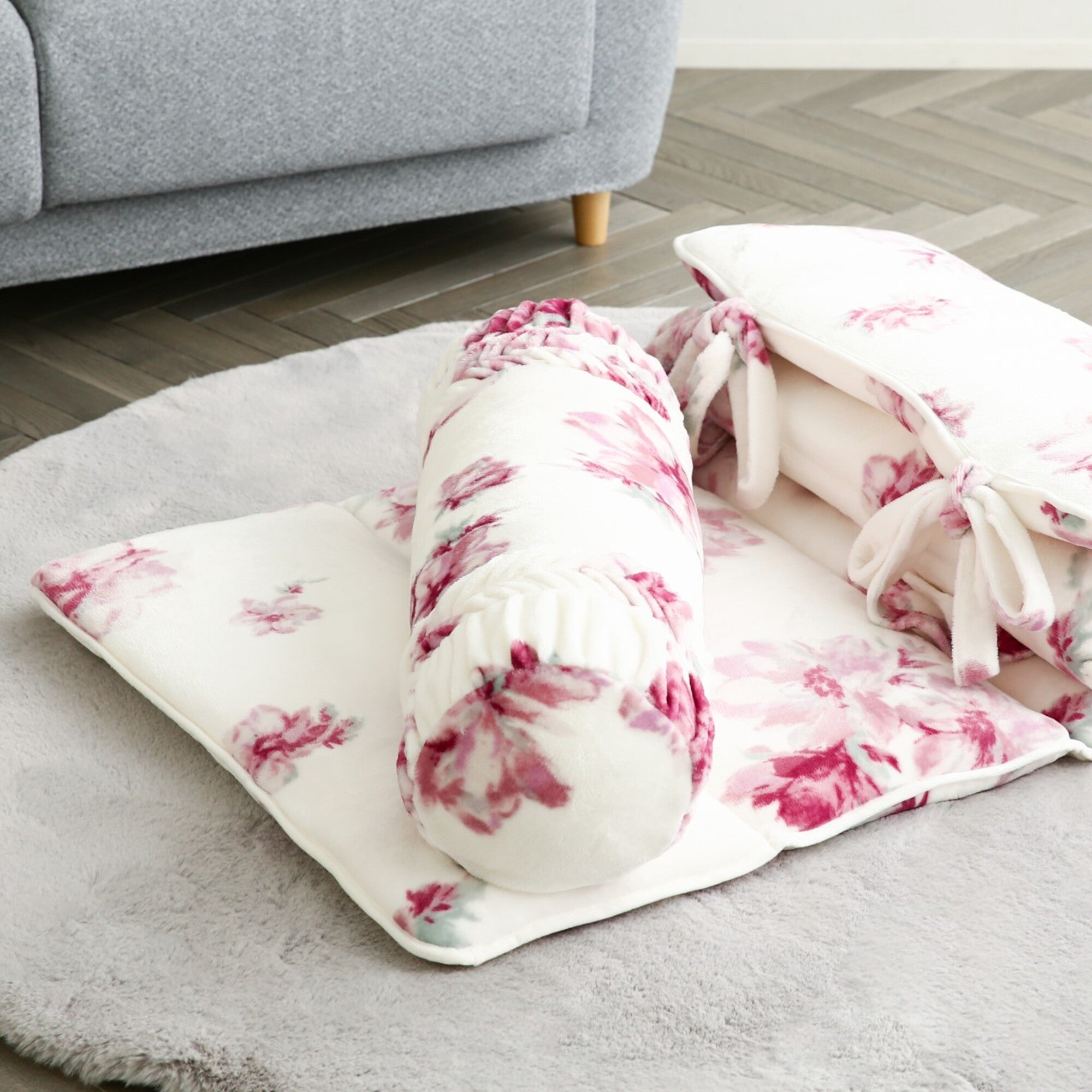 ふわふわふっくらで気持ちいい、水彩調の花柄が柔らかなごろ寝マットです。中綿にはふわふわのマイクロ綿をふんだんに使用し、気持ちのよい肌触り。中綿の真ん中には固綿を採用、ふっくらとした厚みがあり床で使用しても底付き感なく快適に使用できます。肌に触れる表・裏面にはベルベット調の肌触りがなめらかであたたかいマイクロファイバー生地を使用。どちらの面も気持ちいい肌触りなので、シーンに合わせて折りたたんで使用するのもおすすめです。リボン付きで折りたたみ可能なので、ご使用後簡単に折りたたんでコンパクトに収納できます。手洗いできるのでいつでも清潔を保てるのも嬉しいポイント。ふんわり軽くて暖かい。マイクロファイバー寝具で快適な寝心地。Francfrancのマイクロファイバー寝具は、超極細繊維できめが細かく、ソフトで滑らかな肌触り。繊維と繊維の間に空気を溜め込み、体温を逃がさず暖かさを保ちます。保湿性にも優れた生地は布団に入った時のヒヤっと感を軽減させ、快適な入眠をサポート。