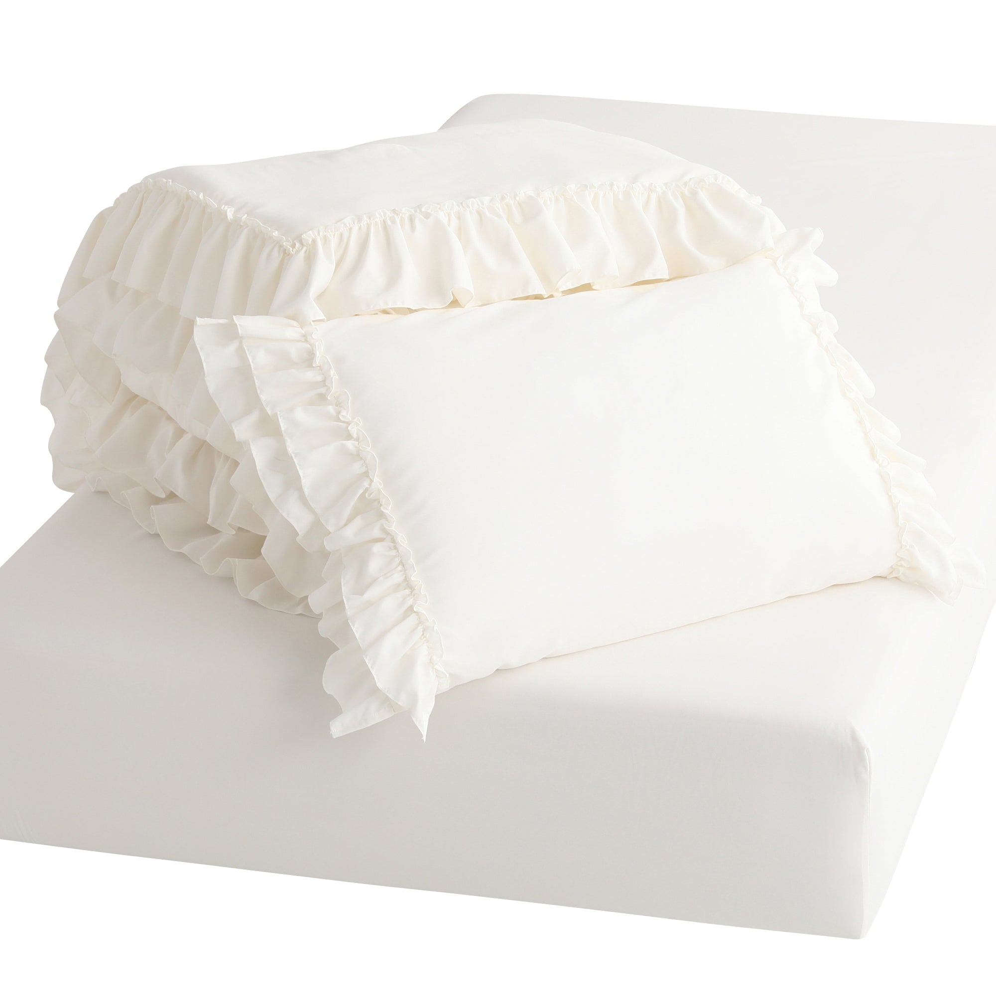 すぐ使えてお手入れ簡単!寝具4点セットまくら・まくらカバー・掛け布団・ボックスシーツの寝具4点セットです。新生活に必要なアイテムがすべて揃ったスターターセットだから、箱から出したらすぐに使えます。ベッドルームは一日の1/3を過ごす大切な空間。気分の上がるベッドリネンをお手頃プライスで揃えて、気持ちよく新生活を始めましょう。すぐ使えてお手入れ簡単掛け布団は中材と一体型なのでカバーを取り付ける必要がありません。布団とカバーがずれる不快感や面倒なカバーの着け外しから解放してくれます。ボックスシーツはベーシックなゴムタイプでベッドマットレスにかぶせるだけ。ベッドメイキングもらくらく簡単です。丸洗い・抗菌・防臭機能付き抗菌防臭加工のある生地と中わたを使用しているので、繊維上の菌の増殖を抑制でき長く清潔にご使用いただけます。また、全てのアイテムは自宅で丸洗い可。枕だって手洗いOKです。いつでも清潔な状態を保つことができるので汗ばむ季節も安心。オールシーズン活躍します。お部屋に合わせやすいエレガントなデザインくすみカラーが可愛いピンクと上品で落ち着いた雰囲気を演出するグレー、お部屋が明るくなる新色ホワイトの3色をご用意しました。掛け布団の3辺にはたっぷりとフリルをあしらい、シンプルなボックスシーツを優雅に包み込む仕様に。枕の両サイドにもフリルを施してどこから見ても絵になる完成度の高いデザインに仕上げました。どんなインテリアとも合わせやすく、テクニックいらずでシンプルでかわいいコーディネートが完成します。