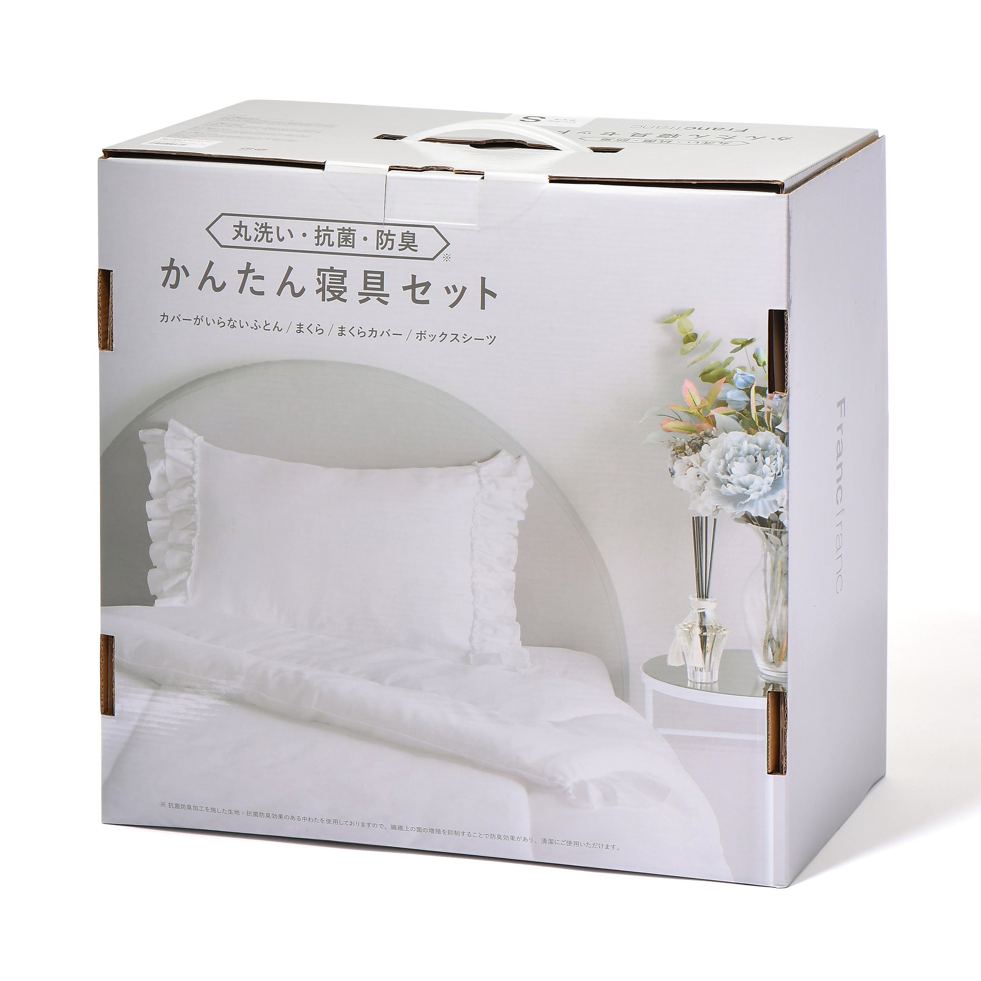 すぐ使えてお手入れ簡単!寝具4点セットまくら・まくらカバー・掛け布団・ボックスシーツの寝具4点セットです。新生活に必要なアイテムがすべて揃ったスターターセットだから、箱から出したらすぐに使えます。ベッドルームは一日の1/3を過ごす大切な空間。気分の上がるベッドリネンをお手頃プライスで揃えて、気持ちよく新生活を始めましょう。すぐ使えてお手入れ簡単掛け布団は中材と一体型なのでカバーを取り付ける必要がありません。布団とカバーがずれる不快感や面倒なカバーの着け外しから解放してくれます。ボックスシーツはベーシックなゴムタイプでベッドマットレスにかぶせるだけ。ベッドメイキングもらくらく簡単です。丸洗い・抗菌・防臭機能付き抗菌防臭加工のある生地と中わたを使用しているので、繊維上の菌の増殖を抑制でき長く清潔にご使用いただけます。また、全てのアイテムは自宅で丸洗い可。枕だって手洗いOKです。いつでも清潔な状態を保つことができるので汗ばむ季節も安心。オールシーズン活躍します。お部屋に合わせやすいエレガントなデザインくすみカラーが可愛いピンクと上品で落ち着いた雰囲気を演出するグレー、お部屋が明るくなる新色ホワイトの3色をご用意しました。掛け布団の3辺にはたっぷりとフリルをあしらい、シンプルなボックスシーツを優雅に包み込む仕様に。枕の両サイドにもフリルを施してどこから見ても絵になる完成度の高いデザインに仕上げました。どんなインテリアとも合わせやすく、テクニックいらずでシンプルでかわいいコーディネートが完成します。
