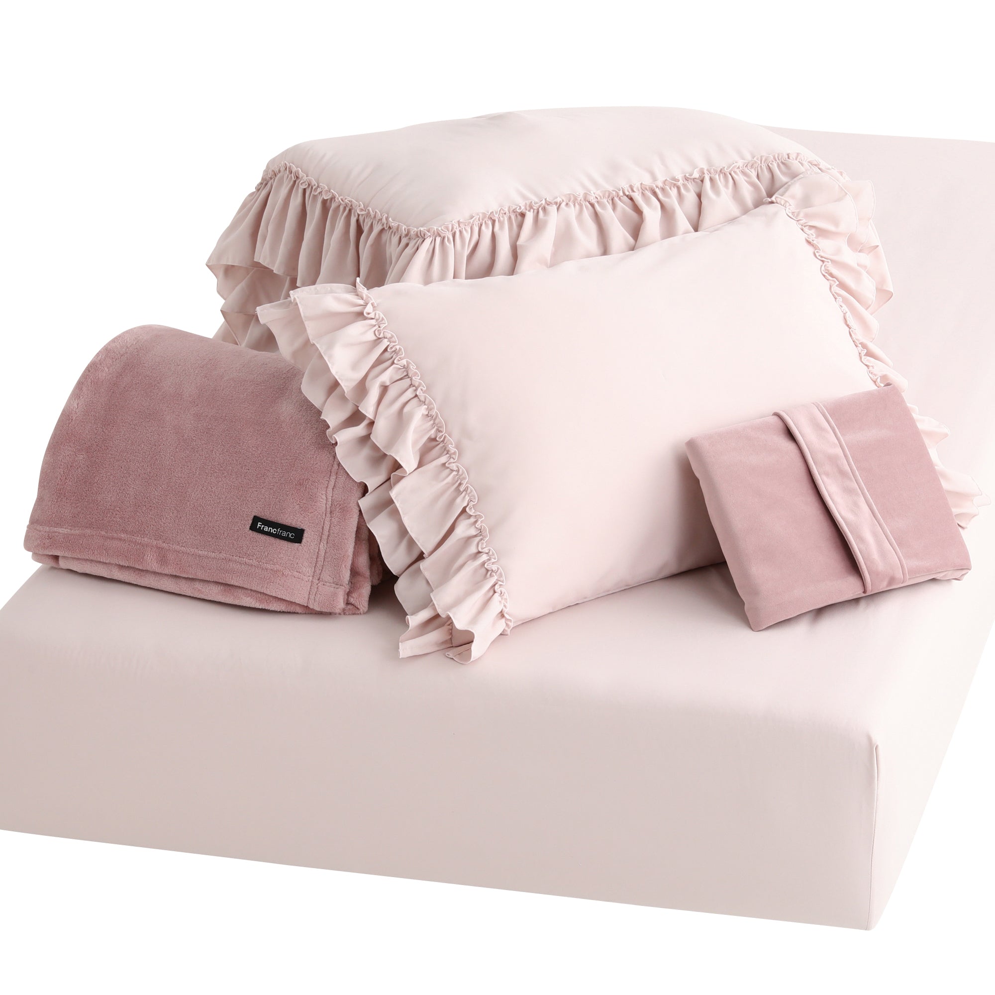 さらに充実!寝具6点セット人気の「かんたん寝具セット」がさらにお得なセットになって新登場。すぐ使えてお手入れ簡単なまくら・まくらカバー・掛け布団・ボックスシーツの寝具4点セットに、ふとん収納ケースとブランケットをプラスしました。新生活に必要なアイテムがすべて揃ったスターターセットだから、箱から出したらすぐに使えます。ベッドルームは一日の1/3を過ごす大切な空間。気分の上がるベッドリネンをお手頃プライスで揃えて、気持ちよく新生活を始めましょう。すぐ使えてお手入れ簡単掛け布団は中材と一体型なのでカバーを取り付ける必要がありません。布団とカバーがずれる不快感や面倒なカバーの着け外しから解放してくれます。ボックスシーツはベーシックなゴムタイプでベッドマットレスにかぶせるだけ。ベッドメイキングもらくらく簡単です。新生活を始める方にぴったりな、シングルサイズとセミダブルサイズをご用意しています。ふんわりとした手触りが心地よいブランケット。一枚あると季節の変わり目にも対応できるお役立ちアイテムです。丸洗い・抗菌・防臭機能付き抗菌防臭加工のある生地と中わたを使用しているので、繊維上の菌の増殖を抑制でき長く清潔にご使用いただけます(※ブランケット・クッションになるふとん収納ケースは抗菌防臭加工の対象ではありません)。また、全てのアイテムは自宅で丸洗い可。枕だって手洗いOKです。いつでも清潔な状態を保つことができるので汗ばむ季節も安心。オールシーズン活躍します。お部屋に合わせやすいエレガントなデザインくすみカラーが可愛いピンクと上品で落ち着いた雰囲気を演出するグレー、お部屋が明るくなる新色ホワイトの3色をご用意しました。掛け布団の3辺にはたっぷりとフリルをあしらい、シンプルなボックスシーツを優雅に包み込む仕様に。枕の両サイドにもフリルを施してどこから見ても絵になる完成度の高いデザインに仕上げました。どんなインテリアとも合わせやすく、テクニックいらずでシンプルフェミニンなコーディネートが完成します。収納ケースがクッションに早変わりふとんを使わない時は付属のケースにすっきり収納できます。収納ケースには便利な取っ手付き。ふとんをたっぷり詰め込んでもらくらく持ち運べます。ふとんを入れたケースはクッションとして大活躍。インテリアにすんなりなじむから、もうふとんの収納スペースに悩む必要がありません。ひとり暮らしのお部屋にもうれしい便利アイテムです。