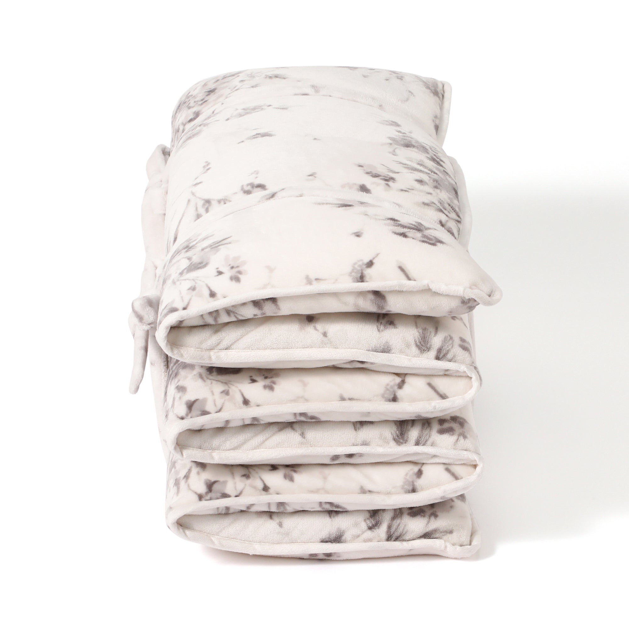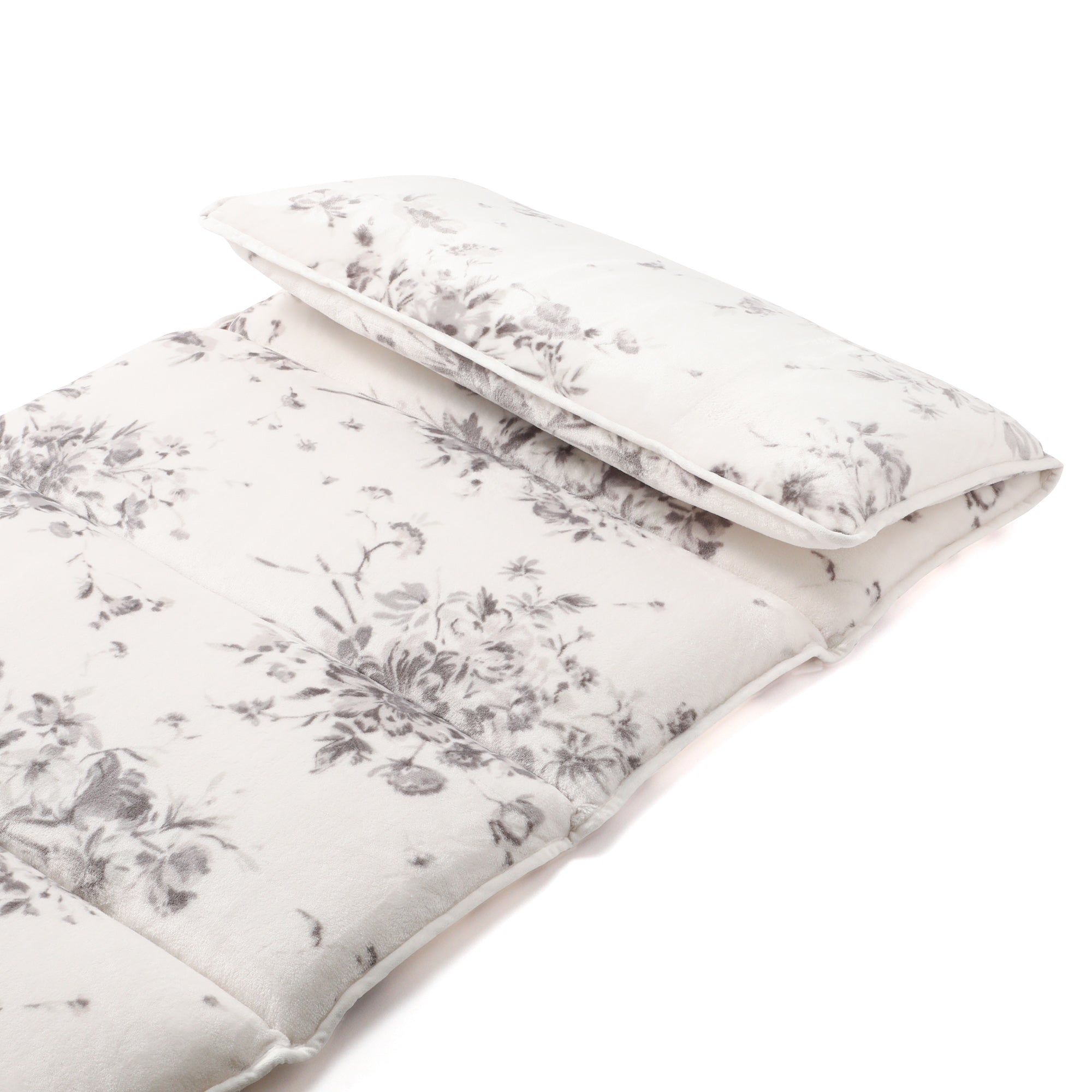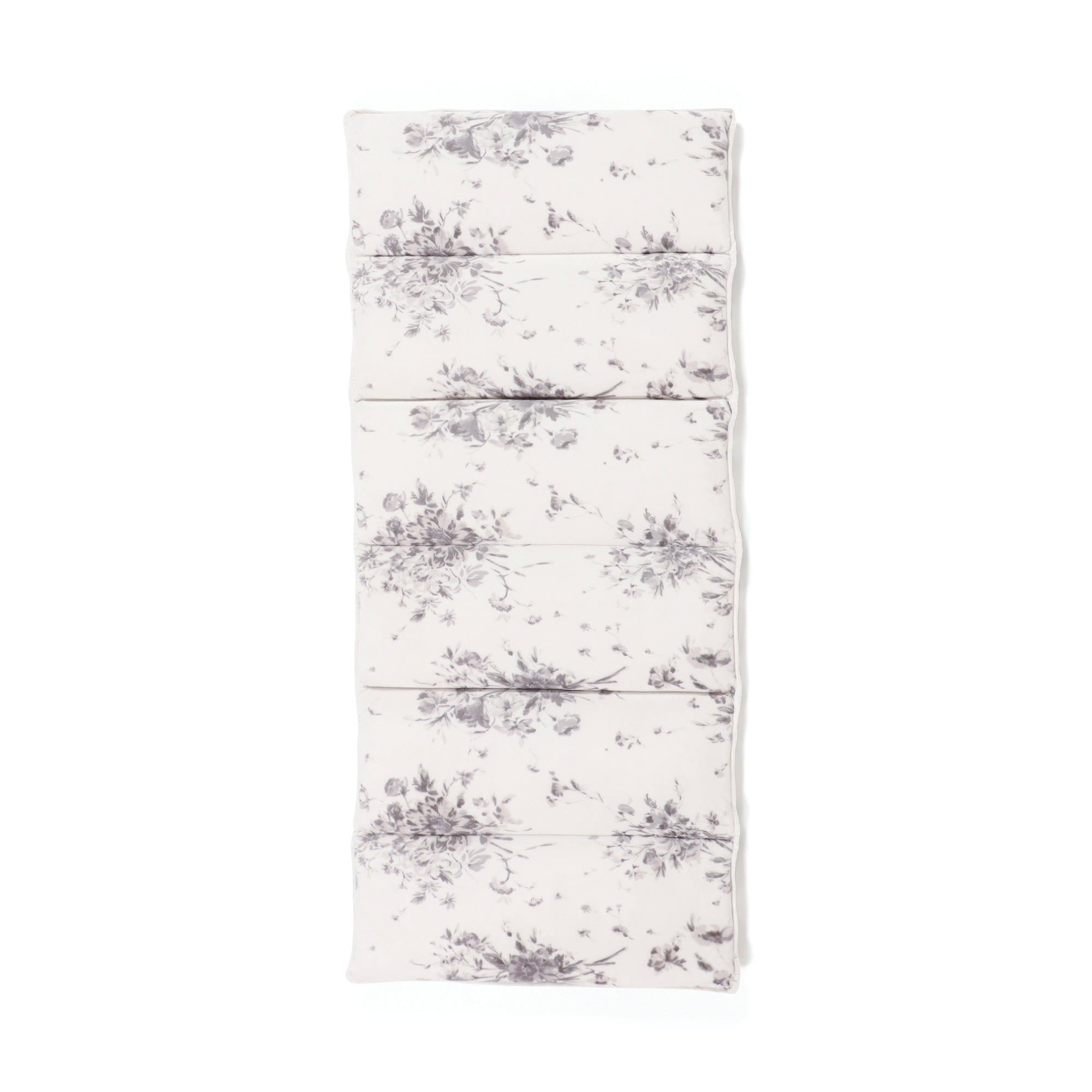ふわふわふっくらで気持ちいい柔らかなごろ寝マットです。 草花のブーケをモチーフに、甘すぎない大人可愛いデザインに仕上げました。 中綿にはふわふわのマイクロ綿をふんだんに使用し、気持ちのよい肌触り。中綿の真ん中には固綿を採用、ふっくらとした厚みがあり床で使用しても底付き感なく快適に使用できます。 肌に触れる表・裏面にはベルベット調の肌触りがなめらかであたたかいマイクロファイバー生地を使用。どちらの面も気持ちいい肌触りなので、シーンに合わせて折りたたんで使用するのもおすすめです。 リボン付きで折りたたみ可能なので、ご使用後簡単に折りたたんでコンパクトに収納できます。 手洗いできるのでいつでも清潔を保てるのも嬉しいポイント。