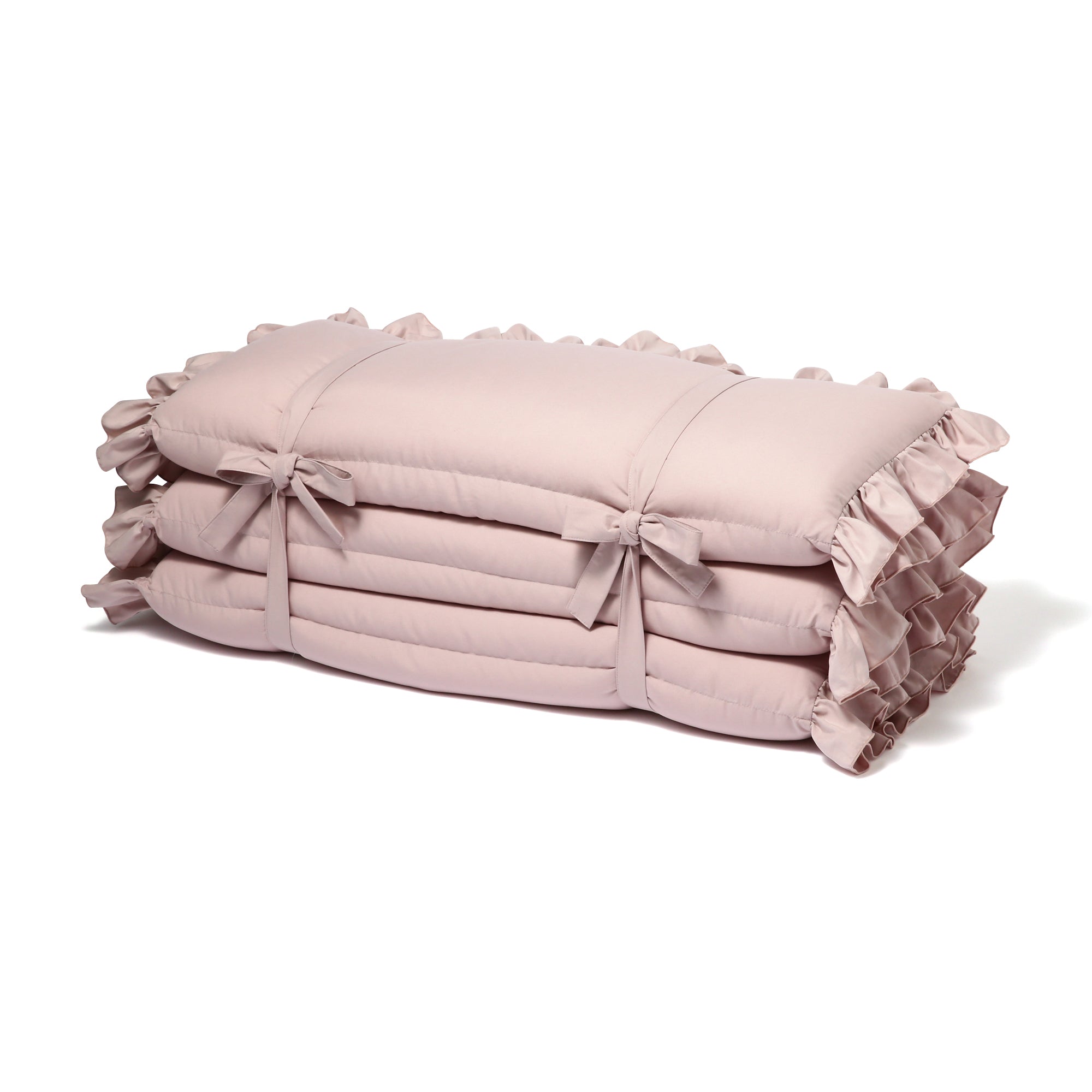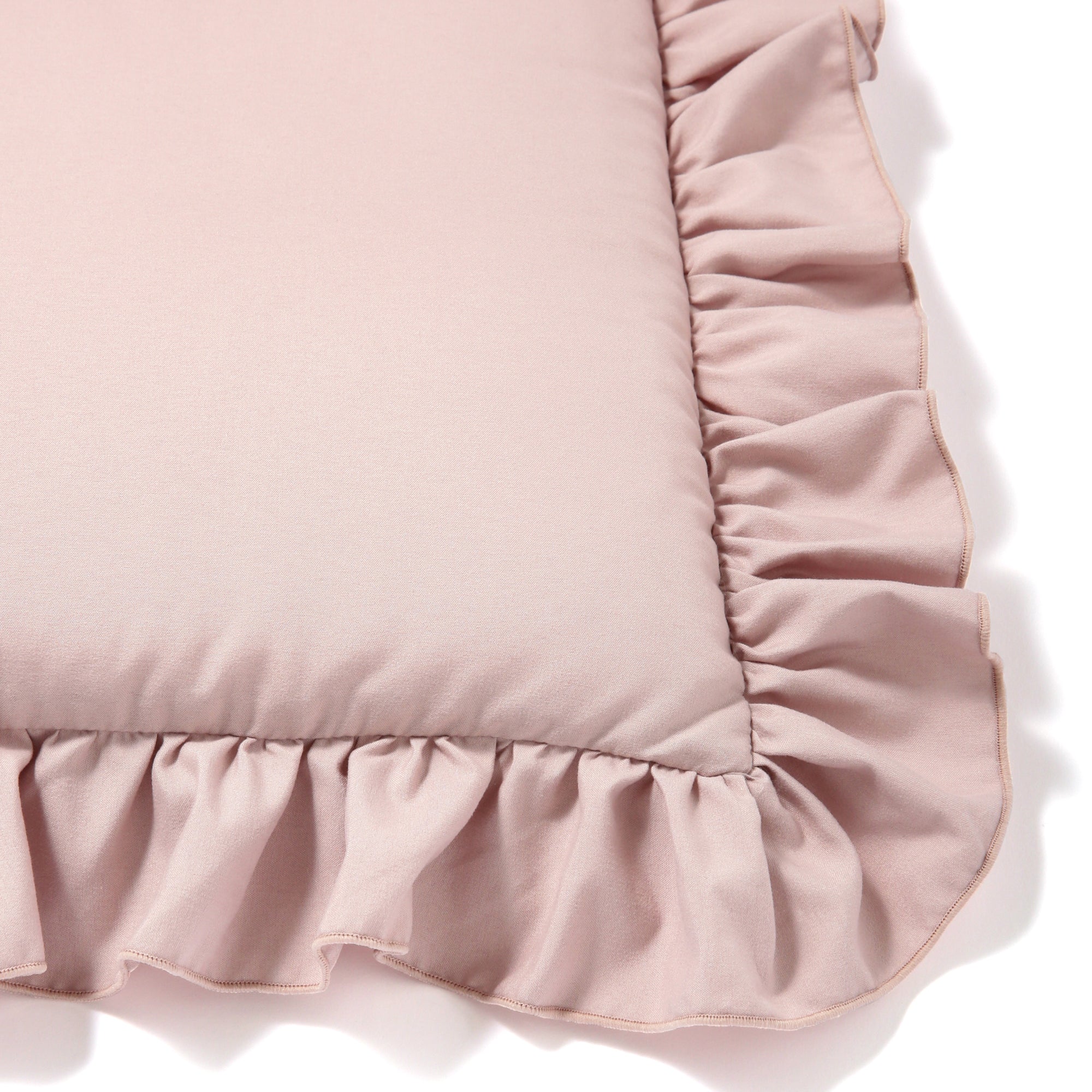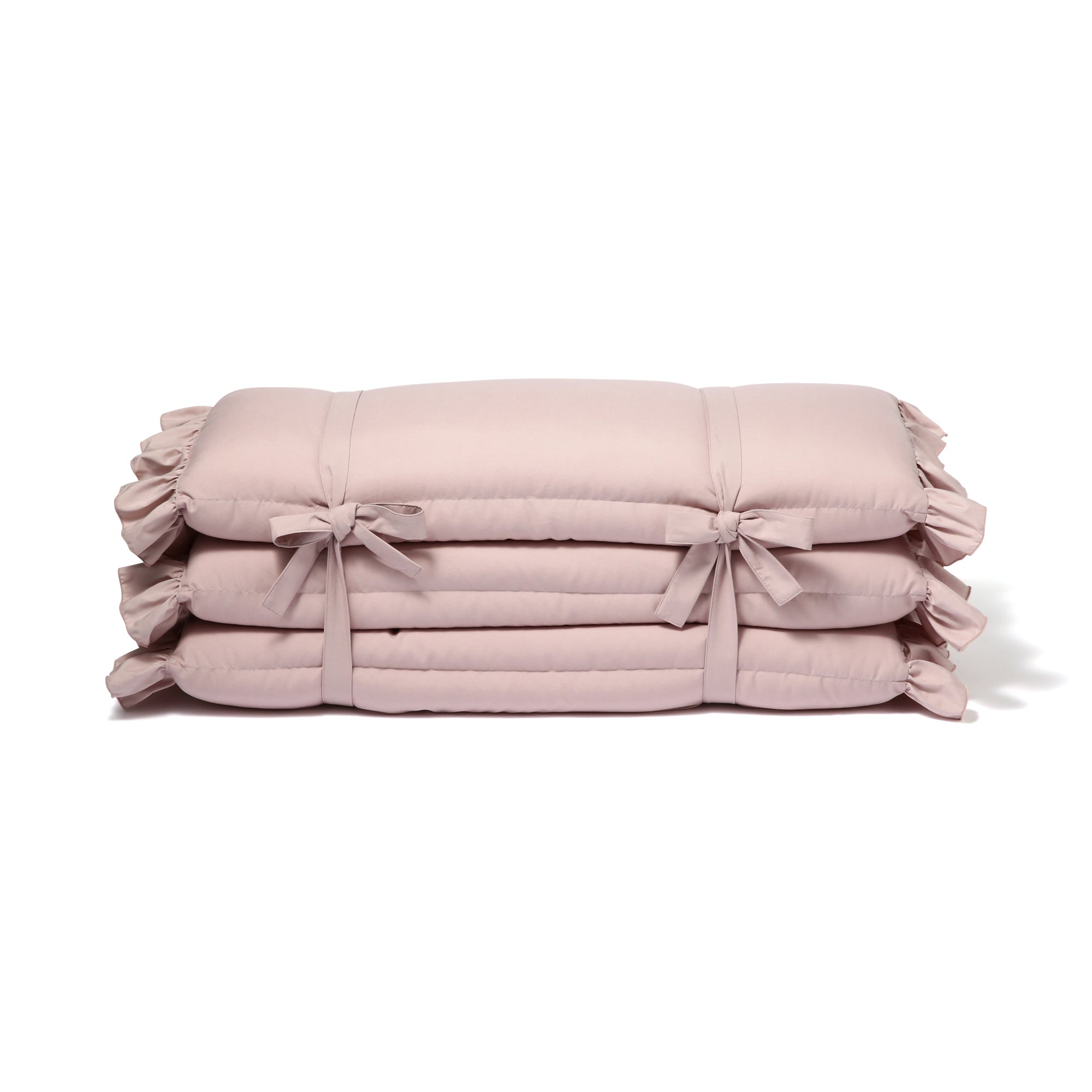 ふわふわふっくらで気持ちいい、季節を問わず使える素材感のごろ寝マットです。 お昼寝にぴったりなサイズで、周囲にたっぷりとフリルをあしらった可愛らしいデザイン。 広げると最大180cmのゆったりサイズでリラックスタイムがぐっと快適に、折りたためばソファやクッション代わりとしてマルチに活躍します。 中綿にはふわふわのマイクロ綿をふんだんに使用し、気持ちのよい肌触り。中綿の真ん中には固綿を採用、ふっくらとした厚みがあり床で使用しても底付き感なく快適に使用できます。 リボン付きで折りたたみ可能なので、ご使用後簡単に折りたたんでコンパクトに収納できます。 手洗いできるのでいつでも清潔を保てるのも嬉しいポイント。 これひとつで様々な使い方ができるから一人暮らしのお部屋に特におすすめです。