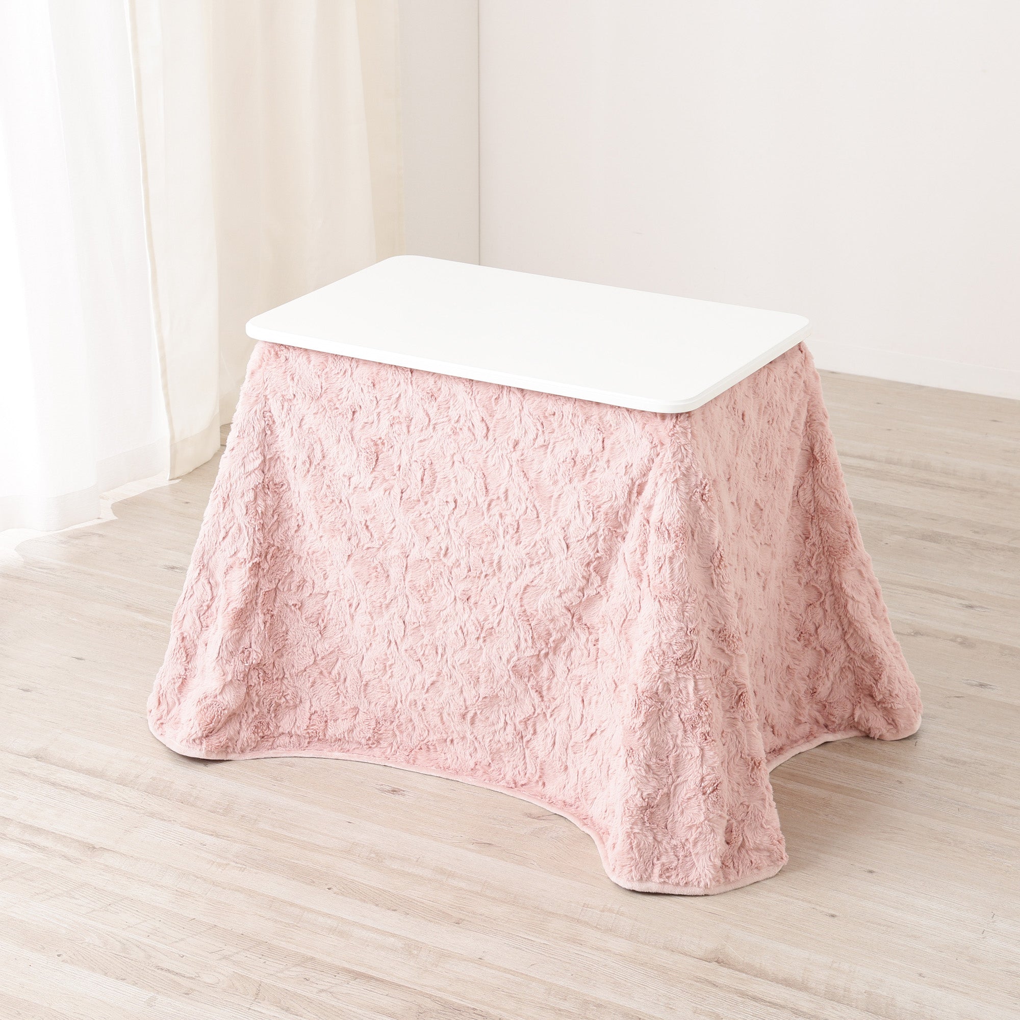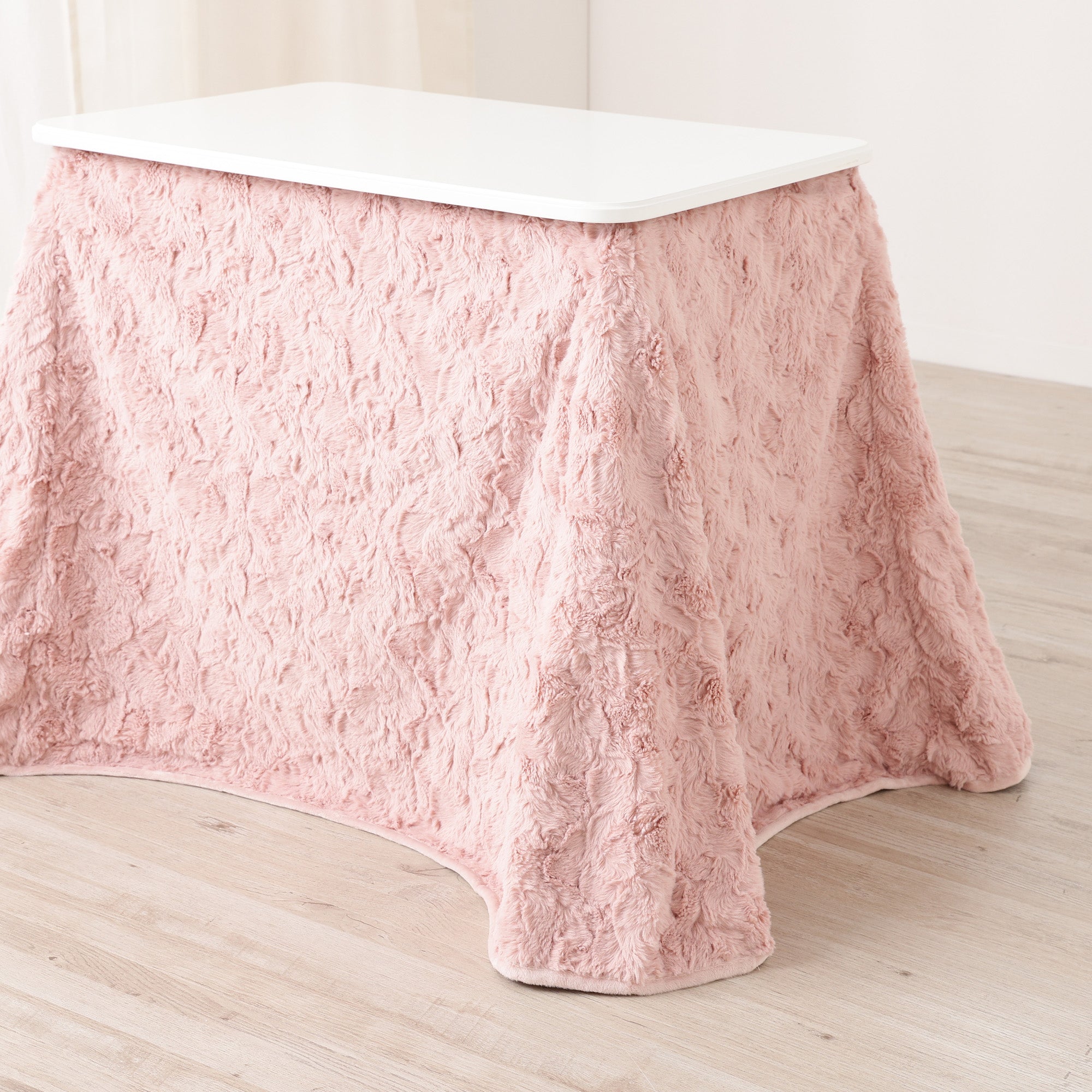 表面にファー生地、裏面にマイクロファイバー生地を使用したこたつデスク用の布団です。表面にファー生地を使用し、裏面は無地のマイクロファイバーを使用しているため、華やかでかわいらしいデザインのふわふわとした触感をお楽しみいただけます。無地でありながら、動きのあるファーがお部屋のコーディネートを華やかに演出します。