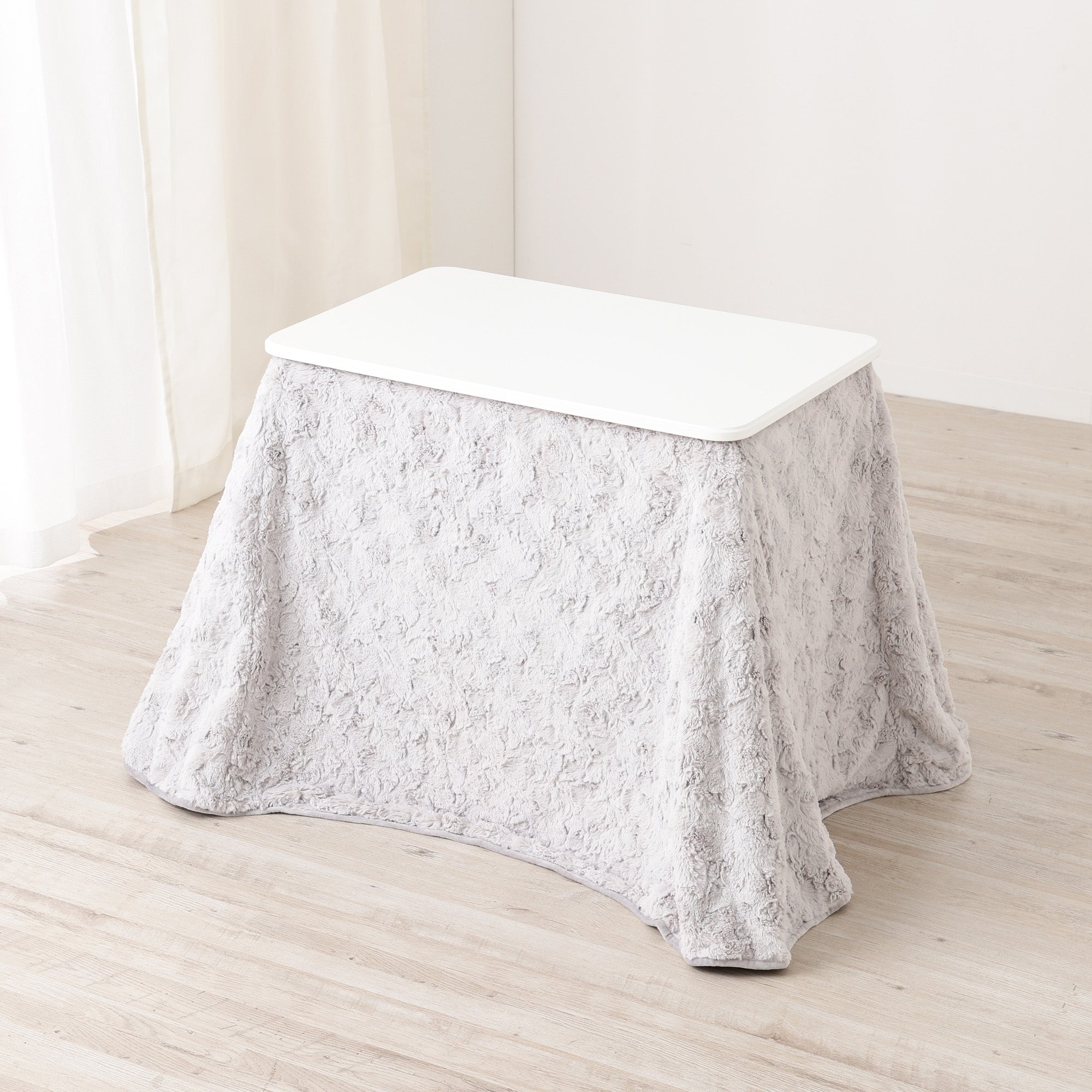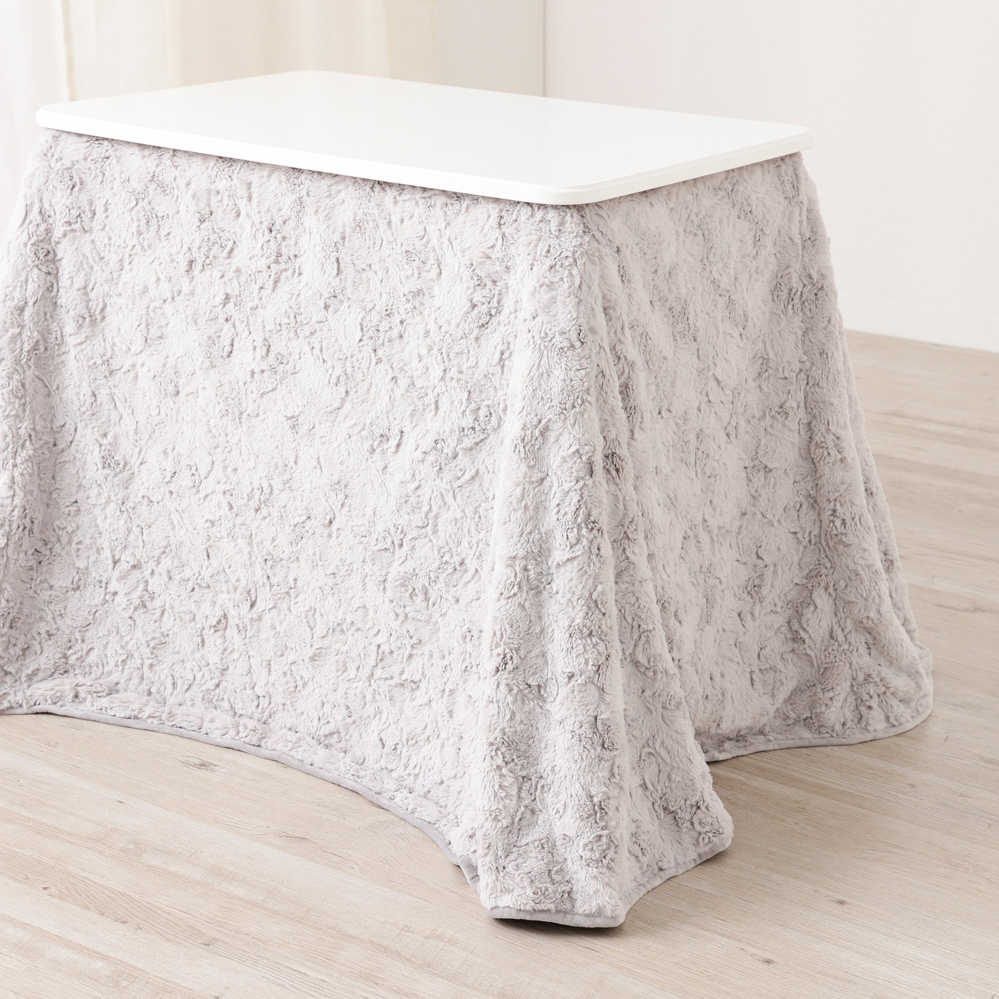 表面にファー生地、裏面にマイクロファイバー生地を使用したこたつデスク用の布団です。表面にファー生地を使用し、裏面は無地のマイクロファイバーを使用しているため、華やかでかわいらしいデザインのふわふわとした触感をお楽しみいただけます。無地でありながら、動きのあるファーがお部屋のコーディネートを華やかに演出します。