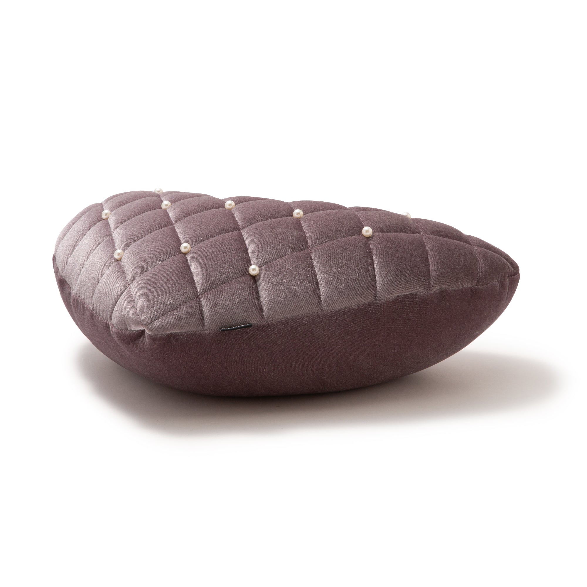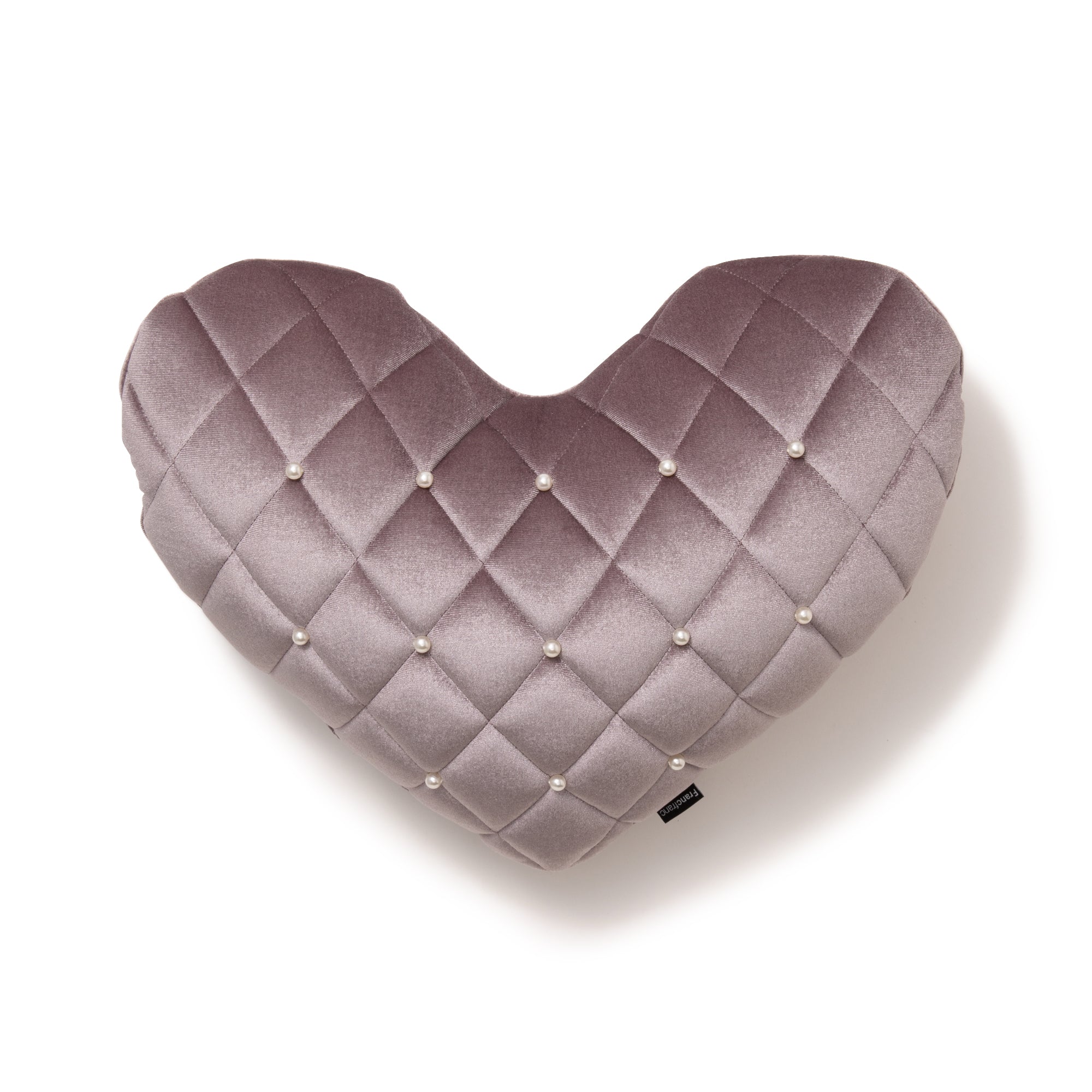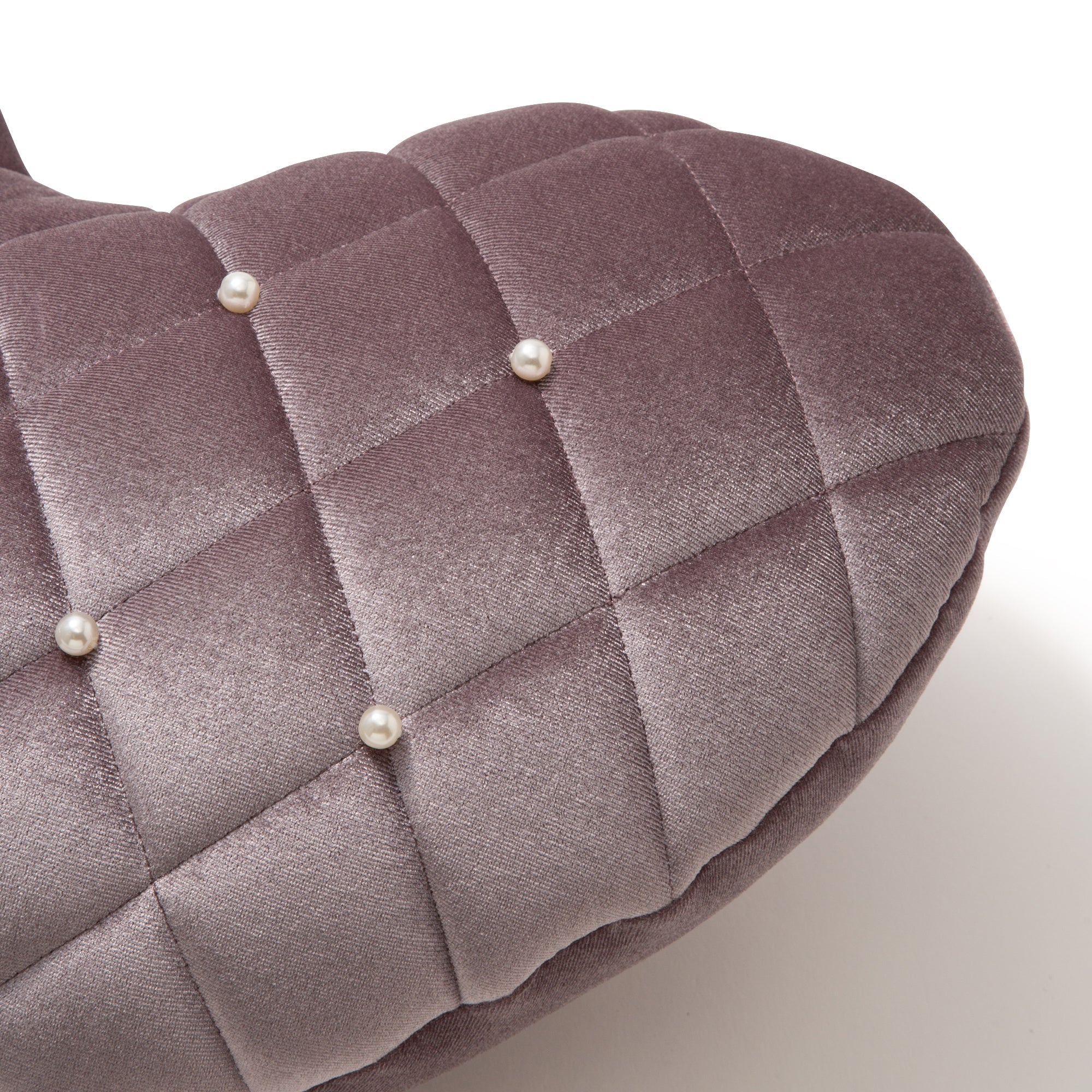 ダイヤ柄のつやつやなめらかなキルトにパールの装飾が上品な大人のハート型クッションです。光沢のあるポリエステルベルベットにパールを施すことで、ドレッシーな印象。組み合わせてたのしいベッドリネンはこちら>>>